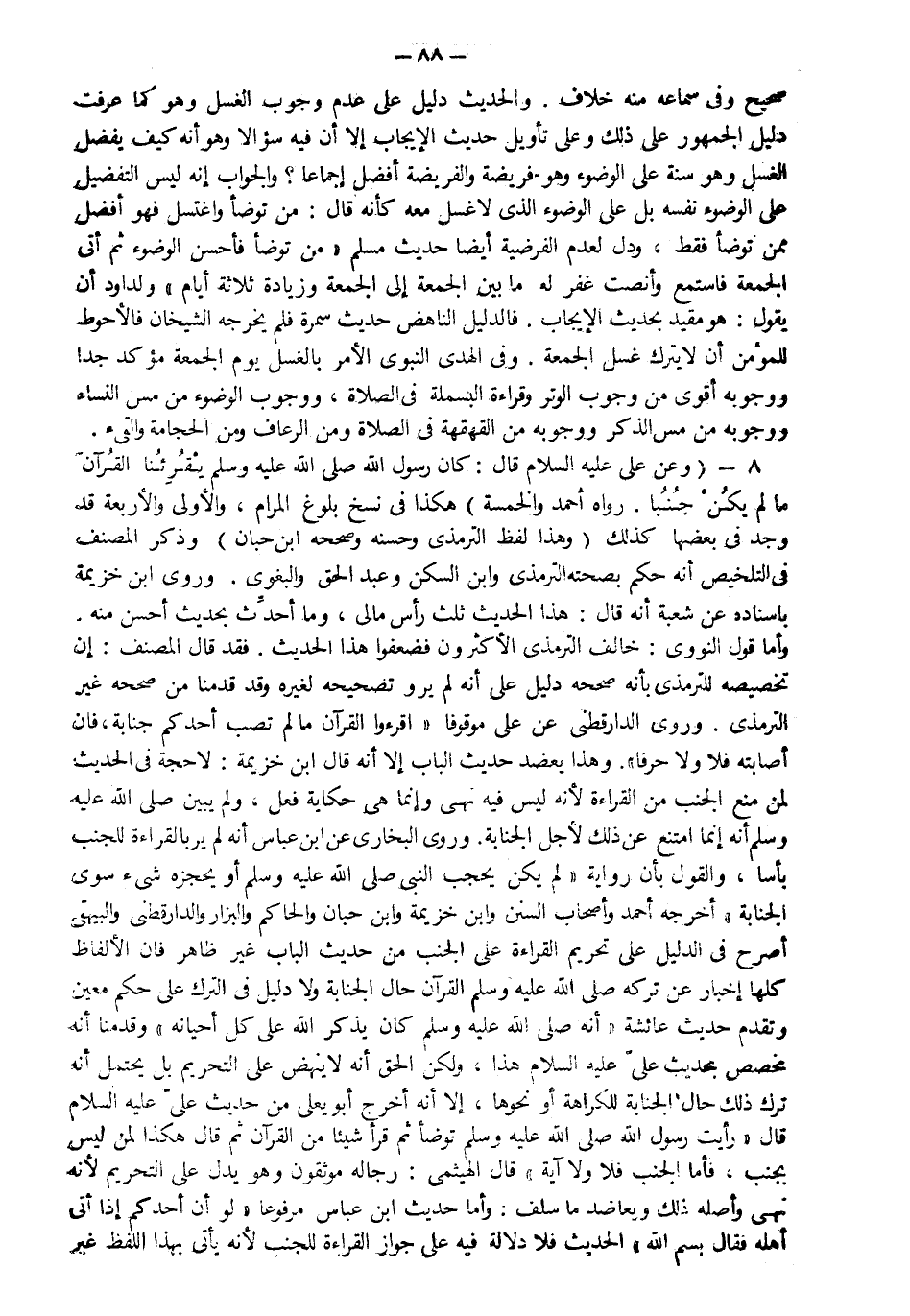 8- (وعن علي عليه السلام قال: كان رسول الله صَلّى الله عَلَيْهِ وَسَلّم يقرئنا القران ما لم يكن جُنُباً . رواه أحمد والخمسة).