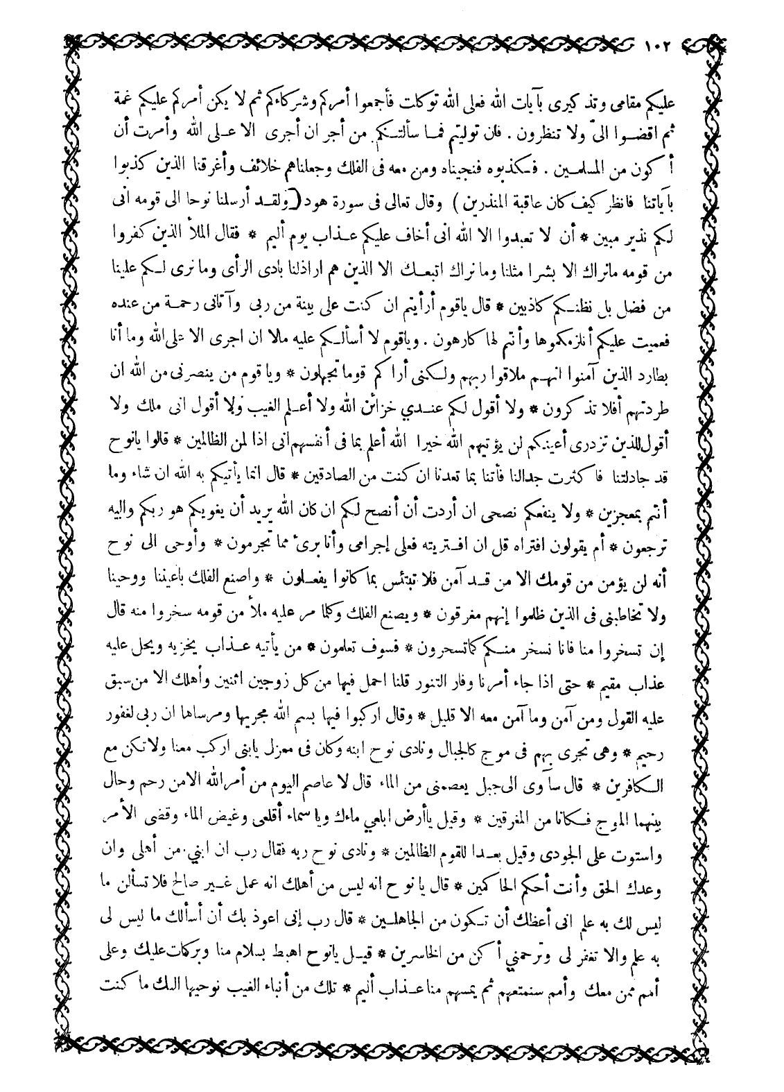 عَلَيْكُمْ مَقامِي وَتَذْكِيرِي بِآياتِ اللَّهِ فَعَلَى اللَّهِ تَوَكَّلْتُ فَأَجْمِعُوا أَمْرَكُمْ وَشُرَكاءَكُمْ ثُمَّ لَا يَكُنْ أَمْرُكُمْ عَلَيْكُمْ غُمَّةً ثُمَّ اقْضُوا إِلَيَّ وَلا تُنْظِرُونِ. فَإِنْ تَوَلَّيْتُمْ فَما سَأَلْتُكُمْ مِنْ أَجْرٍ إِنْ أَجْرِيَ إِلَّا عَلَى اللَّهِ وَأُمِرْتُ أَنْ أَكُونَ مِنَ الْمُسْلِمِينَ. فَكَذَّبُوهُ فَنَجَّيْناهُ وَمن مَعَهُ فِي الْفُلْكِ وَجَعَلْناهُمْ خَلائِفَ وَأَغْرَقْنَا الَّذِينَ كَذَّبُوا بِآياتِنا فَانْظُرْ كَيْفَ كانَ عاقِبَةُ الْمُنْذَرِينَ 10: 71- 73 وَقَالَ تَعَالَى فِي سُورَةِ هُودٍ وَلَقَدْ أَرْسَلْنا نُوحاً إِلى قَوْمِهِ إِنِّي لَكُمْ نَذِيرٌ مُبِينٌ أَنْ لَا تَعْبُدُوا إِلَّا اللَّهَ إِنِّي أَخافُ عَلَيْكُمْ عَذابَ يَوْمٍ أَلِيمٍ فَقالَ الْمَلَأُ الَّذِينَ كَفَرُوا مِنْ قَوْمِهِ مَا نَراكَ إِلَّا بَشَراً مِثْلَنا وَما نَراكَ اتَّبَعَكَ إِلَّا الَّذِينَ هُمْ أَراذِلُنا بادِيَ الرَّأْيِ وَما نَرى لَكُمْ عَلَيْنا من فَضْلٍ بَلْ نَظُنُّكُمْ كاذِبِينَ قَالَ يَا قَوْمِ أَرَأَيْتُمْ إِنْ كُنْتُ عَلى بَيِّنَةٍ مِنْ رَبِّي وَآتانِي رَحْمَةً مِنْ عِنْدِهِ فَعُمِّيَتْ عَلَيْكُمْ أَنُلْزِمُكُمُوها وَأَنْتُمْ لَها كارِهُونَ. وَيا قَوْمِ لا أَسْئَلُكُمْ عَلَيْهِ مَالًا إِنْ أَجرِيَ إِلَّا عَلَى اللَّهِ وَما أَنَا بِطارِدِ الَّذِينَ آمَنُوا إِنَّهُمْ مُلاقُوا رَبِّهِمْ وَلكِنِّي أَراكُمْ قَوْماً تَجْهَلُونَ وَيا قَوْمِ مَنْ يَنْصُرُنِي مِنَ اللَّهِ إِنْ طَرَدْتُهُمْ أَفَلا تَذَكَّرُونَ وَلا أَقُولُ لَكُمْ عِنْدِي خَزائِنُ اللَّهِ وَلا أَعْلَمُ الْغَيْبَ وَلا أَقُولُ إِنِّي مَلَكٌ وَلا أَقُولُ لِلَّذِينَ تَزْدَرِي أَعْيُنُكُمْ لَنْ يُؤْتِيَهُمُ اللَّهُ خَيْراً اللَّهُ أَعْلَمُ بِما فِي أَنْفُسِهِمْ إِنِّي إِذاً لَمِنَ الظَّالِمِينَ قالُوا يَا نُوحُ قَدْ جادَلْتَنا فَأَكْثَرْتَ جِدالَنا فَأْتِنا بِما تَعِدُنا إِنْ كُنْتَ مِنَ الصَّادِقِينَ قَالَ إِنَّما يَأْتِيكُمْ بِهِ اللَّهُ إِنْ شاءَ وَما أَنْتُمْ بِمُعْجِزِينَ وَلا يَنْفَعُكُمْ نُصْحِي إِنْ أَرَدْتُ أَنْ أَنْصَحَ لَكُمْ إِنْ كانَ اللَّهُ يُرِيدُ أَنْ يُغْوِيَكُمْ هُوَ رَبُّكُمْ وَإِلَيْهِ تُرْجَعُونَ أَمْ يَقُولُونَ افْتَراهُ قُلْ إِنِ افْتَرَيْتُهُ فَعَلَيَّ إِجْرامِي وَأَنَا بَرِيءٌ مِمَّا تُجْرِمُونَ وَأُوحِيَ إِلى نُوحٍ أَنَّهُ لَنْ يُؤْمِنَ مِنْ قَوْمِكَ إِلَّا مَنْ قَدْ آمَنَ فَلا تَبْتَئِسْ بِما كانُوا يَفْعَلُونَ وَاصْنَعِ الْفُلْكَ بِأَعْيُنِنا وَوَحْيِنا وَلا تُخاطِبْنِي فِي الَّذِينَ ظَلَمُوا إِنَّهُمْ مُغْرَقُونَ وَيَصْنَعُ الْفُلْكَ وَكُلَّما مَرَّ عَلَيْهِ مَلَأٌ مِنْ قَوْمِهِ سَخِرُوا مِنْهُ قَالَ إِنْ تَسْخَرُوا مِنَّا فَإِنَّا نَسْخَرُ مِنْكُمْ كَما تَسْخَرُونَ فَسَوْفَ تَعْلَمُونَ مَنْ يَأْتِيهِ عَذابٌ يُخْزِيهِ وَيَحِلُّ عَلَيْهِ عَذابٌ مُقِيمٌ حَتَّى إِذا جاءَ أَمْرُنا وَفارَ التَّنُّورُ قُلْنَا احْمِلْ فِيها مِنْ كُلٍّ زَوْجَيْنِ اثْنَيْنِ وَأَهْلَكَ إِلَّا مَنْ سَبَقَ عَلَيْهِ الْقَوْلُ وَمن آمَنَ وَما آمَنَ مَعَهُ إِلَّا قَلِيلٌ وَقال ارْكَبُوا فِيها بِسْمِ اللَّهِ مَجْراها وَمُرْساها إِنَّ رَبِّي لَغَفُورٌ رَحِيمٌ وَهِيَ تَجْرِي بِهِمْ فِي مَوْجٍ كَالْجِبالِ وَنادى نُوحٌ ابْنَهُ وَكانَ فِي مَعْزِلٍ يَا بُنَيَّ ارْكَبْ مَعَنا وَلا تَكُنْ مَعَ الْكافِرِينَ قَالَ سَآوِي إِلى جَبَلٍ يَعْصِمُنِي مِنَ الْماءِ قَالَ لَا عاصِمَ الْيَوْمَ مِنْ أَمْرِ اللَّهِ إِلَّا مَنْ رَحِمَ وَحالَ بَيْنَهُمَا الْمَوْجُ فَكانَ من الْمُغْرَقِينَ وَقِيلَ يا أَرْضُ ابْلَعِي ماءَكِ وَيا سَماءُ أَقْلِعِي وَغِيضَ الْماءُ وَقُضِيَ الْأَمْرُ وَاسْتَوَتْ عَل