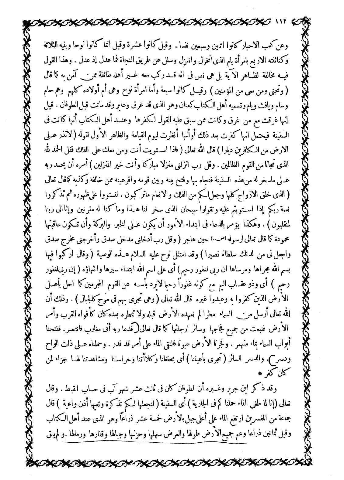 وَعَنْ كَعْبِ الْأَحْبَارِ كَانُوا اثْنَيْنِ وَسَبْعِينَ نَفْسًا. وَقِيلَ كَانُوا عَشَرَةً وَقِيلَ إِنَّمَا كَانُوا نُوحًا وبنيه الثلاثة وكنائنته الأربع بامرأة يام الّذي انخزل وانعزل وسلل عن طَرِيقِ النَّجَاةِ فَمَا عَدَلَ إِذْ عَدَلَ. وَهَذَا الْقَوْلُ فِيهِ مُخَالَفَةٌ لِظَاهِرِ الْآيَةِ بَلْ هِيَ نص في انه قد ركب معه غَيْرِ أَهْلِهِ طَائِفَةٌ مِمَّنْ آمَنَ بِهِ كَمَا قال (وَنَجِّنِي وَمن مَعِيَ من الْمُؤْمِنِينَ) 26: 118 وَقِيلَ كَانُوا سَبْعَةً وَأَمَّا امْرَأَةُ نُوحٍ وَهِيَ أَمُّ أَوْلَادِهِ كُلِّهِمْ وَهُمْ حَامٌ وِسَامٌ وَيَافِثُ ويام وتسميه أهل الكتاب كعنان وهو الّذي قد غرق وعابر وقد ماتت قَبْلَ الطُّوفَانِ. قِيلَ إِنَّهَا غَرِقَتْ مَعَ مَنْ غَرِقَ وَكَانَتْ مِمَّنْ سَبَقَ عَلَيْهِ الْقَوْلُ لِكُفْرِهَا وَعِنْدَ أَهْلِ الْكِتَابِ أَنَّهَا كَانَتْ فِي السَّفِينَةِ فَيُحْتَمَلُ أَنَّهَا كَفَرَتْ بَعْدَ ذَلِكَ أَوْ أَنَّهَا أُنْظِرَتْ لِيَوْمِ الْقِيَامَةِ وَالظَّاهِرُ الْأَوَّلُ لِقَوْلِهِ (لَا تَذَرْ عَلَى الْأَرْضِ مِنَ الْكافِرِينَ دَيَّاراً) 71: 26 قَالَ اللَّهُ تَعَالَى فَإِذَا اسْتَوَيْتَ أَنْتَ وَمن مَعَكَ عَلَى الْفُلْكِ فَقُلِ الْحَمْدُ لِلَّهِ الَّذِي نَجَّانا مِنَ الْقَوْمِ الظَّالِمِينَ. وَقُلْ رَبِّ أَنْزِلْنِي مُنْزَلًا مُبارَكاً وَأَنْتَ خَيْرُ الْمُنْزِلِينَ 23: 28- 29 أمره أن يحمد ربه على ما سخر له من هذه السفينة فنجاه بها وفتح بينه وبين قومه وأقر عينه ممن خالفه وكذبه كما قال تعالى الَّذِي خَلَقَ الْأَزْواجَ كُلَّها وَجَعَلَ لَكُمْ من الْفُلْكِ وَالْأَنْعامِ ما تَرْكَبُونَ. لِتَسْتَوُوا عَلى ظُهُورِهِ ثُمَّ تَذْكُرُوا نِعْمَةَ رَبِّكُمْ إِذَا اسْتَوَيْتُمْ عَلَيْهِ وَتَقُولُوا سُبْحانَ الَّذِي سَخَّرَ لَنا هذا وَما كُنَّا لَهُ مُقْرِنِينَ وَإِنَّا إِلى رَبِّنا لَمُنْقَلِبُونَ) 43: 12- 14. وَهَكَذَا يُؤْمَرُ بِالدُّعَاءِ فِي ابْتِدَاءِ الْأُمُورِ أَنْ يَكُونَ عَلَى الْخَيْرِ وَالْبَرَكَةِ وَأَنْ تَكُونَ عَاقِبَتُهَا مَحْمُودَةٌ كَمَا قَالَ تَعَالَى لِرَسُولِهِ صَلَّى اللَّهُ عَلَيْهِ وَسَلَّمَ حِينَ هَاجَرَ وَقُلْ رَبِّ أَدْخِلْنِي مُدْخَلَ صِدْقٍ وَأَخْرِجْنِي مُخْرَجَ صِدْقٍ وَاجْعَلْ لِي مِنْ لَدُنْكَ سُلْطاناً نَصِيراً 17: 80 وَقَدِ امْتَثَلَ نُوحٌ عَلَيْهِ السَّلَامُ هَذِهِ الْوَصِيَّةَ وَقال ارْكَبُوا فِيها بِسْمِ اللَّهِ مَجْراها وَمُرْساها إِنَّ رَبِّي لَغَفُورٌ رَحِيمٌ 11: 41 أَيْ عَلَى اسْمِ اللَّهِ ابْتِدَاءُ سَيْرِهَا وَانْتِهَاؤُهُ (إِنَّ رَبِّي لَغَفُورٌ رَحِيمٌ) 11: 41 أَيْ وَذُو عِقَابٍ أَلِيمٍ مَعَ كَوْنِهِ غَفُورًا رَحِيمًا لَا يُرَدُّ بَأْسُهُ عَنِ الْقَوْمِ الْمُجْرِمِينَ كَمَا أَحَلَّ بِأَهْلِ الْأَرْضِ الَّذِينَ كَفَرُوا بِهِ وَعَبَدُوا غَيْرَهُ قَالَ اللَّهُ تَعَالَى وَهِيَ تَجْرِي بِهِمْ في مَوْجٍ كَالْجِبالِ 11: 42. وَذَلِكَ أَنَّ اللَّهَ تَعَالَى أَرْسَلَ مِنَ السَّمَاءِ مَطَرًا لَمْ تَعْهَدْهُ الْأَرْضُ قَبْلَهُ وَلَا تُمْطِرْهُ بَعْدَهُ كَانَ كَأَفْوَاهِ الْقِرَبِ وَأَمَرَ الْأَرْضَ فَنَبَعَتْ مِنْ جَمِيعِ فِجَاجِهَا وَسَائِرِ أَرْجَائِهَا كَمَا قَالَ تَعَالَى فَدَعا رَبَّهُ أَنِّي مَغْلُوبٌ فَانْتَصِرْ. فَفَتَحْنا أَبْوابَ السَّماءِ بِماءٍ مُنْهَمِرٍ. وَفَجَّرْنَا الْأَرْضَ عُيُوناً فَالْتَقَى الْماءُ عَلى أَمْرٍ قَدْ قُدِرَ. وَحَمَلْناهُ عَلى ذاتِ أَلْواحٍ وَدُسُرٍ 54: 10- 13. والدسر السائر (تَجْرِي بِأَعْيُنِنا) 54: 14 أَيْ بِحِفْظِنَا وَكَلَاءَتِنَا وَحِرَاسَتِنَا وَمُشَاهَدَتِنَا لَهَا جَزَاءً لمن كان كفر وَقَدْ ذَكَرَ ابْنُ جَرِيرٍ وَغَيْرُهُ أَنَّ الطُّوفَانَ كَانَ فِي ثَالِثَ عَشَرَ شَهْرِ آبٍ فِي حساب القبط. وَقَالَ تَعَالَى إِنَّا 