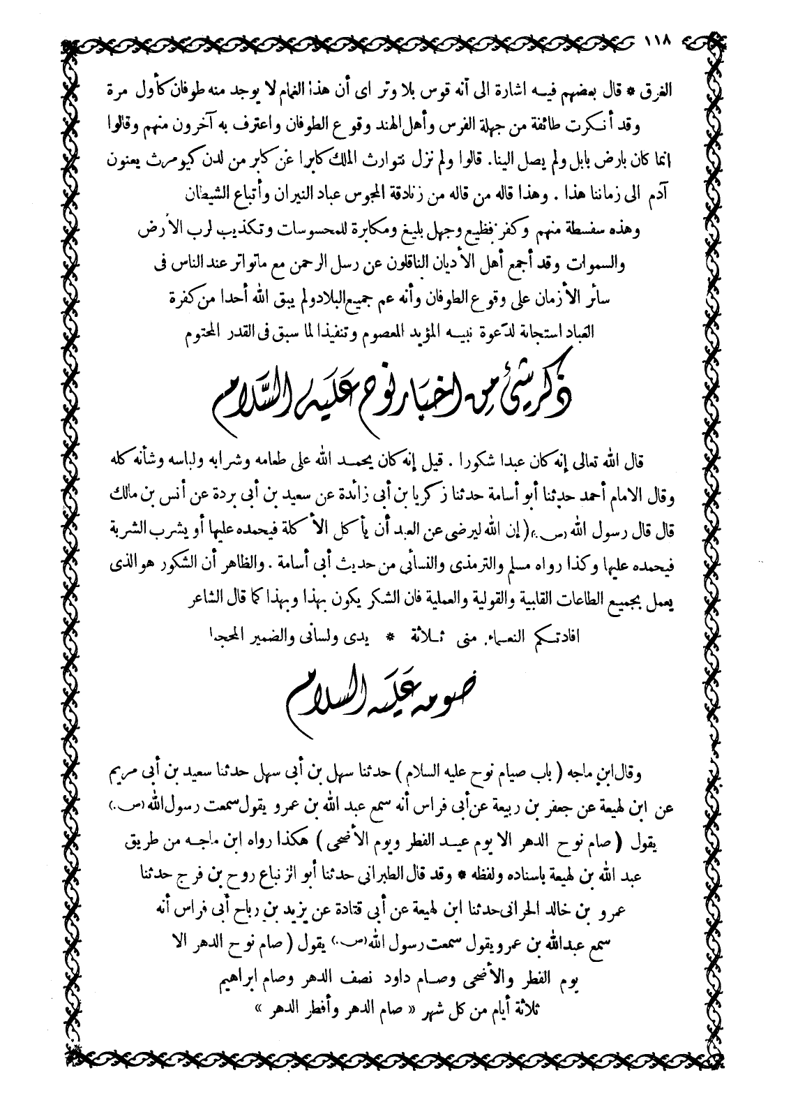 وَقَالَ ابْنُ مَاجَهْ (بَابُ صِيَامِ نُوحٍ عَلَيْهِ السَّلَامُ) حَدَّثَنَا سَهْلُ بْنُ أَبِي سَهْلٍ حَدَّثَنَا سَعِيدُ بْنُ أَبِي مَرْيَمَ عَنِ ابْنِ لَهِيعَةَ عَنْ جَعْفَرِ بْنِ رَبِيعَةَ عَنْ أَبِي فِرَاسٍ أَنَّهُ سَمِعَ عَبْدَ اللَّهِ بْنَ عَمْرٍو يَقُولُ سَمِعْتُ رَسُولَ اللَّهِ صَلَّى اللَّهُ عَلَيْهِ وَسَلَّمَ يَقُولُ (صَامَ نُوحٌ الدَّهْرَ الا يوم عيد الْفِطْرِ وَيَوْمَ الْأَضْحَى) هَكَذَا رَوَاهُ ابْنُ مَاجَهْ مِنْ طَرِيقِ عَبْدِ اللَّهِ بْنِ لَهِيعَةَ بِإِسْنَادِهِ وَلَفْظِهِ وَقَدْ قَالَ الطَّبَرَانِيُّ حَدَّثَنَا أَبُو الزِّنْبَاعِ رَوْحُ بْنُ فرج حَدَّثَنَا عَمْرُو بْنُ خَالِدٍ الْحَرَّانَيُّ حَدَّثَنَا ابْنُ لهيعة عن أبى قتادة عَنْ يَزِيدَ بْنِ رَبَاحٍ أَبِي فِرَاسٍ أَنَّهُ سَمِعَ عَبْدَ اللَّهِ بْنَ عَمْرٍو يَقُولُ سَمِعْتُ رَسُولَ اللَّهِ صَلَّى اللَّهُ عَلَيْهِ وسلم يقول (صَامَ نُوحٌ الدَّهْرَ إِلَّا يَوْمَ الْفِطْرِ وَالْأَضْحَى وَصَامَ دَاوُدُ نِصْفَ الدَّهْرِ وَصَامَ إِبْرَاهِيمُ ثَلَاثَةَ أَيَّامٍ مِنْ كُلِّ شَهْرٍ «صَامَ الدَّهْرَ وَأَفْطَرَ الدهر»