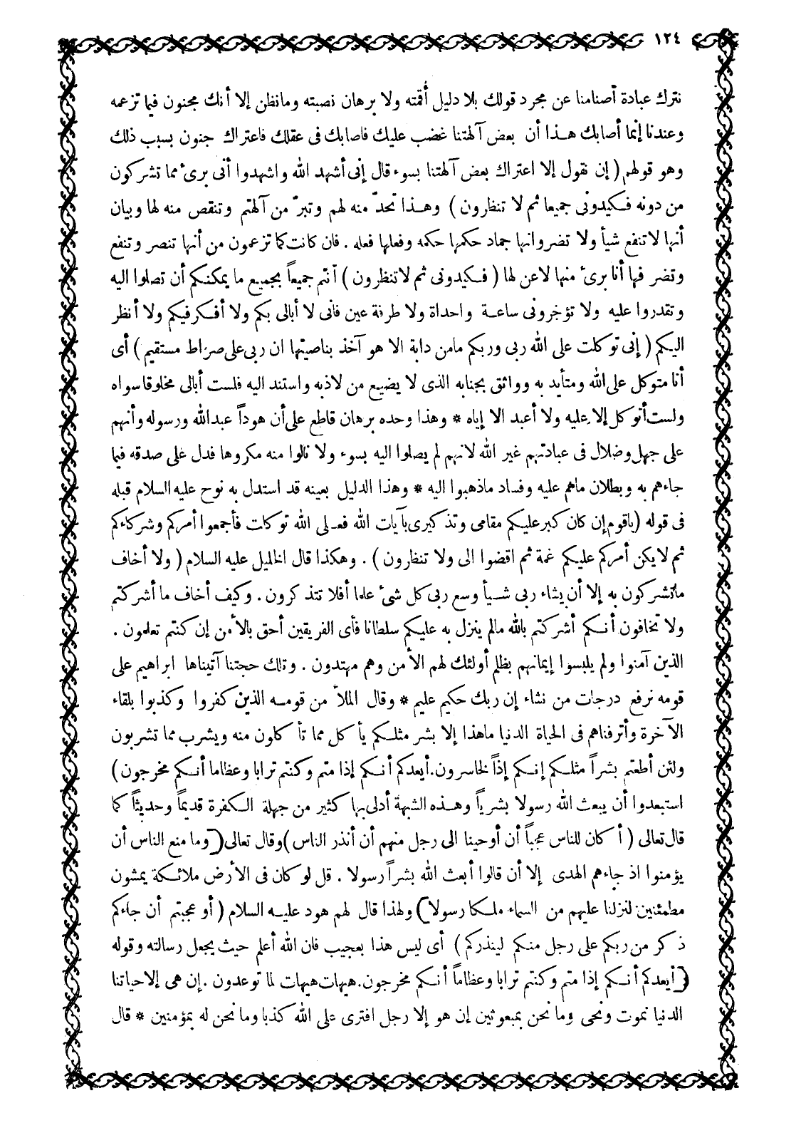 نَتْرُكُ عِبَادَةَ أَصْنَامِنَا عَنْ مُجَرَّدِ قَوْلِكَ بِلَا دَلِيلٍ أَقَمْتَهُ وَلَا بُرْهَانٍ نَصَبْتَهُ وَمَا نَظُنُّ إِلَّا أَنَّكَ مَجْنُونٌ فِيمَا تَزْعُمُهُ وَعِنْدَنَا إِنَّمَا أَصَابَكَ هَذَا أَنَّ بَعْضَ آلِهَتِنَا غَضِبَ عَلَيْكَ فَأَصَابَكَ فِي عَقْلِكَ فَاعْتَرَاكَ جُنُونٌ بِسَبَبِ ذَلِكَ وَهُوَ قَوْلُهُمْ (إِنْ نَقُولُ إِلَّا اعْتَراكَ بَعْضُ آلِهَتِنا بِسُوءٍ قَالَ إِنِّي أُشْهِدُ اللَّهَ وَاشْهَدُوا أَنِّي بَرِيءٌ مِمَّا تُشْرِكُونَ مِنْ دُونِهِ فَكِيدُونِي جَمِيعاً ثُمَّ لا تُنْظِرُونِ) 11: 54- 55 وهذا تحدّ منه لهم وتبرّ من آلهتم وتنقص منه لها وبيان أنها لا تنفع شيئا ولا تضر وانها جماد حكمها حكمه وفعلها فعله. فان كانت كما تزعمون من أنها تنصر وتنفع وتضر فها أنا بريء منها لا عن لها (فَكِيدُونِي جَمِيعاً ثُمَّ لا تُنْظِرُونِ) 11: 55 أنتم جَمِيعًا بِجَمِيعِ مَا يُمْكِنُكُمْ أَنْ تَصِلُوا إِلَيْهِ وَتَقْدِرُوا عَلَيْهِ وَلَا تُؤَخِّرُونِي سَاعَةً وَاحِدَةً وَلَا طَرْفَةَ عَيْنٍ فَإِنِّي لَا أُبَالِي بِكُمْ وَلَا أُفَكِّرُ فِيكُمْ وَلَا أَنْظُرُ إِلَيْكُمْ (إِنِّي تَوَكَّلْتُ عَلَى اللَّهِ رَبِّي وَرَبِّكُمْ مَا مِنْ دَابَّةٍ إِلَّا هُوَ آخِذٌ بِناصِيَتِها إِنَّ رَبِّي عَلى صِراطٍ مُسْتَقِيمٍ) 11: 56 أَيْ أَنَا مُتَوَكِّلٌ عَلَى اللَّهِ وَمُتَأَيِّدٌ بِهِ وَوَاثِقٌ بِجَنَابِهِ الَّذِي لَا يَضِيعُ مَنْ لَاذَ بِهِ وَاسْتَنَدَ إِلَيْهِ فَلَسْتُ أُبَالِي مَخْلُوقًا سِوَاهُ وَلَسْتُ أَتَوَكَّلُ إِلَّا عَلَيْهِ وَلَا أَعْبُدُ إِلَّا إِيَّاهُ وَهَذَا وَحْدَهُ بُرْهَانٌ قَاطِعٌ عَلَى أَنَّ هُودًا عَبْدُ اللَّهِ وَرَسُولُهُ وَأَنَّهُمْ عَلَى جَهْلٍ وَضَلَالٍ فِي عِبَادَتِهِمْ غَيْرَ اللَّهِ لِأَنَّهُمْ لَمْ يَصِلُوا إِلَيْهِ بِسُوءٍ وَلَا نَالُوا مِنْهُ مَكْرُوهًا فَدَلَّ عَلَى صِدْقِهِ فِيمَا جَاءَهُمْ بِهِ وَبُطْلَانِ مَا هُمْ عَلَيْهِ وَفَسَادِ مَا ذَهَبُوا إِلَيْهِ وَهَذَا الدَّلِيلُ بِعَيْنِهِ قَدِ اسْتَدَلَّ بِهِ نُوحٌ عَلَيْهِ السَّلَامُ قَبْلَهُ فِي قَوْلِهِ (يَا قَوْمِ إِنْ كانَ كَبُرَ عَلَيْكُمْ مَقامِي وَتَذْكِيرِي بِآياتِ اللَّهِ فَعَلَى اللَّهِ تَوَكَّلْتُ فَأَجْمِعُوا أَمْرَكُمْ وَشُرَكاءَكُمْ ثُمَّ لَا يَكُنْ أَمْرُكُمْ عَلَيْكُمْ غُمَّةً ثُمَّ اقْضُوا إِلَيَّ وَلا تُنْظِرُونِ) 10: 71. وَهَكَذَا قَالَ الْخَلِيلُ عَلَيْهِ السَّلَامُ (وَلا أَخافُ مَا تُشْرِكُونَ بِهِ إِلَّا أَنْ يَشاءَ رَبِّي شَيْئاً وَسِعَ رَبِّي كُلَّ شَيْءٍ عِلْماً أَفَلا تَتَذَكَّرُونَ. وَكَيْفَ أَخافُ مَا أَشْرَكْتُمْ وَلا تَخافُونَ أَنَّكُمْ أَشْرَكْتُمْ بِاللَّهِ مَا لَمْ يُنَزِّلْ بِهِ عَلَيْكُمْ سُلْطاناً فَأَيُّ الْفَرِيقَيْنِ أَحَقُّ بِالْأَمْنِ إِنْ كُنْتُمْ تَعْلَمُونَ.