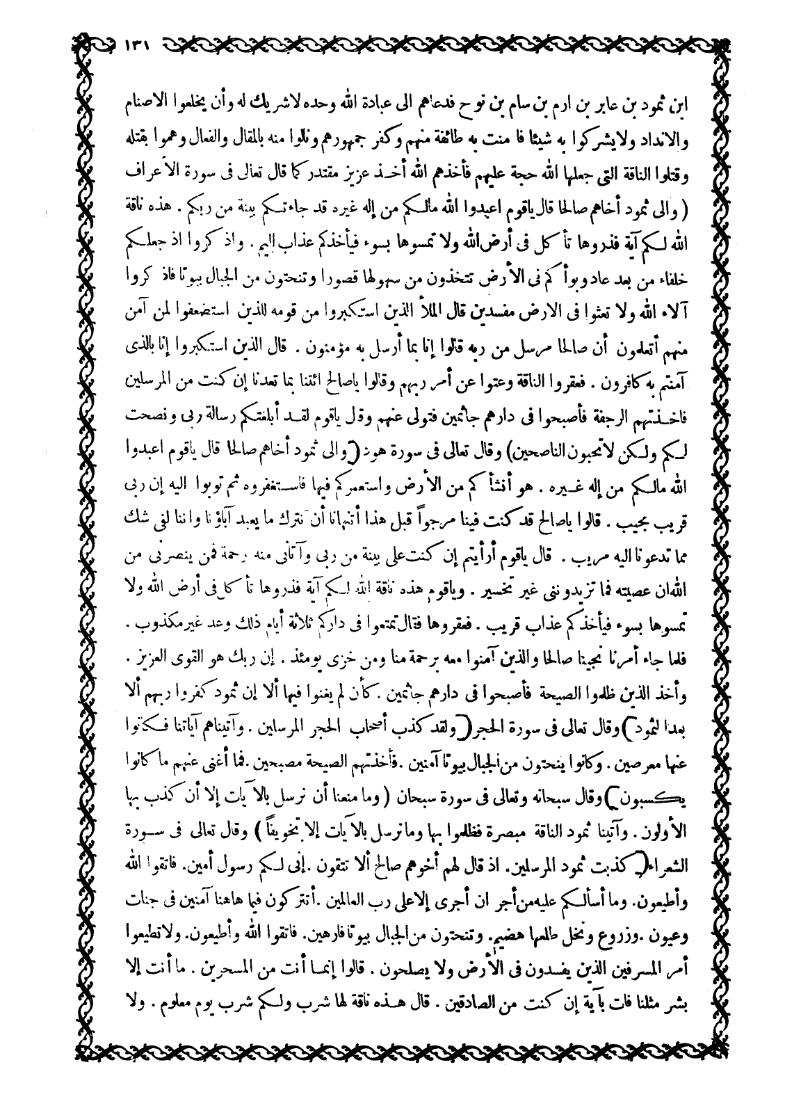 وَأَخَذَ الَّذِينَ ظَلَمُوا الصَّيْحَةُ فَأَصْبَحُوا فِي دِيارِهِمْ جاثِمِينَ. كَأَنْ لَمْ يَغْنَوْا فِيها أَلا إِنَّ ثَمُودَ كَفَرُوا رَبَّهُمْ أَلا بُعْداً لِثَمُودَ 11: 61- 68 وقال تعالى في سورة الحجر وَلَقَدْ كَذَّبَ أَصْحابُ الْحِجْرِ الْمُرْسَلِينَ. وَآتَيْناهُمْ آياتِنا فَكانُوا عَنْها مُعْرِضِينَ. وَكانُوا يَنْحِتُونَ من الْجِبالِ بُيُوتاً آمِنِينَ. فَأَخَذَتْهُمُ الصَّيْحَةُ مُصْبِحِينَ. فَما أَغْنى عَنْهُمْ ما كانُوا يَكْسِبُونَ 15: 80- 84 وَقَالَ سُبْحَانَهُ وَتَعَالَى فِي سُورَةِ سُبْحَانَ وَما مَنَعَنا أَنْ نُرْسِلَ بِالْآياتِ إِلَّا أَنْ كَذَّبَ بِهَا الْأَوَّلُونَ. وَآتَيْنا ثَمُودَ النَّاقَةَ مُبْصِرَةً فَظَلَمُوا بِها وَما نُرْسِلُ بِالْآياتِ إِلَّا تَخْوِيفاً 17: 59 وَقَالَ تَعَالَى فِي سُورَةِ الشُّعَرَاءِ كَذَّبَتْ ثَمُودُ الْمُرْسَلِينَ. إِذْ قَالَ لَهُمْ أَخُوهُمْ صالِحٌ أَلا تَتَّقُونَ. إِنِّي لَكُمْ رَسُولٌ أَمِينٌ. فَاتَّقُوا اللَّهَ وَأَطِيعُونِ. وَما أَسْئَلُكُمْ عَلَيْهِ مِنْ أَجْرٍ إِنْ أَجْرِيَ إِلَّا عَلى رَبِّ الْعالَمِينَ. أَتُتْرَكُونَ فِي مَا هاهُنا آمِنِينَ فِي جَنَّاتٍ وَعُيُونٍ. وَزُرُوعٍ وَنَخْلٍ طَلْعُها هَضِيمٌ. وَتَنْحِتُونَ مِنَ الْجِبالِ بُيُوتاً فارِهِينَ. فَاتَّقُوا اللَّهَ وَأَطِيعُونِ. وَلا تُطِيعُوا أَمْرَ الْمُسْرِفِينَ الَّذِينَ يُفْسِدُونَ فِي الْأَرْضِ وَلا يُصْلِحُونَ. قالُوا إِنَّما أَنْتَ مِنَ الْمُسَحَّرِينَ. مَا أَنْتَ إِلَّا بَشَرٌ مِثْلُنا فَأْتِ بِآيَةٍ إِنْ كُنْتَ مِنَ الصَّادِقِينَ. قَالَ هذِهِ ناقَةٌ لَها شِرْبٌ وَلَكُمْ شِرْبُ يَوْمٍ مَعْلُومٍ. وَلا