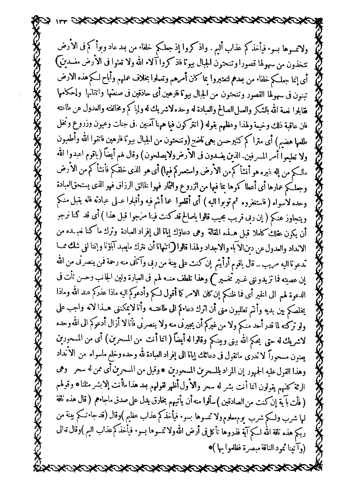 وَلا تَمَسُّوها بِسُوءٍ فَيَأْخُذَكُمْ عَذابٌ أَلِيمٌ. وَاذْكُرُوا إِذْ جَعَلَكُمْ خُلَفاءَ مِنْ بَعْدِ عادٍ وَبَوَّأَكُمْ فِي الْأَرْضِ تَتَّخِذُونَ مِنْ سُهُولِها قُصُوراً وَتَنْحِتُونَ الْجِبالَ بُيُوتاً فَاذْكُرُوا آلاءَ اللَّهِ وَلا تَعْثَوْا في الْأَرْضِ مُفْسِدِينَ 7: 73- 74 أَيْ إِنَّمَا جَعَلَكُمْ خُلَفَاءَ مِنْ بَعْدِهِمْ لِتَعْتَبِرُوا بما كان أَمْرِهِمْ وَتَعْمَلُوا بِخِلَافِ عَمَلِهِمْ وَأَبَاحَ لَكُمْ هَذِهِ الْأَرْضَ تَبْنُونَ فِي سُهُولِهَا الْقُصُورَ وَتَنْحِتُونَ مِنَ الجبال بيوتا فارهين أَيْ حَاذِقِينَ فِي صَنْعَتِهَا وَإِتْقَانِهَا وَإِحْكَامِهَا فَقَابِلُوا نِعْمَةَ اللَّهِ بِالشُّكْرِ وَالْعَمَلِ الصَّالِحِ وَالْعِبَادَةِ لَهُ وَحْدَهُ لَا شَرِيكَ لَهُ وَإِيَّاكُمْ وَمُخَالَفَتَهُ وَالْعُدُولَ عَنْ طَاعَتِهِ فَإِنَّ عَاقِبَةَ ذَلِكَ وَخِيمَةٌ وَلِهَذَا وَعَظَهُمْ بِقَوْلِهِ أَتُتْرَكُونَ فِي مَا هاهُنا آمِنِينَ. فِي جَنَّاتٍ وَعُيُونٍ وَزُرُوعٍ وَنَخْلٍ طَلْعُها هَضِيمٌ 26: 146- 148 أَيْ مُتَرَاكِمٌ كَثِيرٌ حَسَنٌ بَهِيٌّ نَاضِجٌ (وَتَنْحِتُونَ مِنَ الْجِبالِ بُيُوتاً فارِهِينَ فَاتَّقُوا اللَّهَ وَأَطِيعُونِ وَلا تُطِيعُوا أَمْرَ الْمُسْرِفِينَ. الَّذِينَ يُفْسِدُونَ فِي الْأَرْضِ وَلا يُصْلِحُونَ) 26: 149- 152 وَقَالَ لَهُمْ أَيْضًا (يَا قَوْمِ اعْبُدُوا اللَّهَ مَا لَكُمْ مِنْ إِلهٍ غَيْرُهُ هُوَ أَنْشَأَكُمْ من الْأَرْضِ وَاسْتَعْمَرَكُمْ فِيها) 11: 61 أَيْ هُوَ الَّذِي خَلَقَكُمْ فَأَنْشَأَكُمْ مِنَ الْأَرْضِ وَجَعَلَكُمْ عُمَّارَهَا أَيْ أَعْطَاكُمُوهَا بِمَا فِيهَا مِنَ الزُّرُوعِ وَالثِّمَارِ فَهُوَ الْخَالِقُ الرَّزَّاقُ فَهُوَ الَّذِي يَسْتَحِقُّ الْعِبَادَةَ وَحْدَهُ لَا سِوَاهُ (فَاسْتَغْفِرُوهُ ثُمَّ تُوبُوا إِلَيْهِ) 11: 61 أَيْ أَقْلِعُوا عَمَّا أَنْتُمْ فِيهِ وَأَقْبِلُوا عَلَى عِبَادَتِهِ فَإِنَّهُ يَقْبَلُ مِنْكُمْ وَيَتَجَاوَزُ عَنْكُمْ (إِنَّ رَبِّي قَرِيبٌ مُجِيبٌ قالُوا يَا صالِحُ قَدْ كُنْتَ فِينا مَرْجُوًّا قَبْلَ هَذَا) 11: 61- 62 أَيْ قَدْ كُنَّا نَرْجُو أَنْ يَكُونَ عَقْلُكَ كاملا هَذِهِ الْمَقَالَةِ وَهِيَ دُعَاؤُكَ إِيَّانَا إِلَى إِفْرَادِ العبادة وَتَرْكِ مَا كُنَّا نَعْبُدُهُ مِنَ الْأَنْدَادِ وَالْعُدُولِ عَنْ دِينِ الْآبَاءِ وَالْأَجْدَادِ وَلِهَذَا قَالُوا (أَتَنْهانا أَنْ نَعْبُدَ مَا يَعْبُدُ آباؤُنا وَإِنَّنا لَفِي شَكٍّ مِمَّا تَدْعُونا إِلَيْهِ مُرِيبٍ- قَالَ يَا قَوْمِ أَرَأَيْتُمْ إِنْ كُنْتُ عَلى بَيِّنَةٍ مِنْ رَبِّي وَآتانِي مِنْهُ رَحْمَةً فَمَنْ يَنْصُرُنِي مِنَ اللَّهِ إِنْ عَصَيْتُهُ فَما تَزِيدُونَنِي غَيْرَ تَخْسِيرٍ) 11: 62- 63 وَهَذَا تَلَطُّفٌ مِنْهُ لَهُمْ فِي الْعِبَارَةِ وَلِينِ الْجَانِبِ وَحُسْنُ تَأَتٍّ فِي الدَّعْوَةِ لَهُمْ إِلَى الْخَيْرِ أَيْ فَمَا ظَنُّكُمْ إِنْ كَانَ الْأَمْرُ كَمَا أَقُولُ لَكُمْ وَأَدْعُوكُمْ إِلَيْهِ مَاذَا عُذْرُكُمْ عِنْدَ اللَّهِ وَمَاذَا يُخَلِّصُكُمْ بَيْنَ يَدَيْهِ وَأَنْتُمْ تَطْلُبُونَ مِنِّي أَنْ أَتْرُكَ دُعَاءَكُمْ إِلَى طَاعَتِهِ وَأَنَا لَا يُمْكِنُنِي هَذَا لِأَنَّهُ وَاجِبٌ عَلَيَّ وَلَوْ تَرَكْتُهُ لَمَا قَدَرَ أَحَدٌ مِنْكُمْ وَلَا مِنْ غَيْرِكُمْ أَنْ يُجِيرَنِي مِنْهُ وَلَا يَنْصُرَنِي فَأَنَا لَا أَزَالُ أَدْعُوكُمْ إِلَى اللَّهِ وَحْدَهُ لَا شَرِيكَ لَهُ حَتَّى يَحْكُمَ اللَّهُ بَيْنِي وَبَيْنَكُمْ وَقَالُوا لَهُ أَيْضًا (إِنَّما أَنْتَ مِنَ الْمُسَحَّرِينَ) 26: 153 أَيْ مِنَ الْمَسْحُورِينَ يَعْنُونَ مَسْحُورًا لَا تَدْرِي مَا تَقُولُ فِي دُعَائِكَ إِيَّانَا إِلَى إِفْرَادِ الْعِبَادَةِ للَّه وَحْدَهُ وَخَلْعِ مَا سِوَاهُ مِنَ الْأَنْدَادِ وَهَذَ