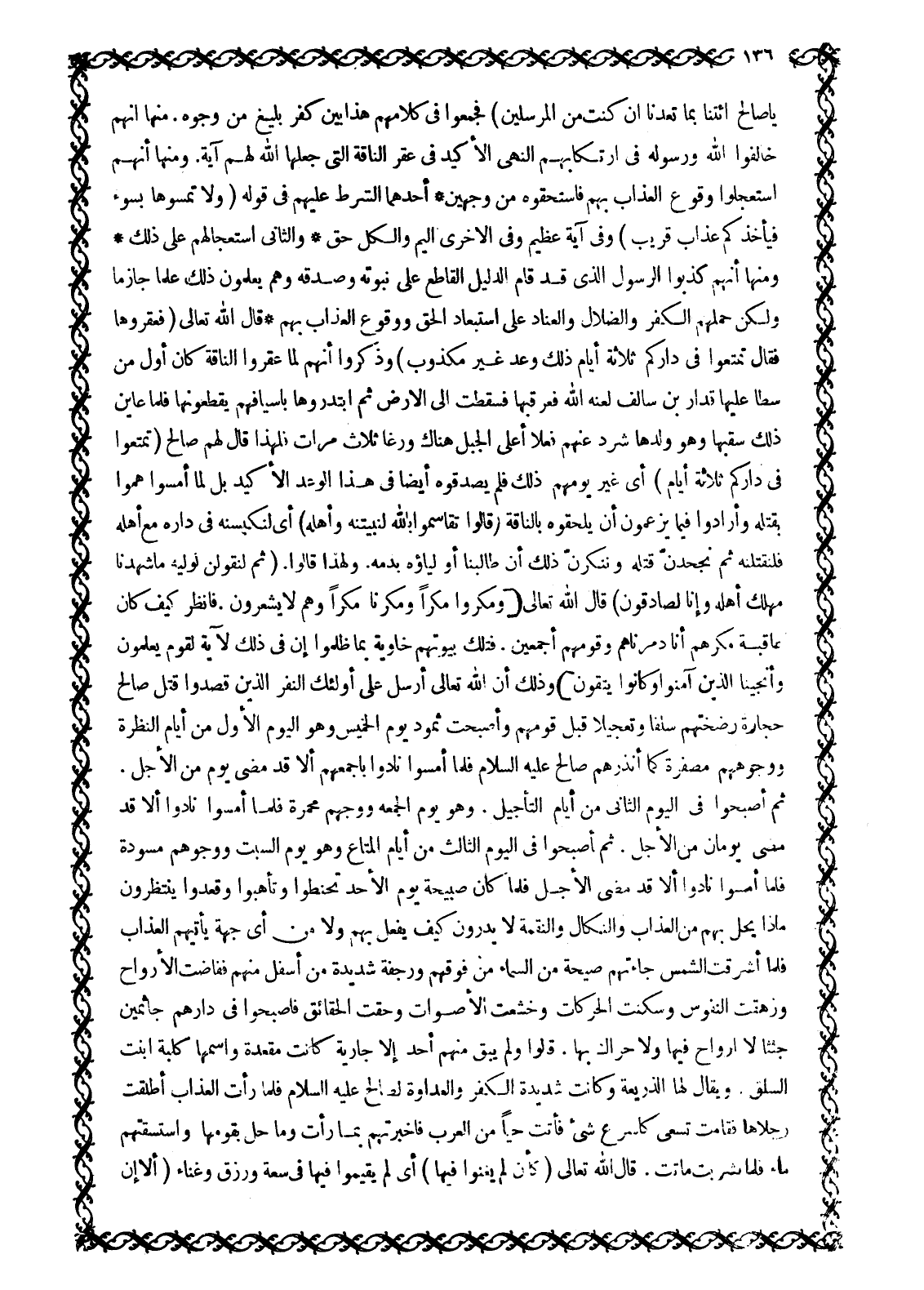 يَا صالِحُ ائْتِنا بِما تَعِدُنا إِنْ كُنْتَ من الْمُرْسَلِينَ) 7: 77 فَجَمَعُوا فِي كَلَامِهِمْ هَذَا بَيْنَ كُفْرٍ بَلِيغٍ مِنْ وُجُوهٍ. مِنْهَا أَنَّهُمْ خَالَفُوا اللَّهَ وَرَسُولَهُ فِي ارْتِكَابِهِمُ النَّهْيَ الْأَكِيدَ فِي عَقْرِ النَّاقَةِ الَّتِي جَعَلَهَا اللَّهُ لَهُمْ آيَةً. وَمِنْهَا أَنَّهُمُ اسْتَعْجَلُوا وُقُوعَ الْعَذَابِ بِهِمْ فَاسْتَحَقُّوهُ مِنْ وَجْهَيْنِ أَحَدُهُمَا الشَّرْطُ عَلَيْهِمْ فِي قَوْلِهِ (وَلا تَمَسُّوها بِسُوءٍ فَيَأْخُذَكُمْ عَذابٌ قَرِيبٌ) 11: 64 وَفِي آيَةٍ عَظِيمٌ وَفِي الْأُخْرَى أَلِيمٌ وَالْكُلُّ حَقٌّ وَالثَّانِي اسْتِعْجَالُهُمْ عَلَى ذَلِكَ وَمِنْهَا أَنَّهُمْ كَذَّبُوا الرَّسُولَ الَّذِي قَدْ قَامَ الدَّلِيلُ الْقَاطِعُ عَلَى نُبُوَّتِهِ وَصِدْقِهِ وَهُمْ يَعْلَمُونَ ذَلِكَ عِلْمًا جَازِمًا وَلَكِنْ حَمَلَهُمُ الْكُفْرُ وَالضَّلَالُ وَالْعِنَادُ عَلَى اسْتِبْعَادِ الْحَقِّ وَوُقُوعِ الْعَذَابِ بِهِمْ قَالَ اللَّهُ تَعَالَى فَعَقَرُوها فَقالَ تَمَتَّعُوا فِي دارِكُمْ ثَلاثَةَ أَيَّامٍ ذلِكَ وَعْدٌ غَيْرُ مَكْذُوبٍ 11: 65 وَذَكَرُوا أَنَّهُمْ لَمَّا عَقَرُوا النَّاقَةَ كَانَ أَوَّلَ مَنْ سَطَا عَلَيْهَا قُدَارُ بْنُ سَالِفٍ لَعَنَهُ اللَّهُ فَعَرْقَبَهَا فَسَقَطَتْ إِلَى الْأَرْضِ ثُمَّ ابْتَدَرُوهَا بِأَسْيَافِهِمْ يُقَطِّعُونَهَا فَلَمَّا عَايَنَ ذَلِكَ سَقْبُهَا وَهُوَ وَلَدُهَا شَرَدَ عَنْهُمْ فَعَلَا أَعْلَى الْجَبَلِ هُنَاكَ وَرَغَا ثَلَاثَ مَرَّاتٍ فَلِهَذَا قَالَ لَهُمْ صَالِحٌ (تَمَتَّعُوا في دارِكُمْ ثَلاثَةَ أَيَّامٍ) 11: 65 أَيْ غَيْرَ يَوْمِهِمْ ذَلِكَ فَلَمْ يُصَدِّقُوهُ أَيْضًا فِي هَذَا الْوَعْدِ الْأَكِيدِ بَلْ لَمَّا أَمْسَوْا هَمُّوا بِقَتْلِهِ وَأَرَادُوا فِيمَا يَزْعُمُونَ أَنْ يُلْحِقُوهُ بالناقة (قالُوا تَقاسَمُوا بِاللَّهِ لَنُبَيِّتَنَّهُ وَأَهْلَهُ) 27: 49 أَيْ لَنَكْبِسَنَّهُ فِي دَارِهِ مَعَ أَهْلِهِ فَلَنَقْتُلَنَّهُ ثُمَّ نَجْحَدَنَّ قَتْلَهُ وَنُنْكِرَنَّ ذَلِكَ إِنْ طَالَبَنَا أَوْلِيَاؤُهُ بِدَمِهِ. وَلِهَذَا قَالُوا. (ثُمَّ لَنَقُولَنَّ لِوَلِيِّهِ ما شَهِدْنا مَهْلِكَ أَهْلِهِ وَإِنَّا لَصادِقُونَ) 27: 49 قال اللَّهُ تَعَالَى وَمَكَرُوا مَكْراً وَمَكَرْنا مَكْراً وَهُمْ لَا يَشْعُرُونَ. فَانْظُرْ كَيْفَ كانَ عاقِبَةُ مَكْرِهِمْ أَنَّا دَمَّرْناهُمْ وَقَوْمَهُمْ أَجْمَعِينَ. فَتِلْكَ بُيُوتُهُمْ خاوِيَةً بِما ظَلَمُوا إِنَّ فِي ذلِكَ لَآيَةً لِقَوْمٍ يَعْلَمُونَ وَأَنْجَيْنَا الَّذِينَ آمَنُوا وَكانُوا يَتَّقُونَ 27: 50- 53 وَذَلِكَ أَنَّ اللَّهَ تَعَالَى أَرْسَلَ عَلَى أُولَئِكَ النَّفَرِ الَّذِينَ قَصَدُوا قَتْلَ صَالِحٍ حِجَارَةً رَضَخَتْهُمْ سَلَفًا وَتَعْجِيلًا قَبْلَ قَوْمِهِمْ وَأَصْبَحَتْ ثَمُودُ يَوْمَ الْخَمِيسِ وَهُوَ الْيَوْمُ الْأَوَّلُ مِنْ أَيَّامِ النَّظِرَةِ وَوُجُوهُهُمْ مُصْفَرَّةٌ كَمَا أَنْذَرَهُمْ صَالِحٌ عَلَيْهِ السَّلَامُ فَلَمَّا أَمْسَوْا نَادَوْا بِأَجْمَعِهِمْ أَلَا قَدْ مَضَى يَوْمٌ مِنَ الْأَجَلِ.