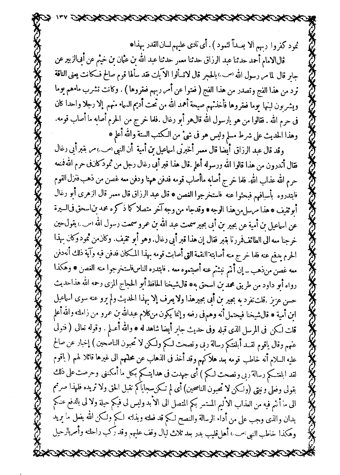 ثَمُودَ كَفَرُوا رَبَّهُمْ أَلا بُعْداً لِثَمُودَ) 11: 68. أَيْ نَادَى عَلَيْهِمْ لِسَانُ الْقَدَرِ بِهَذَا قَالَ الْإِمَامُ أَحْمَدُ حَدَّثَنَا عَبْدُ الرَّزَّاقِ حَدَّثَنَا مَعْمَرٌ حدثنا عبد الله بْنِ عُثْمَانَ بْنِ خَيْثَمَ عَنْ أَبِي الزُّبَيْرِ عَنْ جَابِرٍ قَالَ لَمَّا مَرَّ رَسُولُ اللَّهِ صَلَّى اللَّهُ عَلَيْهِ وَسَلَّمَ بِالْحِجْرِ قَالَ لَا تَسْأَلُوا الْآيَاتِ فَقَدْ سَأَلَهَا قَوْمُ صَالِحٍ فَكَانَتْ يَعْنِي النَّاقَةَ تَرِدُ مِنْ هَذَا الْفَجِّ وَتَصْدُرُ مِنْ هَذَا الْفَجِّ (فَعَتَوْا عَنْ أَمْرِ رَبِّهِمْ فَعَقَرُوهَا) . وَكَانَتْ تَشْرَبُ مَاءَهُمْ يَوْمًا وَيَشْرَبُونَ لَبَنَهَا يَوْمًا فَعَقَرُوهَا فَأَخَذَتْهُمْ صَيْحَةٌ أَهْمَدَ اللَّهُ مَنْ تَحْتَ أَدِيمِ السَّمَاءِ مِنْهُمْ إِلَّا رَجُلًا وَاحِدًا كَانَ فِي حَرَمِ اللَّهِ. فَقَالُوا مَنْ هُوَ يَا رَسُولَ اللَّهِ قَالَ هُوَ أَبُو رِغَالٍ. فَلَمَّا خَرَجَ مِنَ الْحَرَمِ أَصَابَهُ مَا أَصَابَ قَوْمَهُ. وَهَذَا الْحَدِيثُ عَلَى شَرْطِ مُسْلِمٍ وَلَيْسَ هُوَ فِي شَيْءٍ مِنَ الْكُتُبِ السِّتَّةِ وَاللَّهُ أَعْلَمُ وَقَدْ قَالَ عَبْدُ الرَّزَّاقِ أَيْضًا قَالَ مَعْمَرٌ أَخْبَرَنِي إِسْمَاعِيلُ بْنُ أُمَيَّةَ أَنَّ النَّبِيَّ صَلَّى اللَّهُ عَلَيْهِ وَسَلَّمَ مَرَّ بِقَبْرِ أَبِي رِغَالٍ فَقَالَ أَتَدْرُونَ مَنْ هَذَا قَالُوا اللَّهُ وَرَسُولُهُ أَعْلَمُ. قَالَ هَذَا قَبْرُ أَبِي رِغَالٍ رَجُلٍ مِنْ ثَمُودَ كَانَ فِي حَرَمِ اللَّهِ فَمَنَعَهُ حَرَمُ اللَّهِ عَذَابَ اللَّهِ. فَلَمَّا خَرَجَ أَصَابَهُ مَا أَصَابَ قَوْمَهُ فَدُفِنَ هَاهُنَا وَدُفِنَ مَعَهُ غُصْنٌ مِنْ ذَهَبٍ فَنَزَلَ الْقَوْمُ فَابْتَدَرُوهُ بِأَسْيَافِهِمْ فَبَحَثُوا عَنْهُ فَاسْتَخْرَجُوا الْغُصْنَ قَالَ عَبْدُ الرَّزَّاقِ قَالَ مَعْمَرٌ قَالَ الزُّهْرِيُّ أَبُو رِغَالٍ أَبُو ثَقِيفٍ هَذَا مُرْسَلٌ مِنْ هَذَا الْوَجْهِ وَقَدْ جَاءَ مِنْ وَجْهٍ آخَرَ مُتَّصِلًا كَمَا ذَكَرَهُ مُحَمَّدُ بْنُ إِسْحَاقَ فِي السِّيرَةِ عَنْ إِسْمَاعِيلَ بْنِ أُمَيَّةَ عَنْ بُجَيْرِ بْنِ أَبِي بُجَيْرٍ سَمِعْتُ عَبْدَ اللَّهِ بْنَ عَمْرٍو سَمِعْتُ رَسُولَ اللَّهِ صَلَّى اللَّهُ عَلَيْهِ وَسَلَّمَ يَقُولُ حِينَ خَرَجْنَا مَعَهُ إِلَى الطَّائِفِ فَمَرَرْنَا بِقَبْرٍ فَقَالَ إِنَّ هَذَا قَبْرُ أَبِي رِغَالٍ. وَهُوَ أَبُو ثَقِيفٍ. وَكَانَ مِنْ ثَمُودَ وَكَانَ بِهَذَا الْحَرَمِ يَدْفَعُ عَنْهُ فَلَمَّا خَرَجَ مِنْهُ أَصَابَتْهُ النِّقْمَةُ الَّتِي أَصَابَتْ قَوْمَهُ بِهَذَا الْمَكَانِ فَدُفِنَ فِيهِ وَآيَةُ ذَلِكَ أَنَّهُ دُفِنَ مَعَهُ غُصْنٌ مِنْ ذَهَبٍ- إِنْ أَنْتُمْ نَبَشْتُمْ عَنْهُ أَصَبْتُمُوهُ مَعَهُ. فَابْتَدَرَهُ النَّاسُ فَاسْتَخْرَجُوا مِنْهُ الْغُصْنَ وَهَكَذَا رَوَاهُ أَبُو دَاوُدَ مِنْ طَرِيقِ مُحَمَّدِ بْنِ إِسْحَاقَ بِهِ قَالَ شَيْخُنَا الْحَافِظُ أَبُو الْحَجَّاجِ الْمِزِّيُّ رَحِمَهُ اللَّهُ هَذَا حَدِيثٌ حَسَنٌ عَزِيزٌ. قُلْتُ تَفَرَّدَ بِهِ بُجَيْرُ بْنُ أَبِي بُجَيْرٍ هَذَا وَلَا يُعْرَفُ إِلَّا بِهَذَا الْحَدِيثِ وَلَمْ يَرْوِ عَنْهُ سِوَى إِسْمَاعِيلَ ابن أُمَيَّةَ قَالَ شَيْخُنَا فَيَحْتَمِلُ أَنَّهُ وَهِمَ فِي رَفْعِهِ وَإِنَّمَا يَكُونُ مِنْ كَلَامِ عَبْدِ اللَّهِ بْنِ عَمْرٍو من زاملته وَاللَّهُ أَعْلَمُ قُلْتُ لَكِنْ فِي الْمُرْسَلِ الَّذِي قَبْلَهُ وَفِي حَدِيثِ جَابِرٍ أَيْضًا شَاهِدٌ لَهُ وَاللَّهُ أَعْلَمُ. وَقَوْلُهُ تَعَالَى فَتَوَلَّى عَنْهُمْ وَقال يَا قَوْمِ لَقَدْ أَبْلَغْتُكُمْ رِسالَةَ رَبِّي وَنَصَحْتُ لَكُمْ وَلكِنْ لا تُحِبُّونَ النَّاصِحِينَ) 7: 79 إِخْبَارٌ عَنْ صَالِحٍ عَلَيْهِ السَّلَامُ أَنَّهُ خَاطَبَ 