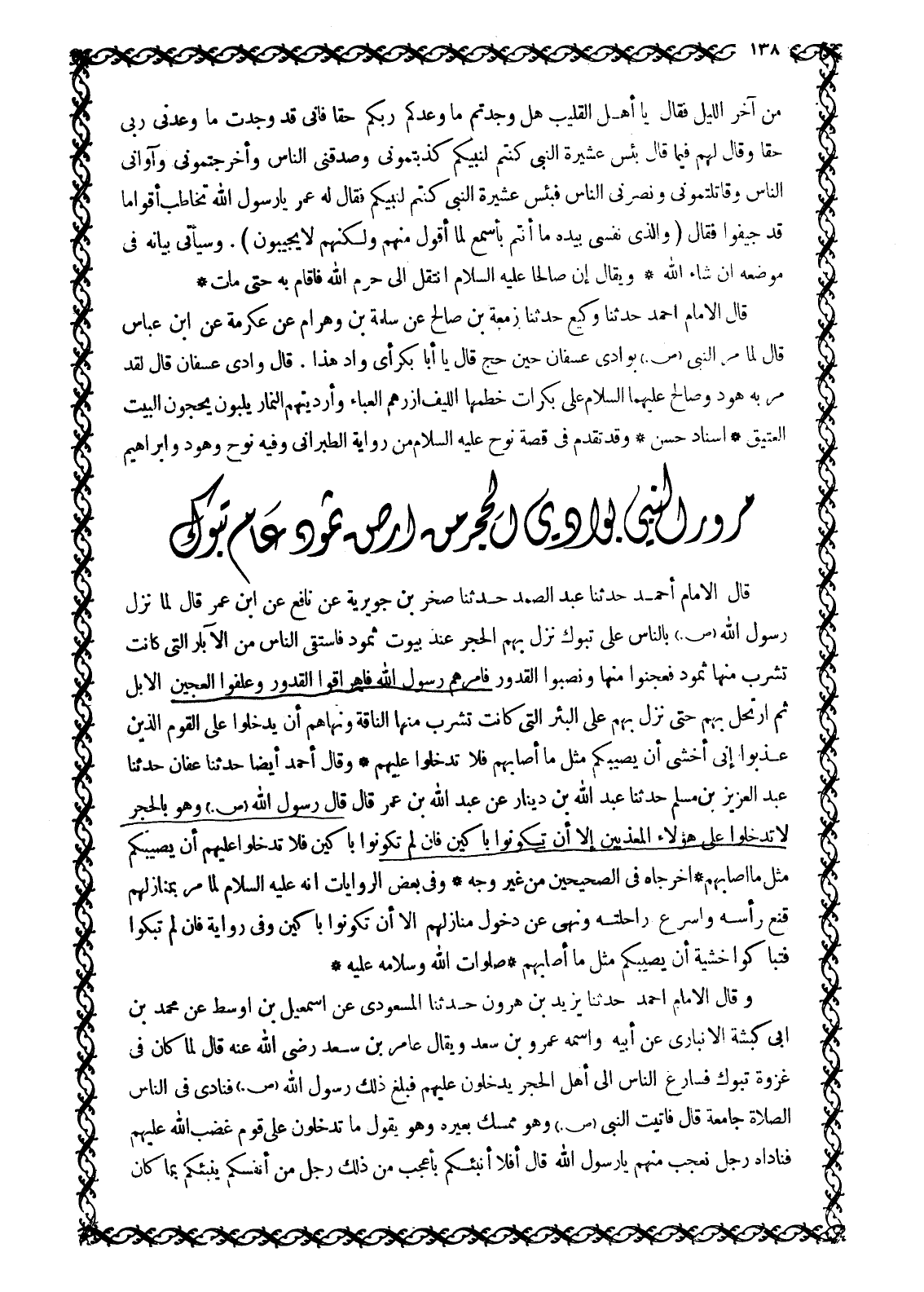 قَالَ الْإِمَامُ أَحْمَدُ حَدَّثَنَا عَبْدُ الصَّمَدِ حَدَّثَنَا صَخْرُ بْنُ جُوَيْرِيَةَ عَنْ نَافِعٍ عَنِ ابْنِ عُمَرَ قَالَ لَمَّا نَزَلَ رَسُولُ اللَّهِ صَلَّى اللَّهُ عَلَيْهِ وَسَلَّمَ بِالنَّاسِ عَلَى تَبُوكَ نَزَلَ بِهِمُ الْحِجْرَ عِنْدَ بُيُوتِ ثَمُودَ فَاسْتَقَى النَّاسُ مِنَ الْآبَارِ الَّتِي كَانَتْ تَشْرَبُ مِنْهَا ثَمُودُ فَعَجَنُوا مِنْهَا وَنَصَبُوا الْقُدُورَ فَأَمَرَهُمْ رَسُولُ اللَّهِ فَأَهْرَاقُوا الْقُدُورَ وَعَلَفُوا الْعَجِينَ الْإِبِلَ ثُمَّ ارْتَحَلَ بِهِمْ حَتَّى نَزَلَ بِهِمْ عَلَى الْبِئْرِ الَّتِي كَانَتْ تَشْرَبُ مِنْهَا النَّاقَةُ وَنَهَاهُمْ أَنْ يَدْخُلُوا عَلَى الْقَوْمِ الذين عذبوا إِنِّي أَخْشَى أَنْ يُصِيبَكُمْ مِثْلُ مَا أَصَابَهُمْ فَلَا تَدْخُلُوا عَلَيْهِمْ وَقَالَ أَحْمَدُ أَيْضًا حَدَّثَنَا عَفَّانُ حَدَّثَنَا عَبْدُ الْعَزِيزِ بْنُ مُسْلِمٍ حَدَّثَنَا عَبْدُ اللَّهِ بْنُ دِينَارٍ عَنْ عَبْدِ اللَّهِ بْنِ عُمَرَ قَالَ قَالَ رَسُولُ اللَّهِ صَلَّى اللَّهُ عَلَيْهِ وَسَلَّمَ وَهُوَ بِالْحِجْرِ لَا تَدْخُلُوا عَلَى هَؤُلَاءِ الْمُعَذَّبِينَ إِلَّا أَنْ تَكُونُوا بَاكِينَ فَإِنْ لَمْ تَكُونُوا بَاكِينَ فَلَا تَدْخُلُوا عَلَيْهِمْ أَنْ يُصِيبَكُمْ مِثْلُ مَا أَصَابَهُمْ أَخْرَجَاهُ فِي الصَّحِيحَيْنِ مِنْ غَيْرِ وَجْهٍ وَفِي بَعْضِ الرِّوَايَاتِ أَنَّهُ عَلَيْهِ السَّلَامُ لَمَّا مَرَّ بِمَنَازِلِهِمْ قَنَّعَ رَأْسَهُ وَأَسْرَعَ رَاحِلَتَهُ وَنَهَى عَنْ دُخُولِ مَنَازِلِهِمْ إِلَّا أَنْ تَكُونُوا بَاكِينَ وَفِي رِوَايَةٍ فَإِنْ لَمْ تَبْكُوا فَتَبَاكَوْا خَشْيَةَ أَنْ يُصِيبَكُمْ مِثْلُ مَا أَصَابَهُمْ صَلَوَاتُ اللَّهِ وَسَلَامُهُ عَلَيْهِ وَقَالَ الْإِمَامُ أَحْمَدُ حَدَّثَنَا يَزِيدُ بْنُ هَارُونَ حَدَّثَنَا الْمَسْعُودِيُّ عَنْ إِسْمَاعِيلَ بْنِ أَوْسَطَ عَنْ مُحَمَّدِ بن ابى كبشة الأنباري عَنْ أَبِيهِ وَاسْمُهُ عَمْرُو بْنُ سَعْدٍ وَيُقَالُ عَامِرُ بْنُ سَعْدٍ رَضِيَ اللَّهُ عَنْهُ قَالَ لَمَّا كَانَ فِي غَزْوَةِ تَبُوكَ فَسَارَعَ النَّاسُ إِلَى أَهْلِ الْحِجْرِ يَدْخُلُونَ عَلَيْهِمْ فَبَلَغَ ذَلِكَ رَسُولَ اللَّهِ صَلَّى اللَّهُ عَلَيْهِ وَسَلَّمَ فَنَادَى فِي النَّاسِ الصَّلَاةُ جَامِعَةٌ قَالَ فَأَتَيْتُ النَّبِيَّ صَلَّى اللَّهُ عَلَيْهِ وَسَلَّمَ وَهُوَ مُمْسِكٌ بَعِيرَهُ وَهُوَ يَقُولُ مَا تَدْخُلُونَ عَلَى قَوْمٍ غَضِبَ اللَّهُ عَلَيْهِمْ فَنَادَاهُ رَجُلٌ نَعْجَبُ مِنْهُمْ يَا رَسُولَ اللَّهِ قَالَ أَفَلَا أُنَبِّئُكُمْ بِأَعْجَبَ مِنْ ذَلِكَ رَجُلٌ مِنْ أَنْفُسِكُمْ يُنَبِّئُكُمْ بِمَا كَانَ