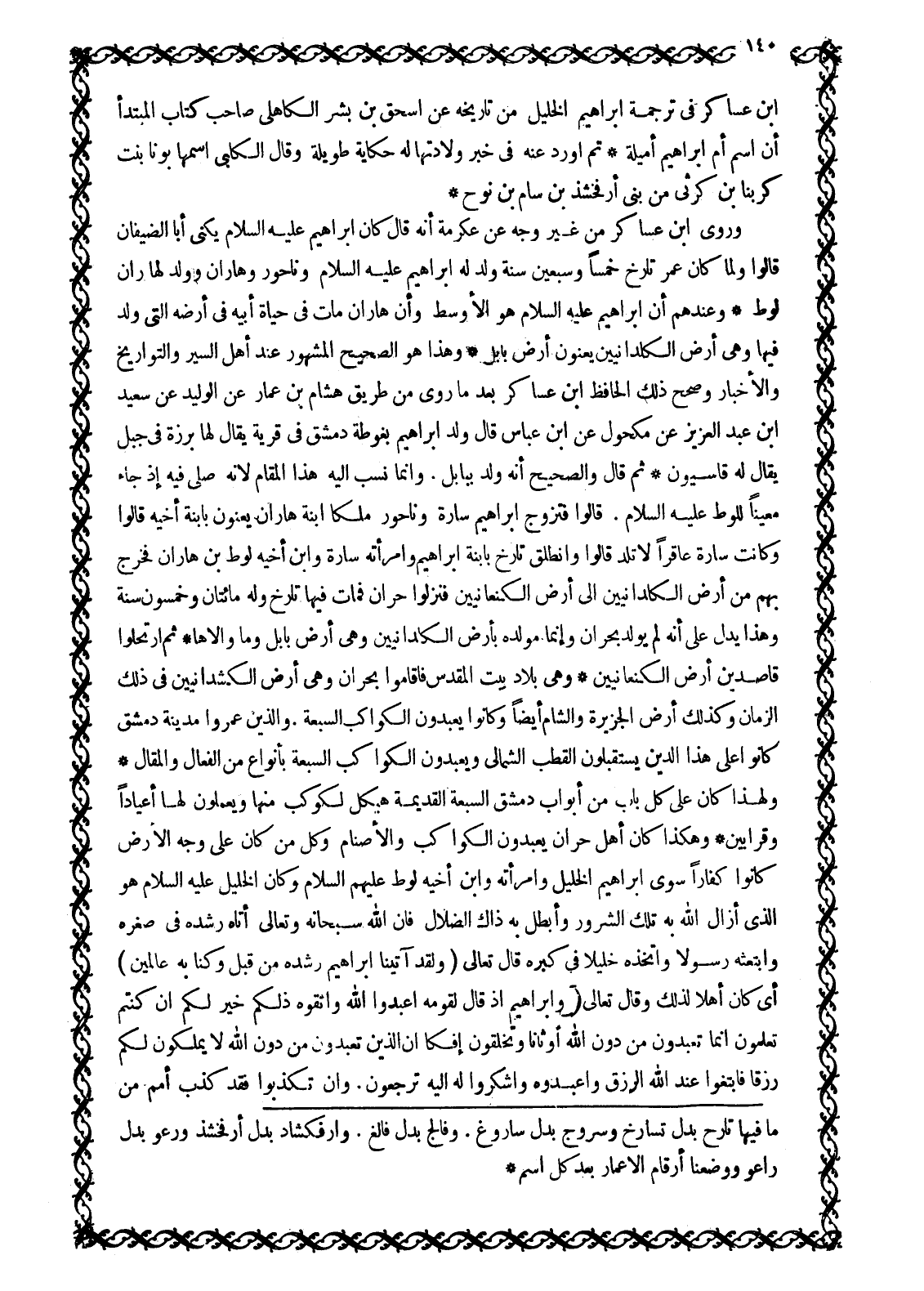 ابْنُ عَسَاكِرَ فِي تَرْجَمَةِ إِبْرَاهِيمَ الْخَلِيلِ مِنْ تَارِيخِهِ عَنْ إِسْحَاقَ بْنِ بِشْرٍ الْكَاهِلِيِّ صَاحِبِ كِتَابِ الْمُبْتَدَأِ أَنَّ اسْمَ أُمِّ إِبْرَاهِيمَ أُمَيْلَةُ ثُمَّ أَوْرَدَ عَنْهُ فِي خَبَرِ وِلَادَتِهَا لَهُ حكاية طويلة وقال الكلبي اسمها بونا بنت كربنا بن كرثى من بنى أرفخشذ بْنِ سَامِ بْنِ نُوحٍ وَرَوَى ابْنُ عَسَاكِرَ مِنْ غَيْرِ وَجْهٍ عَنْ عِكْرِمَةَ أَنَّهُ قَالَ كَانَ إِبْرَاهِيمُ عَلَيْهِ السَّلَامُ يُكْنَى أَبَا الضِّيفَانِ قَالُوا وَلَمَّا كَانَ عُمُرُ تَارَخَ خَمْسًا وَسَبْعِينَ سَنَةً وُلِدَ لَهُ إِبْرَاهِيمُ عَلَيْهِ السَّلَامُ وَنَاحُورُ وهاران وولد لها ران لُوطٌ وَعِنْدَهُمْ أَنَّ إِبْرَاهِيمَ عَلَيْهِ السَّلَامُ هُوَ الْأَوْسَطُ وَأَنَّ هَارَانَ مَاتَ فِي حَيَاةِ أَبِيهِ فِي أَرْضِهِ الَّتِي وُلِدَ فِيهَا وَهِيَ أَرْضُ الْكَلْدَانِيِّينَ يَعْنُونَ أَرْضَ بَابِلَ وَهَذَا هُوَ الصَّحِيحُ الْمَشْهُورُ عِنْدَ أَهْلِ السِّيَرِ وَالتَّوَارِيخِ وَالْأَخْبَارِ وَصَحَّحَ ذلك الحافظ ابن عساكر بعد ما رَوَى مِنْ طَرِيقِ هِشَامِ بْنِ عَمَّارٍ عَنِ الوليد عن سعيد ابن عَبْدِ الْعَزِيزِ عَنْ مَكْحُولٍ عَنِ ابْنِ عَبَّاسٍ قَالَ وُلِدَ إِبْرَاهِيمُ بِغُوطَةِ دِمَشْقَ فِي قَرْيَةٍ يُقَالُ لَهَا بَرْزَةُ فِي جَبَلٍ يُقَالُ لَهُ قَاسِيُونَ ثُمَّ قَالَ وَالصَّحِيحُ أَنَّهُ وُلِدَ بِبَابِلَ. وَإِنَّمَا نُسِبَ إِلَيْهِ هَذَا الْمَقَامُ لِأَنَّهُ صَلَّى فِيهِ إِذْ جَاءَ مُعِينًا لِلُوطٍ عَلَيْهِ السَّلَامُ. قَالُوا فَتَزَوَّجَ إِبْرَاهِيمُ سَارَةَ وَنَاحُورُ مَلْكَا ابْنَةَ هَارَانَ يَعْنُونَ بِابْنَةِ أَخِيهِ قَالُوا وَكَانَتْ سَارَةُ عَاقِرًا لَا تَلِدُ قَالُوا وَانْطَلَقَ تَارَخُ بِابْنِهِ إِبْرَاهِيمَ وَامْرَأَتِهِ سَارَةَ وَابْنِ أَخِيهِ لُوطِ بْنِ هَارَانَ فَخَرَجَ بِهِمْ مِنْ أَرْضِ الْكَلْدَانِيِّينَ إِلَى أَرْضِ الْكَنْعَانِيِّينَ فَنَزَلُوا حَرَّانَ فَمَاتَ فِيهَا تَارَخُ وَلَهُ مِائَتَانِ وَخَمْسُونَ سَنَةً وَهَذَا يَدُلُّ عَلَى أَنَّهُ لَمْ يُولَدْ بِحَرَّانَ وَإِنَّمَا مَوْلِدُهُ بِأَرْضِ الْكَلْدَانِيِّينَ وَهِيَ أَرْضُ بَابِلَ وَمَا وَالَاهَا ثُمَّ ارتحلوا قاصد بن أَرْضَ الْكَنْعَانِيِّينَ وَهِيَ بِلَادُ بَيْتِ الْمَقْدِسِ فَأَقَامُوا بِحَرَّانَ وَهِيَ أَرْضُ الْكَشْدَانِيِّينَ فِي ذَلِكَ الزَّمَانِ وَكَذَلِكَ أَرْضُ الْجَزِيرَةِ وَالشَّامِ أَيْضًا وَكَانُوا يَعْبُدُونَ الْكَوَاكِبَ السَّبْعَةَ. وَالَّذِينَ عَمَّرُوا مَدِينَةَ دِمَشْقَ كَانُوا عَلَى هَذَا الدِّينِ يَسْتَقْبِلُونَ الْقُطْبَ الشَّمَالِيَّ وَيَعْبُدُونَ الْكَوَاكِبَ السَّبْعَةَ بِأَنْوَاعٍ مِنَ الْفَعَالِ وَالْمَقَالِ وَلِهَذَا كَانَ عَلَى كُلِّ بَابٍ مِنْ أَبْوَابِ دِمَشْقَ السَّبْعَةِ الْقَدِيمَةِ هَيْكَلٌ لِكَوْكَبٍ مِنْهَا وَيَعْمَلُونَ لَهَا أَعْيَادًا وَقَرَابِينَ وَهَكَذَا كَانَ أَهْلُ حَرَّانَ يَعْبُدُونَ الْكَوَاكِبَ وَالْأَصْنَامَ وَكُلُّ مَنْ كَانَ عَلَى وَجْهِ الْأَرْضِ كَانُوا كُفَّارًا سِوَى إِبْرَاهِيمَ الْخَلِيلِ وَامْرَأَتِهِ وَابْنِ أَخِيهِ لُوطٍ عَلَيْهِمُ السَّلَامُ وَكَانَ الْخَلِيلُ عَلَيْهِ السَّلَامُ هُوَ الَّذِي أَزَالَ اللَّهُ بِهِ تِلْكَ الشُّرُورَ وَأَبْطَلَ بِهِ ذَاكَ الضَّلَالَ فَإِنَّ اللَّهَ سُبْحَانَهُ وَتَعَالَى آتَاهُ رُشْدَهُ فِي صِغَرِهِ وَابْتَعَثَهُ رَسُولًا وَاتَّخَذَهُ خَلِيلًا فِي كِبَرِهِ قَالَ تَعَالَى وَلَقَدْ آتَيْنا إِبْراهِيمَ رُشْدَهُ مِنْ قَبْلُ وَكُنَّا به عالِمِينَ 21: 51 أَيْ كَانَ أَهْلًا لِذَلِكَ وَقَالَ تَعَالَى وَإِبْراهِيمَ إِذْ قَالَ لِقَوْمِهِ اعْبُدُوا اللَّهَ وَاتَّقُوهُ ذلِكُمْ خ