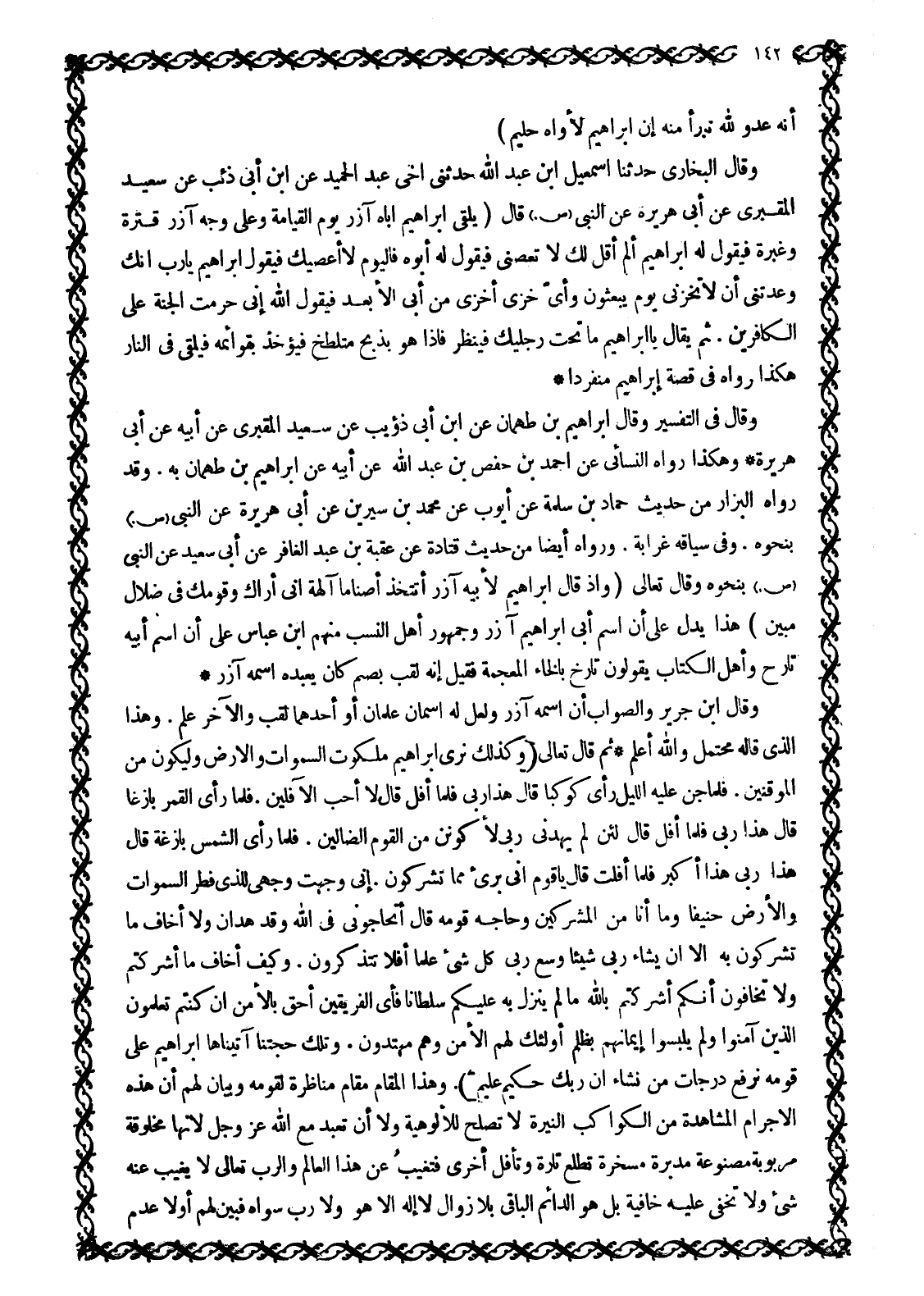 أَنَّهُ عَدُوٌّ لِلَّهِ تَبَرَّأَ مِنْهُ إِنَّ إِبْراهِيمَ لَأَوَّاهٌ حَلِيمٌ 9: 114 وقال البخاري حدثنا إسماعيل ابن عَبْدِ اللَّهِ حَدَّثَنِي أَخِي عَبْدُ الْحَمِيدِ عَنِ ابْنِ أَبِي ذِئْبٍ عَنْ سَعِيدٍ الْمَقْبُرِيِّ عَنْ أَبِي هُرَيْرَةَ عَنِ النَّبِيِّ صَلَّى اللَّهُ عَلَيْهِ وَسَلَّمَ قَالَ (يَلْقَى إِبْرَاهِيمُ أَبَاهُ آزَرَ يَوْمَ القيامة وعلى وجه آزر قترة وغيرة فَيَقُولُ لَهُ إِبْرَاهِيمُ أَلَمْ أَقُلْ لَكَ لَا تَعْصِنِي فَيَقُولُ لَهُ أَبُوهُ فَالْيَوْمَ لَا أَعْصِيكَ فَيَقُولُ إِبْرَاهِيمُ يَا رَبِّ إِنَّكَ وَعَدْتَنِي أَنْ لَا تُخْزِنِي يَوْمَ يُبْعَثُونَ وَأَيُّ خِزْيٍ أَخْزَى مِنْ أَبِي الْأَبْعَدِ فَيَقُولُ اللَّهُ إِنِّي حَرَّمْتُ الْجَنَّةَ عَلَى الْكَافِرِينَ. ثُمَّ يُقَالُ يَا إِبْرَاهِيمُ ما تحت رجليك فينظر فإذا هو بذبح مُتَلَطِّخٍ فَيُؤْخَذُ بِقَوَائِمِهِ فَيُلْقَى فِي النَّارِ هَكَذَا رَوَاهُ فِي قِصَّةِ إِبْرَاهِيمَ مُنْفَرِدًا وَقَالَ فِي التَّفْسِيرِ وَقَالَ إِبْرَاهِيمُ بْنُ طَهْمَانَ عَنِ ابْنِ أبى ذؤيب عَنْ سَعِيدٍ الْمَقْبُرِيِّ عَنْ أَبِيهِ عَنْ أَبِي هُرَيْرَةَ وَهَكَذَا رَوَاهُ النَّسَائِيُّ عَنْ أَحْمَدَ بْنِ حَفْصِ بْنِ عَبْدِ اللَّهِ عَنْ أَبِيهِ عَنْ إِبْرَاهِيمَ بْنِ طَهْمَانَ بِهِ. وَقَدْ رَوَاهُ الْبَزَّارُ مِنْ حَدِيثِ حَمَّادِ بْنِ سَلَمَةَ عَنْ أَيُّوبَ عَنْ مُحَمَّدِ بْنِ سِيرِينَ عَنْ أَبِي هُرَيْرَةَ عَنِ النَّبِيِّ صَلَّى اللَّهُ عَلَيْهِ وَسَلَّمَ بِنَحْوِهِ. وَفِي سِيَاقِهِ غَرَابَةٌ. وَرَوَاهُ أَيْضًا مِنْ حَدِيثِ قَتَادَةَ عَنْ عُقْبَةَ بْنِ عَبْدِ الْغَافِرِ عَنْ أَبِي سَعِيدٍ عَنِ النَّبِيِّ صَلَّى اللَّهُ عَلَيْهِ وَسَلَّمَ بِنَحْوِهِ وَقَالَ تَعَالَى وَإِذْ قَالَ إِبْراهِيمُ لِأَبِيهِ آزَرَ أَتَتَّخِذُ أَصْناماً آلِهَةً إِنِّي أَراكَ وَقَوْمَكَ في ضَلالٍ مُبِينٍ 6: 74 هَذَا يَدُلُّ عَلَى أَنَّ اسْمَ أَبِي إِبْرَاهِيمَ آزَرُ وَجُمْهُورُ أَهْلِ النَّسَبِ مِنْهُمُ ابْنُ عَبَّاسٍ عَلَى أَنَّ اسْمَ أَبِيهِ تَارَحُ وَأَهْلُ الْكِتَابِ يَقُولُونَ تَارَخُ بِالْخَاءِ الْمُعْجَمَةِ فَقِيلَ إِنَّهُ لُقِّبَ بِصَنَمٍ كَانَ يَعْبُدُهُ اسْمُهُ آزَرُ وَقَالَ ابْنُ جَرِيرٍ وَالصَّوَابُ أَنَّ اسْمَهُ آزَرُ وَلَعَلَّ لَهُ اسْمَانِ عَلَمَانِ أَوْ أَحَدُهُمَا لَقَبٌ وَالْآخَرُ عَلَمٌ. وَهَذَا الَّذِي قَالَهُ مُحْتَمَلٌ وَاللَّهُ أَعْلَمُ ثُمَّ قَالَ تَعَالَى وَكَذلِكَ نُرِي إِبْراهِيمَ مَلَكُوتَ السَّماواتِ وَالْأَرْضِ وَلِيَكُونَ مِنَ الْمُوقِنِينَ. فَلَمَّا جَنَّ عَلَيْهِ اللَّيْلُ رَأى كَوْكَباً قَالَ هَذَا رَبِّي فَلَمَّا أَفَلَ قَالَ لَا أُحِبُّ الْآفِلِينَ. فَلَمَّا رَأَى الْقَمَرَ بازِغاً قَالَ هَذَا رَبِّي فَلَمَّا أَفَلَ قَالَ لَئِنْ لَمْ يَهْدِنِي رَبِّي لَأَكُونَنَّ مِنَ الْقَوْمِ الضَّالِّينَ. فَلَمَّا رَأَى الشَّمْسَ بازِغَةً قَالَ هَذَا رَبِّي هَذَا أَكْبَرُ فَلَمَّا أَفَلَتْ قَالَ يَا قَوْمِ إِنِّي بَرِيءٌ مِمَّا تُشْرِكُونَ. إِنِّي وَجَّهْتُ وَجْهِيَ لِلَّذِي فَطَرَ السَّماواتِ وَالْأَرْضَ حَنِيفاً وَما أَنَا مِنَ الْمُشْرِكِينَ وَحاجَّهُ قَوْمُهُ قَالَ أَتُحاجُّونِّي فِي اللَّهِ وَقَدْ هَدانِ وَلا أَخافُ مَا تُشْرِكُونَ بِهِ إِلَّا أَنْ يَشاءَ رَبِّي شَيْئاً وَسِعَ رَبِّي كُلَّ شَيْءٍ عِلْماً أَفَلا تَتَذَكَّرُونَ. وَكَيْفَ أَخافُ مَا أَشْرَكْتُمْ وَلا تَخافُونَ أَنَّكُمْ أَشْرَكْتُمْ بِاللَّهِ مَا لَمْ يُنَزِّلْ بِهِ عَلَيْكُمْ سُلْطاناً فَأَيُّ الْفَرِيقَيْنِ أَحَقُّ بِالْأَمْنِ إِنْ كُنْتُمْ تَعْلَمُونَ الَّذِينَ آمَنُوا وَلَمْ يَلْبِسُوا إِيمانَهُمْ بِظُلْمٍ أُولئِكَ لَهُمُ الْأَمْنُ وَهُمْ مُهْتَدُو