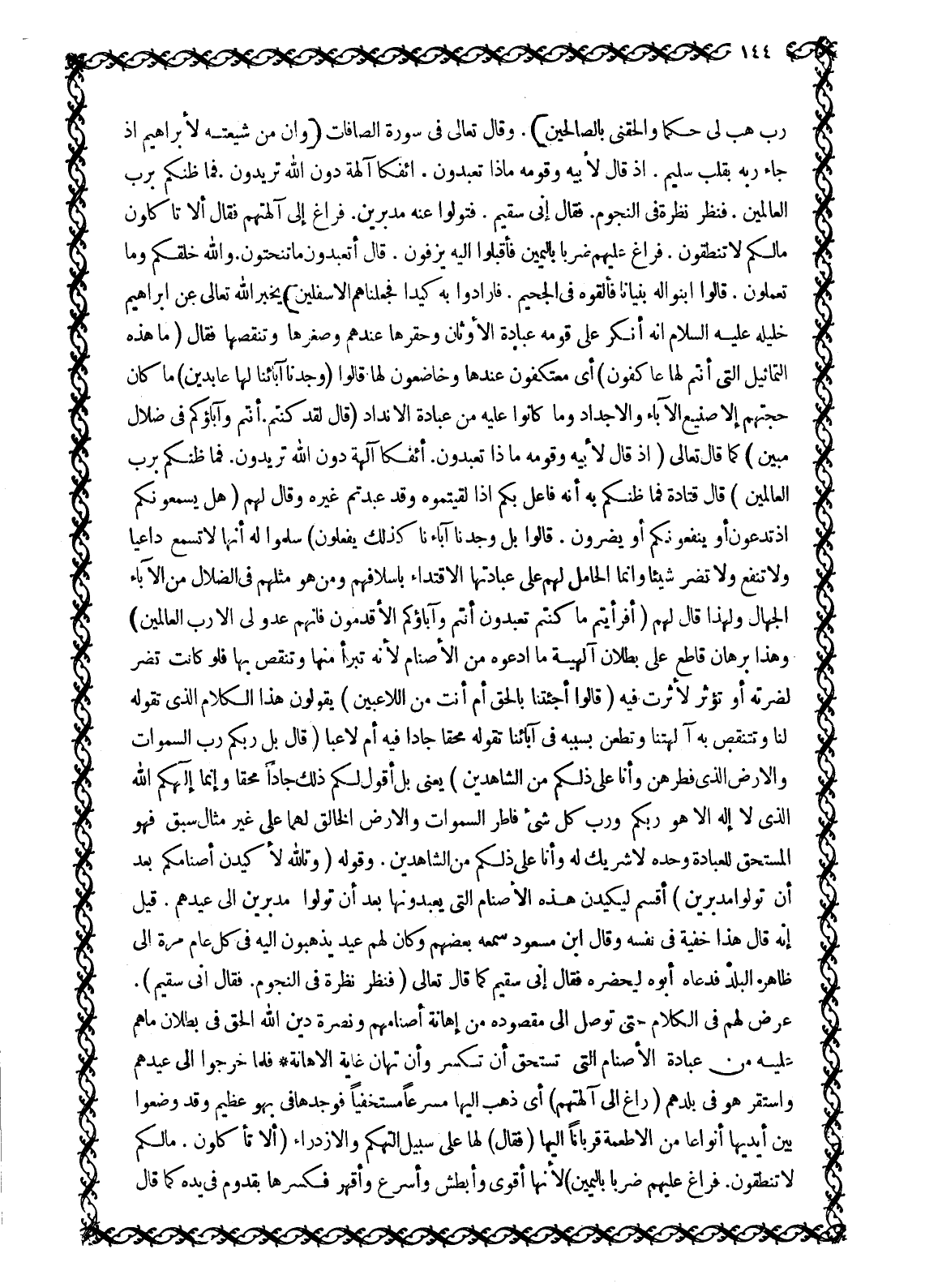 رَبِّ هَبْ لِي حُكْماً وَأَلْحِقْنِي بِالصَّالِحِينَ 26: 69- 83. وَقَالَ تَعَالَى فِي سُورَةِ الصَّافَّاتِ وَإِنَّ مِنْ شِيعَتِهِ لَإِبْراهِيمَ إِذْ جاءَ رَبَّهُ بِقَلْبٍ سَلِيمٍ. إِذْ قال لِأَبِيهِ وَقَوْمِهِ ماذا تَعْبُدُونَ. أَإِفْكاً آلِهَةً دُونَ اللَّهِ تُرِيدُونَ. فَما ظَنُّكُمْ بِرَبِّ الْعالَمِينَ. فَنَظَرَ نَظْرَةً فِي النُّجُومِ. فَقالَ إِنِّي سَقِيمٌ. فَتَوَلَّوْا عَنْهُ مُدْبِرِينَ. فَراغَ إِلى آلِهَتِهِمْ فَقالَ أَلا تَأْكُلُونَ مَا لَكُمْ لَا تَنْطِقُونَ. فَراغَ عَلَيْهِمْ ضَرْباً بِالْيَمِينِ فَأَقْبَلُوا إِلَيْهِ يَزِفُّونَ. قَالَ أَتَعْبُدُونَ مَا تَنْحِتُونَ. وَالله خَلَقَكُمْ وَما تَعْمَلُونَ. قالُوا ابْنُوا لَهُ بُنْياناً فَأَلْقُوهُ فِي الْجَحِيمِ. فَأَرادُوا به كَيْداً فَجَعَلْناهُمُ الْأَسْفَلِينَ 37: 83- 98 يُخْبِرُ اللَّهُ تَعَالَى عَنْ إِبْرَاهِيمَ خَلِيلِهِ عَلَيْهِ السَّلَامُ أَنَّهُ أَنْكَرَ عَلَى قَوْمِهِ عِبَادَةَ الْأَوْثَانِ وَحَقَّرَهَا عِنْدَهُمْ وَصَغَّرَهَا وَتَنَقَّصَهَا فَقَالَ (مَا هذِهِ التَّماثِيلُ الَّتِي أَنْتُمْ لَها عاكِفُونَ) 21: 52 أَيْ مُعْتَكِفُونَ عِنْدَهَا وَخَاضِعُونَ لَهَا قَالُوا (وَجَدْنا آباءَنا لَها عابِدِينَ) 21: 53 مَا كَانَ حُجَّتَهُمْ إِلَّا صَنِيعُ الْآبَاءِ وَالْأَجْدَادِ وَمَا كَانُوا عَلَيْهِ مِنْ عِبَادَةِ الْأَنْدَادِ (قَالَ لَقَدْ كُنْتُمْ. أَنْتُمْ وَآباؤُكُمْ فِي ضَلالٍ مُبِينٍ) 21: 54 كَمَا قَالَ تَعَالَى إِذْ قَالَ لِأَبِيهِ وَقَوْمِهِ ماذا تَعْبُدُونَ. أَإِفْكاً آلِهَةً دُونَ اللَّهِ تُرِيدُونَ. فَما ظَنُّكُمْ بِرَبِّ الْعالَمِينَ 37: 85- 87 قَالَ قَتَادَةُ فَمَا ظَنُّكُمْ بِهِ أَنَّهُ فَاعِلٌ بِكُمْ إِذَا لَقِيتُمُوهُ وَقَدْ عَبَدْتُمْ غَيْرَهُ وَقَالَ لَهُمْ (هَلْ يَسْمَعُونَكُمْ إِذْ تَدْعُونَ أَوْ يَنْفَعُونَكُمْ أَوْ يَضُرُّونَ. قالُوا بَلْ وَجَدْنا آباءَنا كَذلِكَ يَفْعَلُونَ) 26: 72- 74 سَلَّمُوا لَهُ أَنَّهَا لَا تَسْمَعُ دَاعِيًا وَلَا تَنْفَعُ وَلَا تَضُرُّ شَيْئًا وَإِنَّمَا الْحَامِلُ لَهُمْ عَلَى عِبَادَتِهَا الِاقْتِدَاءُ بِأَسْلَافِهِمْ وَمَنْ هُوَ مِثْلُهُمْ فِي الضَّلَالِ مِنَ الْآبَاءِ الْجُهَّالِ وَلِهَذَا قَالَ لَهُمْ (أَفَرَأَيْتُمْ مَا كُنْتُمْ تَعْبُدُونَ أَنْتُمْ وَآباؤُكُمُ الْأَقْدَمُونَ فَإِنَّهُمْ عَدُوٌّ لِي إِلَّا رَبَّ الْعالَمِينَ) 26: 75- 77 وَهَذَا بُرْهَانٌ قَاطِعٌ عَلَى بُطْلَانِ إِلَهِيَّةِ مَا ادَّعَوْهُ مِنَ الْأَصْنَامِ لِأَنَّهُ تَبَرَّأَ مِنْهَا وَتَنَقَّصَ بِهَا فَلَوْ كَانَتْ تَضُرُّ لَضَرَّتْهُ أَوْ تُؤَثِّرُ لَأَثَّرَتْ فِيهِ (قالُوا أَجِئْتَنا بِالْحَقِّ أَمْ أَنْتَ من اللَّاعِبِينَ) 21: 55 يقولون هذا الكلام الّذي تقوله لنا وتتنقص بِهِ آلِهَتَنَا وَتَطْعَنُ بِسَبَبِهِ فِي آبَائِنَا تَقُولُهُ مُحِقًّا جَادًّا فِيهِ أَمْ لَاعِبًا (قَالَ بَلْ رَبُّكُمْ رَبُّ السَّماواتِ وَالْأَرْضِ الَّذِي فَطَرَهُنَّ وَأَنَا عَلى ذلِكُمْ من الشَّاهِدِينَ) 21: 56 يَعْنِي بَلْ أَقُولُ لَكُمْ ذَلِكَ جَادًّا مُحِقًّا وَإِنَّمَا إِلَهُكُمُ اللَّهُ الَّذِي لَا إِلَهَ إِلَّا هو ربكم ورب كل شيء فاطر السموات وَالْأَرْضِ الْخَالِقُ لَهُمَا عَلَى غَيْرِ مِثَالٍ سَبَقَ فَهُوَ الْمُسْتَحِقُّ لِلْعِبَادَةِ وَحْدَهُ لَا شَرِيكَ لَهُ وَأَنَا عَلَى ذَلِكُمْ مِنَ الشَّاهِدِينَ. وَقَوْلُهُ (وَتَاللَّهِ لَأَكِيدَنَّ أَصْنامَكُمْ بَعْدَ أَنْ تُوَلُّوا مُدْبِرِينَ) 21: 57 أَقْسَمَ لَيَكِيدَنَّ هَذِهِ الْأَصْنَامَ الَّتِي يَعْبُدُونَهَا بَعْدَ أَنْ تَوَلَّوْا مُدْبِرِينَ إِلَى عِيدِهِمْ. قِيلَ إِنَّهُ قَالَ هَذَا خُفْيَةً فِي نَفْسِهِ وَقَالَ ابْنُ مَسْعُودٍ سَمِعَهُ بَعْضُهُمْ وَكَانَ لَهُمْ عِيدٌ يَذْهَبُونَ إ