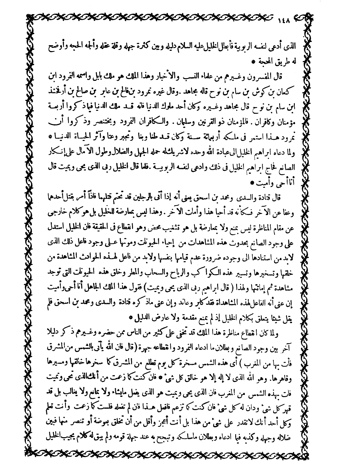 الَّذِي ادَّعَى لِنَفْسِهِ الرُّبُوبِيَّةِ فَأَبْطَلَ الْخَلِيلُ عَلَيْهِ السَّلَامُ دَلِيلَهُ وَبَيَّنَ كَثْرَةَ جَهْلِهِ وَقِلَّةَ عَقْلِهِ وَأَلْجَمَهُ الْحُجَّةَ وَأَوْضَحَ لَهُ طَرِيقَ الْمَحَجَّةِ قَالَ الْمُفَسِّرُونَ وَغَيْرُهُمْ مِنْ عُلَمَاءِ النَّسَبِ وَالْأَخْبَارِ وَهَذَا الملك هو ملك بابل واسمه النمرود ابن كَنْعَانَ بْنِ كُوشِ بْنِ سَامِ بْنِ نُوحٍ قَالَهُ مُجَاهِدٌ. وَقَالَ غَيْرُهُ نُمْرُودُ بْنُ فَالِحِ بن عابر بن صالح بن أرفخشذ ابن سَامِ بْنِ نُوحٍ قَالَ مُجَاهِدٌ وَغَيْرُهُ وَكَانَ أَحَدَ مُلُوكِ الدُّنْيَا فَإِنَّهُ قَدْ مَلَكَ الدُّنْيَا فِيمَا ذَكَرُوا أَرْبَعَةٌ مُؤْمِنَانِ وَكَافِرَانِ. فَالْمُؤْمِنَانِ ذُو القرنين وسليمان. والكافران النمرود وبخت نصّر وذكروا أن نمرود هَذَا اسْتَمَرَّ فِي مُلْكِهِ أَرْبَعَمِائَةِ سَنَةٍ وَكَانَ قَدْ طَغَا وَبَغَا وَتَجَبَّرَ وَعَتَا وَآثَرَ الْحَيَاةَ الدُّنْيَا وَلَمَّا دَعَاهُ إِبْرَاهِيمُ الْخَلِيلُ إِلَى عِبَادَةِ اللَّهِ وَحْدَهُ لَا شَرِيكَ لَهُ حَمَلَهُ الْجَهْلُ والضلال وطول الآمال عَلَى إِنْكَارِ الصَّانِعِ فَحَاجَّ إِبْرَاهِيمَ الْخَلِيلَ فِي ذلك وادعى لنفسه الربوبية. فلما قال الْخَلِيلُ رَبِّيَ الَّذِي يُحْيِي وَيُمِيتُ قَالَ أَنَا أُحْيِي وَأُمِيتُ 2: 258 قَالَ قَتَادَةُ وَالسُّدِّيُّ وَمُحَمَّدُ بْنُ إِسْحَاقَ يَعْنِي أَنَّهُ إِذَا أُتِيَ بِالرَّجُلَيْنِ قَدْ تَحَتَّمَ قَتْلُهُمَا فَإِذَا أَمَرَ بِقَتْلِ أَحَدِهِمَا وَعَفَا عَنِ الْآخَرِ فَكَأَنَّهُ قَدْ أَحْيَا هَذَا وَأَمَاتَ الْآخَرَ. وَهَذَا لَيْسَ بِمُعَارَضَةٍ لِلْخَلِيلِ بَلْ هُوَ كَلَامٌ خَارِجِيٌّ عَنْ مَقَامِ الْمُنَاظَرَةِ لَيْسَ بِمَنْعٍ وَلَا بِمُعَارَضَةٍ بَلْ هُوَ تَشْغِيبٌ مَحْضٌ وَهُوَ انْقِطَاعٌ فِي الْحَقِيقَةِ فَإِنَّ الْخَلِيلَ اسْتَدَلَّ عَلَى وُجُودِ الصَّانِعِ بحدوث هذه المشاهدات من إحياء الحيونات وَمَوْتِهَا عَلَى وُجُودِ فَاعِلِ ذَلِكَ الَّذِي لَا بد من استنادها الى وجوده ضرورة عدم قِيَامِهَا بِنَفْسِهَا وَلَا بُدَّ مِنْ فَاعِلٍ لِهَذِهِ الْحَوَادِثِ الْمُشَاهَدَةِ مِنْ خَلْقِهَا وَتَسْخِيرِهَا وَتَسْيِيرِ هَذِهِ الكواكب والرياح والسحاب والمطر وخلق هذه الحيونات الَّتِي تُوجَدُ مُشَاهَدَةً ثُمَّ إِمَاتَتِهَا وَلِهَذَا (قَالَ إِبْراهِيمُ رَبِّيَ الَّذِي يُحْيِي وَيُمِيتُ) 2: 258 فَقَوْلُ هَذَا الْمَلِكِ الْجَاهِلِ أَنَا أُحْيِي وَأُمِيتُ 2: 258 إِنْ عَنَى أَنَّهُ الْفَاعِلُ لِهَذِهِ الْمُشَاهَدَاتِ فَقَدْ كَابَرَ وَعَانَدَ وَإِنْ عَنَى مَا ذَكَرَهُ قَتَادَةُ وَالسُّدِّيُّ وَمُحَمَّدُ بْنُ إِسْحَاقَ فَلَمْ يَقُلْ شَيْئًا يَتَعَلَّقُ بِكَلَامِ الْخَلِيلِ إِذْ لَمْ يَمْنَعْ مُقَدِّمَةً وَلَا عَارَضَ الدَّلِيلَ وَلَمَّا كَانَ انْقِطَاعُ مُنَاظَرَةِ هَذَا الْمَلِكِ قَدْ تَخْفَى عَلَى كَثِيرٍ مِنَ النَّاسِ مِمَّنْ حَضَرَهُ وَغَيْرِهِمْ ذَكَرَ دَلِيلًا آخَرَ بَيَّنَ وُجُودَ الصَّانِعِ وَبُطْلَانَ مَا ادَّعَاهُ النُّمْرُودُ وَانْقِطَاعَهُ جَهْرَةً (قَالَ فَإِنَّ اللَّهَ يَأْتِي بِالشَّمْسِ من الْمَشْرِقِ فَأْتِ بِها من الْمَغْرِبِ) 2: 258 أَيْ هَذِهِ الشَّمْسُ مُسَخَّرَةٌ كُلَّ يَوْمٍ تَطْلُعُ مِنَ الْمَشْرِقِ كَمَا سَخَّرَهَا خَالِقُهَا وَمُسَيِّرُهَا وَقَاهِرُهَا. وَهُوَ اللَّهُ الَّذِي لَا إِلَهَ إِلَّا هُوَ خَالِقُ كُلِّ شَيْءٍ فَإِنْ كُنْتَ كَمَا زَعَمْتَ مِنْ أَنَّكَ الَّذِي تُحْيِي وَتُمِيتُ فَأْتِ بِهَذِهِ الشَّمْسِ مِنَ الْمَغْرِبِ فَإِنَّ الَّذِي يُحْيِي وَيُمِيتُ هُوَ الَّذِي يَفْعَلُ مَا يَشَاءُ وَلَا يُمَانَعُ وَلَا يُغَالَبُ بَلْ قَدْ قَهَرَ كُلَّ شَيْءٍ وَدَانَ لَهُ كُلُّ شَيْءٍ فَإِنْ كُنْتَ كَمَا تَزْعُ