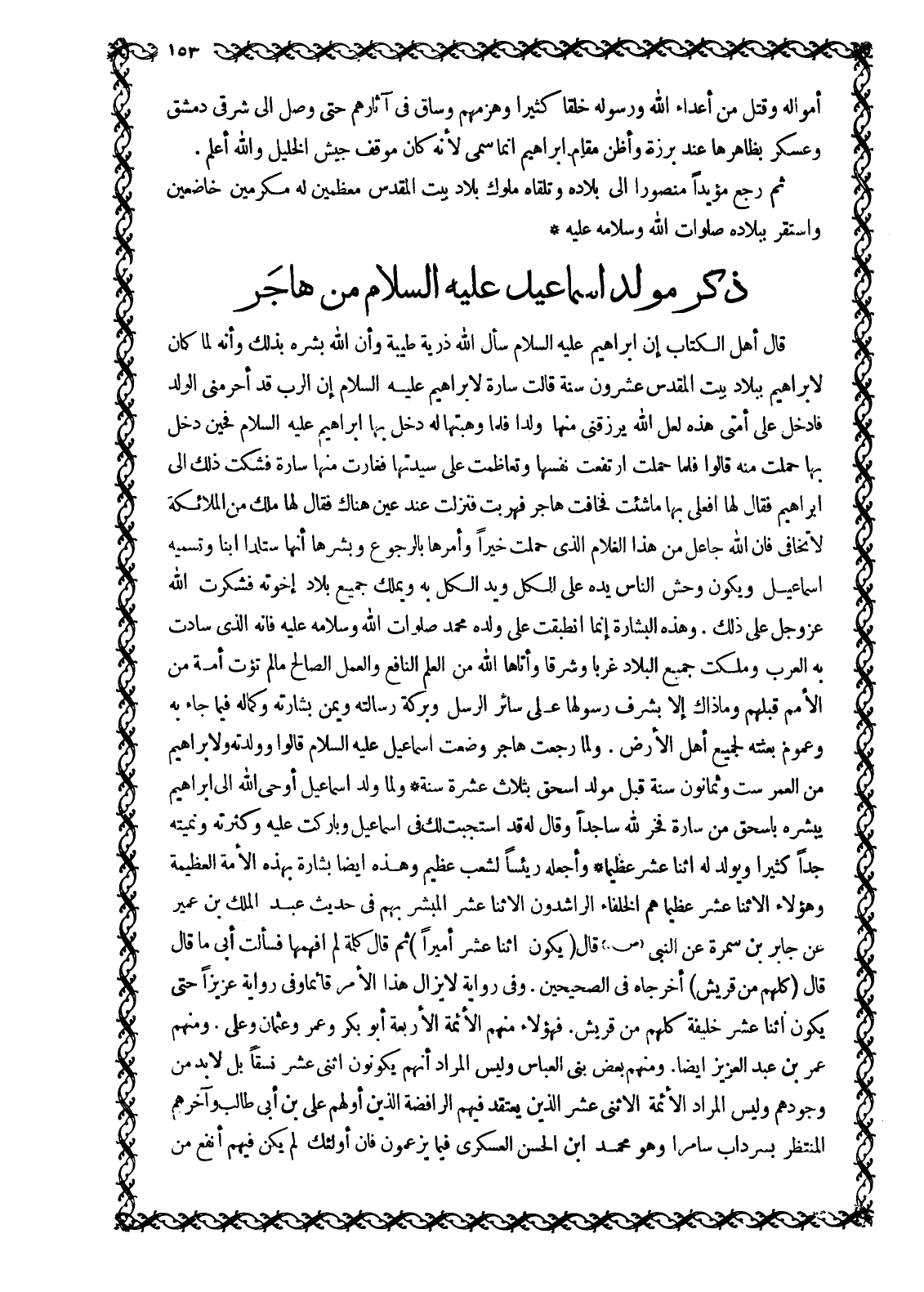 قَالَ أَهْلُ الْكِتَابِ إِنَّ إِبْرَاهِيمَ عَلَيْهِ السَّلَامُ سَأَلَ اللَّهَ ذُرِّيَّةً طَيِّبَةً وَأَنَّ اللَّهَ بَشَّرَهُ بِذَلِكَ وَأَنَّهُ لَمَّا كَانَ لِإِبْرَاهِيمَ ببلاد بيت المقدس عشرون سنة قَالَتْ سَارَةُ لِإِبْرَاهِيمَ عَلَيْهِ السَّلَامُ إِنَّ الرَّبَّ قَدْ أَحْرَمَنِي الْوَلَدَ فَادْخُلْ عَلَى أَمَتِي هَذِهِ لعل الله يرزقني مِنْهَا وَلَدًا فَلَمَّا وَهَبَتْهَا لَهُ دَخَلَ بِهَا إِبْرَاهِيمُ عَلَيْهِ السَّلَامُ فَحِينَ دَخَلَ بِهَا حَمَلَتْ مِنْهُ قَالُوا فَلَمَّا حَمَلَتِ ارْتَفَعَتْ نَفْسُهَا وَتَعَاظَمَتْ عَلَى سَيِّدَتِهَا فَغَارَتْ مِنْهَا سَارَةُ فَشَكَتْ ذَلِكَ إِلَى إِبْرَاهِيمَ فَقَالَ لَهَا افْعَلِي بِهَا مَا شِئْتِ فَخَافَتْ هَاجَرُ فَهَرَبَتْ فَنَزَلَتْ عِنْدَ عَيْنٍ هُنَاكَ فَقَالَ لَهَا مَلَكٌ مِنَ الْمَلَائِكَةِ لَا تَخَافِي فَإِنَّ اللَّهَ جَاعِلٌ مِنْ هَذَا الْغُلَامِ الَّذِي حَمَلْتِ خَيْرًا وَأَمَرَهَا بِالرُّجُوعِ وَبَشَّرَهَا أَنَّهَا سَتَلِدُ ابْنًا وَتُسَمِّيهِ إِسْمَاعِيلَ وَيَكُونُ وَحْشَ النَّاسِ يَدُهُ عَلَى الْكُلِّ وَيَدُ الْكُلِّ بِهِ وَيَمْلِكُ جَمِيعَ بِلَادِ إِخْوَتِهِ فَشَكَرَتِ اللَّهَ عَزَّ وَجَلَّ عَلَى ذَلِكَ. وَهَذِهِ الْبِشَارَةُ إِنَّمَا انْطَبَقَتْ عَلَى وَلَدِهِ مُحَمَّدٍ صَلَوَاتُ اللَّهِ وَسَلَامُهُ عَلَيْهِ فَإِنَّهُ الَّذِي سَادَتْ بِهِ الْعَرَبُ وَمَلَكَتْ جَمِيعَ الْبِلَادِ غَرْبًا وَشَرْقًا وَأَتَاهَا اللَّهُ مِنَ الْعِلْمِ النَّافِعِ والعمل الصالح ما لم تؤت أُمَّةً مِنَ الْأُمَمِ قَبْلَهُمْ وَمَا ذَاكَ إِلَّا بِشَرَفِ رَسُولِهَا عَلَى سَائِرِ الرُّسُلِ وَبَرَكَةِ رِسَالَتِهِ وَيُمْنِ بِشَارَتِهِ وَكَمَالِهِ فِيمَا جَاءَ بِهِ وَعُمُومِ بَعْثَتِهِ لِجَمِيعِ أَهْلِ الْأَرْضِ. وَلَمَّا رَجَعَتْ هَاجَرُ وضعت إسماعيل عليه السلام قالوا وولدته وَلِإِبْرَاهِيمَ مِنَ الْعُمُرِ سِتٌّ وَثَمَانُونَ سَنَةً قَبْلَ مَوْلِدِ إِسْحَاقَ بِثَلَاثَ عَشْرَةَ سَنَةً وَلَمَّا وُلِدَ إِسْمَاعِيلُ أَوْحَى اللَّهُ إِلَى إِبْرَاهِيمَ يُبَشِّرُهُ بِإِسْحَاقَ مِنْ سَارَةَ فَخَرَّ للَّه سَاجِدًا وَقَالَ لَهُ قَدِ اسْتَجَبْتُ لَكَ فِي إِسْمَاعِيلَ وَبَارَكْتُ عَلَيْهِ وكثرته ونميته جدا كثيرا وَيُولَدُ لَهُ اثْنَا عَشَرَ عَظِيمًا وَأَجْعَلُهُ رَئِيسًا لِشَعْبٍ عَظِيمٍ وَهَذِهِ أَيْضًا بِشَارَةٌ بِهَذِهِ الْأُمَّةِ الْعَظِيمَةِ وَهَؤُلَاءِ الِاثْنَا عَشَرَ عَظِيمًا هُمُ الْخُلَفَاءُ الراشدون الِاثْنَا عَشَرَ الْمُبَشَّرُ بِهِمْ فِي حَدِيثِ عَبْدِ الْمَلِكِ بْنِ عُمَيْرٍ عَنْ جَابِرِ بْنِ سَمُرَةَ عَنِ النَّبِيِّ صَلَّى اللَّهُ عَلَيْهِ وَسَلَّمَ قَالَ (يَكُونُ اثْنَا عَشَرَ أَمِيرًا) ثُمَّ قَالَ كَلِمَةٌ لَمْ أَفْهَمْهَا فَسَأَلْتُ أَبِي مَا قَالَ قَالَ (كُلُّهُمْ مِنْ قُرَيْشٍ) أَخْرَجَاهُ فِي الصَّحِيحَيْنِ. وَفِي رِوَايَةٍ لَا يَزَالُ هَذَا الْأَمْرُ قَائِمًا وَفِي رِوَايَةٍ عَزِيزًا حَتَّى يَكُونَ اثْنَا عَشَرَ خَلِيفَةً كُلُّهُمْ مِنْ قُرَيْشٍ. فَهَؤُلَاءِ مِنْهُمُ الْأَئِمَّةُ الْأَرْبَعَةُ أَبُو بَكْرٍ وَعُمَرُ وَعُثْمَانُ وَعَلِيٌّ. وَمِنْهُمْ عُمَرُ بْنُ عَبْدِ الْعَزِيزِ أَيْضًا. وَمِنْهُمْ بَعْضُ بَنِي الْعَبَّاسِ وَلَيْسَ الْمُرَادُ أَنَّهُمْ يَكُونُونَ اثْنَيْ عَشَرَ نَسَقًا بَلْ لَا بُدَّ مِنْ وُجُودِهِمْ وَلَيْسَ المراد الأئمة الاثني عشر الذين يَعْتَقِدُ فِيهِمْ الرَّافِضَةُ الَّذِينَ أَوَّلُهُمْ عَلِيُّ بْنُ أَبِي طَالِبٍ وَآخِرُهُمُ الْمُنْتَظِرُ بِسِرْدَابِ سَامَرَّا وَهُوَ محمد ابن الْحَسَنِ الْعَسْكَرِيُّ فِيمَا يَزْعُمُونَ فَإِنَّ أُولَئِكَ لَمْ يكن فيهم أنفع من