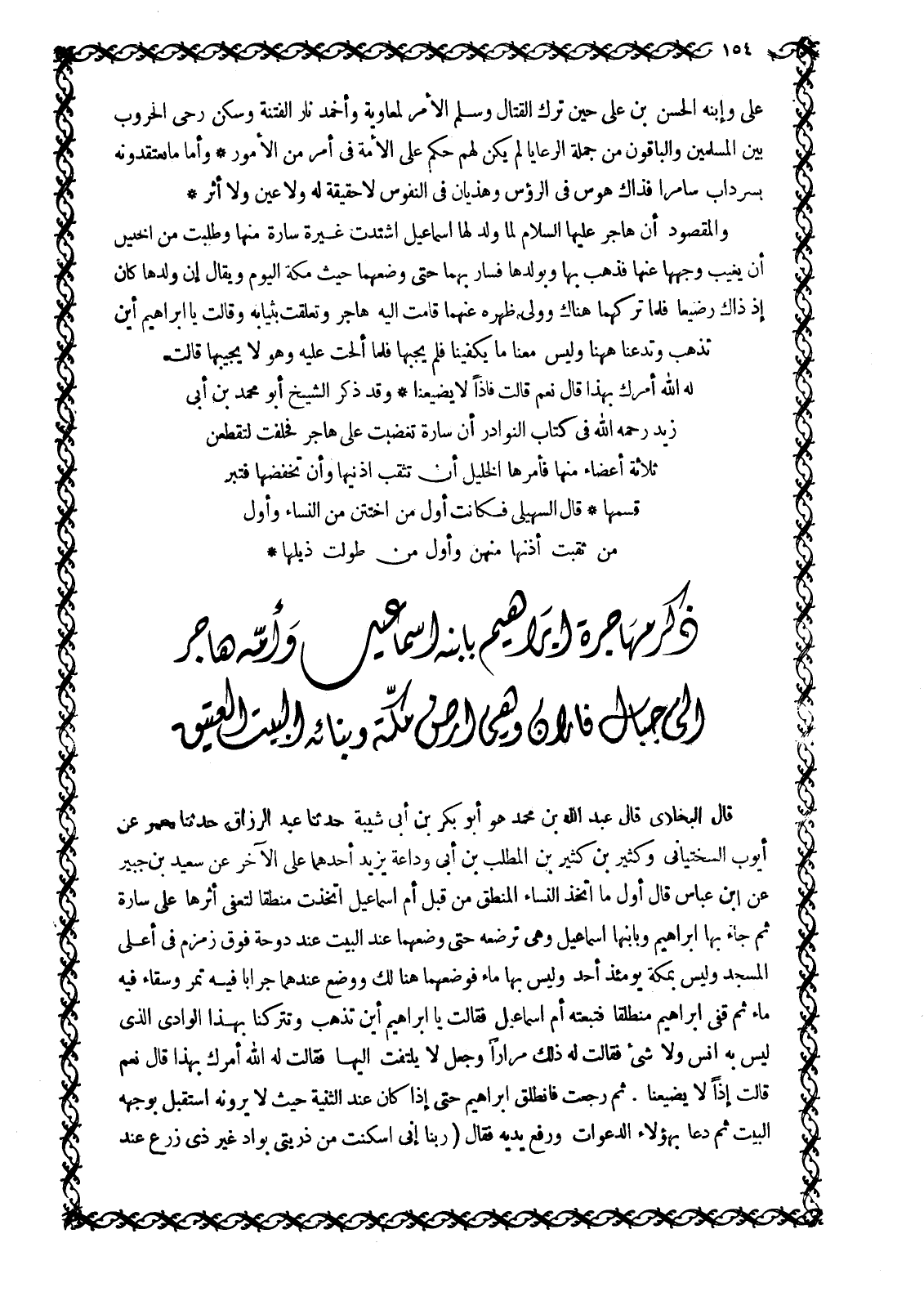 عَلِيٍّ وَابْنِهِ الْحَسَنِ بْنِ عَلِيٍّ حِينَ تَرَكَ القتال وسلم الأمر لمعاوية وأحمد نَارَ الْفِتْنَةِ وَسَكَّنَ رَحَى الْحُرُوبِ بَيْنَ الْمُسْلِمِينَ وَالْبَاقُونَ مِنْ جُمْلَةِ الرَّعَايَا لَمْ يَكُنْ لَهُمْ حُكْمٌ عَلَى الْأُمَّةِ فِي أَمْرٍ مِنَ الْأُمُورِ وَأَمَّا مَا يَعْتَقِدُونَهُ بِسِرْدَابِ سَامَرَّا فَذَاكَ هَوَسٌ فِي الرُّءُوسِ وَهَذَيَانٌ فِي النُّفُوسِ لَا حَقِيقَةَ لَهُ وَلَا عَيْنَ وَلَا أَثَرَ وَالْمَقْصُودُ أَنَّ هَاجَرَ عَلَيْهَا السَّلَامُ لَمَّا وُلِدَ لَهَا إِسْمَاعِيلُ اشْتَدَّتْ غَيْرَةُ سَارَةَ مِنْهَا وَطَلَبَتْ مِنَ الْخَلِيلِ أَنْ يُغَيِّبَ وَجْهَهَا عَنْهَا فَذَهَبَ بِهَا وَبِوَلَدِهَا فَسَارَ بِهِمَا حَتَّى وَضَعَهُمَا حَيْثُ مَكَّةَ الْيَوْمَ وَيُقَالُ إِنَّ وَلَدَهَا كَانَ إِذْ ذَاكَ رَضِيعًا فَلَمَّا تَرَكَهُمَا هُنَاكَ وَوَلَّى ظَهْرَهُ عَنْهُمَا قَامَتْ إِلَيْهِ هَاجَرُ وَتَعَلَّقَتْ بِثِيَابِهِ وَقَالَتْ يَا إِبْرَاهِيمُ أَيْنَ تَذْهَبُ وَتَدَعُنَا هَاهُنَا وَلَيْسَ مَعَنَا مَا يَكْفِينَا فَلَمْ يُجِبْهَا فَلَمَّا أَلَحَّتْ عَلَيْهِ وَهُوَ لَا يُجِيبُهَا قَالَتْ لَهُ آللَّهُ أَمَرَكَ بِهَذَا قَالَ نَعَمْ قَالَتْ فَإِذًا لَا يُضَيِّعُنَا وَقَدْ ذَكَرَ الشَّيْخُ أَبُو مُحَمَّدِ بْنُ أَبِي زَيْدٍ رَحِمَهُ اللَّهُ فِي كِتَابِ النَّوَادِرِ أَنَّ سَارَةَ تَغَضَّبَتْ عَلَى هَاجَرَ فَحَلَفَتْ لَتَقْطَعَنَّ ثَلَاثَةَ أَعْضَاءٍ مِنْهَا فَأَمَرَهَا الْخَلِيلُ أَنْ تَثْقُبَ أُذُنَيْهَا وَأَنْ تَخْفِضَهَا فَتَبَرَّ قَسَمُهَا قَالَ السُّهَيْلِيُّ فَكَانَتْ أَوَّلَ مَنِ اخْتَتَنَ مِنَ النِّسَاءِ وَأَوَّلَ مَنْ ثَقَبَتْ أذنها مِنْهُنَّ وَأَوَّلَ مَنْ طَوَّلَتْ ذَيْلَهَا