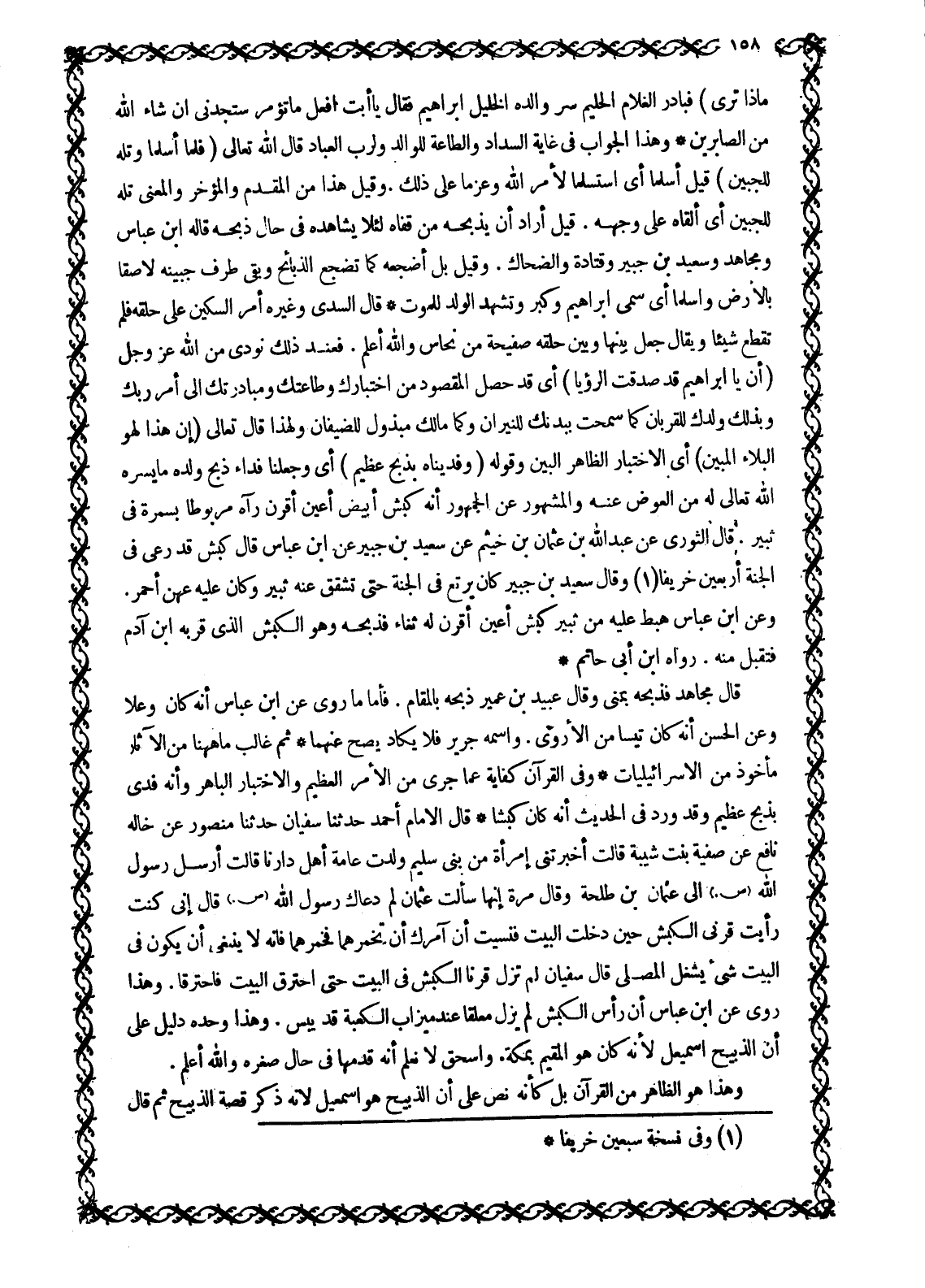 ماذا تَرى 37: 102 فبادر الغلام الحليم سر والده الخليل إبراهيم ف قَالَ يَا أَبَتِ افْعَلْ مَا تُؤْمَرُ سَتَجِدُنِي إِنْ شاءَ الله من الصَّابِرِينَ 37: 102 وَهَذَا الْجَوَابُ فِي غَايَةِ السَّدَادِ وَالطَّاعَةِ لِلْوَالِدِ وَلِرَبِّ الْعِبَادِ قَالَ اللَّهُ تَعَالَى فَلَمَّا أَسْلَما وَتَلَّهُ لِلْجَبِينِ 37: 103 قِيلَ أَسْلَمَا أَيِ اسْتَسْلَمَا لِأَمْرِ اللَّهِ وَعَزَمَا عَلَى ذَلِكَ. وَقِيلَ هَذَا مِنَ الْمُقَدَّمِ وَالْمُؤَخَّرِ وَالْمَعْنَى تَلَّهُ لِلْجَبِينِ أَيْ أَلْقَاهُ عَلَى وَجْهِهِ. قِيلَ أَرَادَ أَنْ يَذْبَحَهُ مِنْ قَفَاهُ لِئَلَّا يُشَاهِدَهُ فِي حَالِ ذَبْحِهِ قَالَهُ ابْنُ عَبَّاسٍ وَمُجَاهِدٌ وَسَعِيدُ بْنُ جُبَيْرٍ وَقَتَادَةُ وَالضَّحَّاكُ. وَقِيلَ بَلْ أَضْجَعَهُ كَمَا تُضْجَعُ الذَّبَائِحُ وَبَقِيَ طَرَفُ جَبِينِهِ لَاصِقًا بِالْأَرْضِ وَأَسْلَمَا أَيْ سَمَّى إِبْرَاهِيمُ وكبر وتشهد الْوَلَدَ لِلْمَوْتِ قَالَ السُّدِّيُّ وَغَيْرُهُ أَمَرَّ السِّكِّينَ عَلَى حَلْقِهِ فَلَمْ تَقْطَعْ شَيْئًا وَيُقَالُ جُعِلَ بَيْنَهَا وَبَيْنَ حَلْقِهِ صَفِيحَةٌ مِنْ نُحَاسٍ وَاللَّهُ أَعْلَمُ. فَعِنْدَ ذَلِكَ نُودِيَ مِنَ اللَّهِ عَزَّ وَجَلَّ أَنْ يَا إِبْراهِيمُ قَدْ صَدَّقْتَ الرُّؤْيا 37: 104- 105 أَيْ قَدْ حَصَلَ الْمَقْصُودُ مِنِ اخْتِبَارِكِ وَطَاعَتِكَ وَمُبَادَرَتِكَ إِلَى أَمْرِ رَبِّكَ وَبَذْلِكَ وَلَدَكَ لِلْقُرْبَانِ كَمَا سَمَحْتَ بِبَدَنِكَ لِلنِّيرَانِ وَكَمَا مَالُكَ مَبْذُولٌ لِلضِّيفَانِ وَلِهَذَا قَالَ تَعَالَى إِنَّ هَذَا لَهُوَ الْبَلاءُ الْمُبِينُ 37: 106 أَيِ الِاخْتِبَارُ الظَّاهِرُ الْبَيِّنُ وَقَوْلُهُ وَفَدَيْناهُ بِذِبْحٍ عَظِيمٍ 37: 107 أَيْ وَجَعَلْنَا فِدَاءَ ذَبْحِ وَلَدِهِ مَا يَسَّرَهُ اللَّهُ تَعَالَى لَهُ مِنَ الْعِوَضِ عَنْهُ وَالْمَشْهُورُ عَنِ الْجُمْهُورِ أَنَّهُ كَبْشٌ أَبْيَضُ أَعْيَنُ أَقْرَنُ رَآهُ مَرْبُوطًا بِسَمُرَةٍ فِي ثَبِيرٍ. قَالَ الثَّوْرِيُّ عن عبد الله بن عثمان بن خيثم عَنْ سَعِيدِ بْنِ جُبَيْرٍ عَنِ ابْنِ عَبَّاسٍ قَالَ كَبْشٌ قَدْ رَعَى فِي الْجَنَّةِ أَرْبَعِينَ خَرِيفًا [1] وَقَالَ سَعِيدُ بْنُ جُبَيْرٍ كَانَ يَرْتَعُ فِي الْجَنَّةِ حَتَّى تَشَقَّقَ عَنْهُ ثَبِيرٌ وَكَانَ عَلَيْهِ عِهْنٌ أَحْمَرُ.