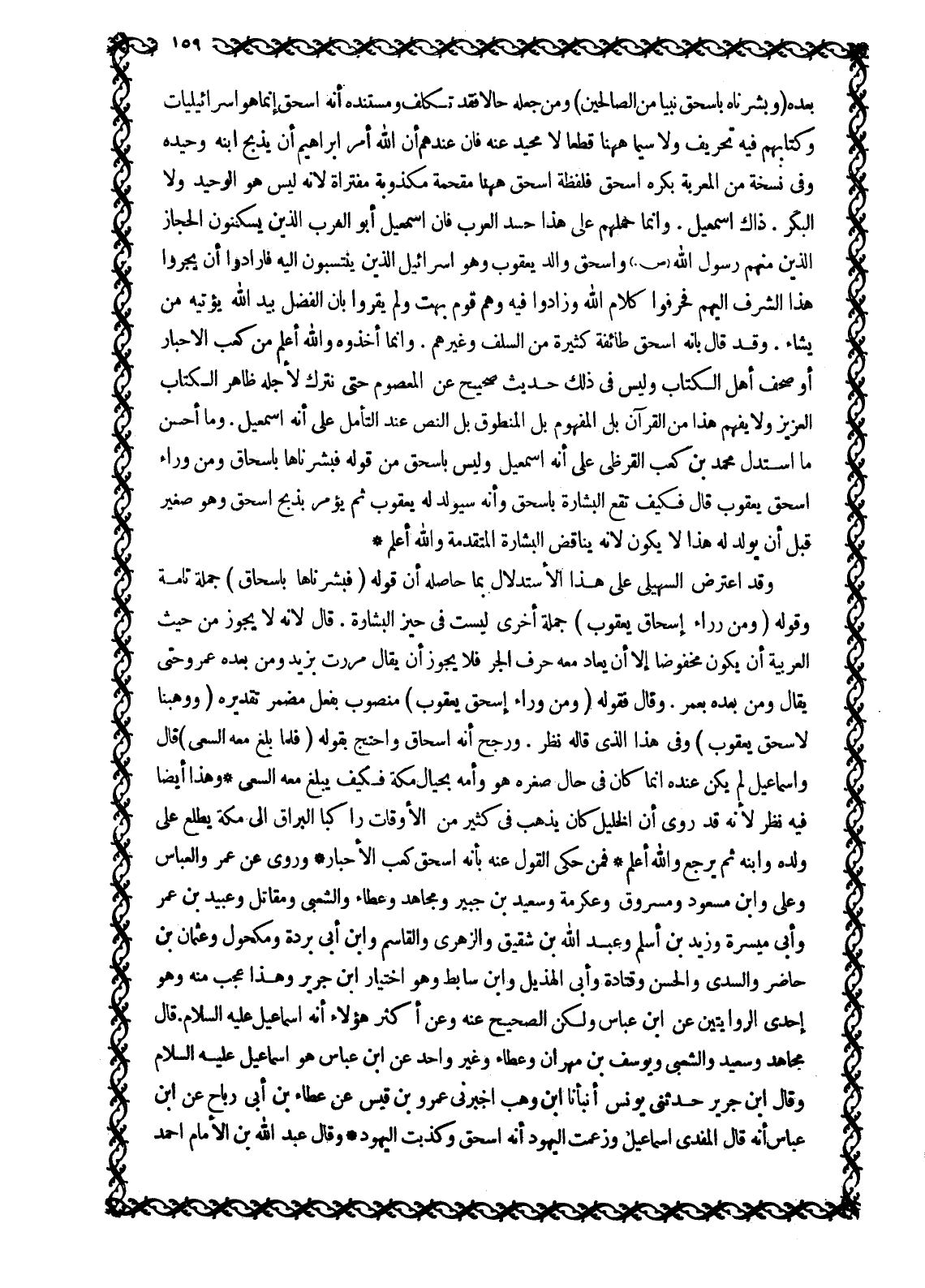 بعده وَبَشَّرْناهُ بِإِسْحاقَ نَبِيًّا من الصَّالِحِينَ 37: 112 وَمَنْ جَعَلَهُ حَالًا فَقَدْ تَكَلَّفَ وَمُسْتَنَدُهُ أَنَّهُ إِسْحَاقُ إِنَّمَا هُوَ إِسْرَائِيلِيَّاتُ وَكِتَابُهُمْ فِيهِ تَحْرِيفٌ وَلَا سِيَّمَا هَاهُنَا قَطْعًا لَا مَحِيدَ عَنْهُ فَإِنَّ عِنْدَهُمْ أَنَّ اللَّهَ أَمَرَ إِبْرَاهِيمَ أَنْ يَذْبَحَ ابْنَهُ وَحِيدَهُ وَفِي نُسْخَةٍ مِنَ الْمُعَرَّبَةِ بِكْرَهُ إِسْحَاقَ فَلَفْظَةُ إِسْحَاقَ هَاهُنَا مُقْحَمَةٌ مَكْذُوبَةٌ مُفْتَرَاةٌ لِأَنَّهُ لَيْسَ هُوَ الْوَحِيدَ وَلَا الْبِكْرَ. ذاك إِسْمَاعِيلُ. وَإِنَّمَا حَمَلَهُمْ عَلَى هَذَا حَسَدُ الْعَرَبِ فَإِنَّ إِسْمَاعِيلَ أَبُو الْعَرَبِ الَّذِينَ يَسْكُنُونَ الْحِجَازَ الَّذِينَ مِنْهُمْ رَسُولُ اللَّهِ صَلَّى اللَّهُ عَلَيْهِ وَسَلَّمَ وَإِسْحَاقَ وَالِدُ يَعْقُوبَ وَهُوَ إِسْرَائِيلُ الَّذِينَ يَنْتَسِبُونَ إِلَيْهِ فَأَرَادُوا أَنْ يَجُرُّوا هَذَا الشَّرَفَ إِلَيْهِمْ فَحَرَّفُوا كَلَامَ اللَّهِ وَزَادُوا فِيهِ وَهُمْ قَوْمٌ بُهْتٌ وَلَمْ يُقِرُّوا بِأَنَّ الْفَضْلَ بِيَدِ اللَّهِ يُؤْتِيهِ مَنْ يَشَاءُ. وَقَدْ قَالَ بِأَنَّهُ إِسْحَاقُ طَائِفَةٌ كَثِيرَةٌ مِنَ السَّلَفِ وَغَيْرِهِمْ. وَإِنَّمَا أَخَذُوهُ وَاللَّهُ أَعْلَمُ مِنْ كَعْبِ الْأَحْبَارِ أَوْ صُحُفِ أَهْلِ الْكِتَابِ وَلَيْسَ فِي ذَلِكَ حَدِيثٌ صَحِيحٌ عَنِ الْمَعْصُومِ حَتَّى نَتْرُكَ لِأَجْلِهِ ظَاهِرَ الْكِتَابِ الْعَزِيزِ وَلَا يُفْهَمُ هَذَا مِنَ الْقُرْآنِ بَلِ الْمَفْهُومُ بَلِ الْمَنْطُوقُ بَلِ النَّصُّ عِنْدَ التَّأَمُّلِ عَلَى أَنَّهُ إِسْمَاعِيلُ. وَمَا أَحْسَنَ مَا اسْتَدَلَّ مُحَمَّدُ بْنُ كَعْبٍ الْقُرَظِيُّ عَلَى أَنَّهُ إِسْمَاعِيلُ وَلَيْسَ بِإِسْحَاقَ مِنْ قَوْلِهِ فَبَشَّرْنَاهَا بِإِسْحَاقَ ومن وراء إسحاق يعقوب قَالَ فَكَيْفَ تَقَعُ الْبِشَارَةُ بِإِسْحَاقَ وَأَنَّهُ سَيُولَدُ لَهُ يَعْقُوبُ ثُمَّ يُؤْمَرُ بِذَبْحِ إِسْحَاقَ وَهُوَ صَغِيرٌ قَبْلَ أَنْ يُولَدَ لَهُ هَذَا لَا يَكُونُ لِأَنَّهُ يُنَاقِضُ الْبِشَارَةَ الْمُتَقَدِّمَةَ وَاللَّهُ أَعْلَمُ وَقَدِ اعْتَرَضَ السُّهَيْلِيُّ عَلَى هَذَا الِاسْتِدْلَالِ بِمَا أصله أن قوله فَبَشَّرْناها بِإِسْحاقَ 11: 71 جُمْلَةٌ تَامَّةٌ وَقَوْلَهُ وَمن وَراءِ إِسْحاقَ يَعْقُوبَ 11: 71 جُمْلَةٌ أُخْرَى لَيْسَتْ فِي حَيِّزِ الْبِشَارَةِ. قَالَ لِأَنَّهُ لَا يَجُوزُ مِنْ حَيْثُ الْعَرَبِيَّةُ أَنْ يَكُونَ مَخْفُوضًا إِلَّا أَنْ يُعَادَ مَعَهُ حَرْفُ الْجَرِّ فَلَا يَجُوزُ أَنْ يُقَالَ مَرَرْتُ بِزَيْدٍ وَمِنْ بَعْدِهِ عَمْرٍو حَتَّى يُقَالَ وَمِنْ بَعْدِهِ بعمر. وقال فقوله وَمن وَراءِ إِسْحاقَ يَعْقُوبَ 11: 71 مَنْصُوبٌ بِفِعْلٍ مُضْمَرٍ تَقْدِيرُهُ وَوَهَبْنَا لِإِسْحَاقَ يَعْقُوبَ وَفِي هَذَا الَّذِي قَالَهُ نَظَرٌ. وَرَجَّحَ أَنَّهُ إِسْحَاقُ وَاحْتَجَّ بِقَوْلِهِ فَلَمَّا بَلَغَ مَعَهُ السَّعْيَ 37: 102 قَالَ وَإِسْمَاعِيلُ لَمْ يَكُنْ عِنْدَهُ إِنَّمَا كَانَ فِي حَالِ صِغَرِهِ هُوَ وَأَمُّهُ بِحِيَالِ مَكَّةَ فَكَيْفَ يَبْلُغُ مَعَهُ السَّعْيَ وَهَذَا أَيْضًا فِيهِ نَظَرٌ لِأَنَّهُ قَدْ رُوِيَ أَنَّ الْخَلِيلَ كَانَ يَذْهَبُ فِي كَثِيرٍ مِنَ الْأَوْقَاتِ رَاكِبًا الْبُرَاقَ إِلَى مَكَّةَ يَطَّلِعُ عَلَى وَلَدِهِ وَابْنِهِ ثُمَّ يَرْجِعُ وَاللَّهُ أَعْلَمُ فَمَنْ حُكِيَ الْقَوْلُ عَنْهُ بأنه إِسْحَاقُ كَعْبُ الْأَحْبَارِ وَرُوِيَ عَنْ عُمَرَ وَالْعَبَّاسِ وَعَلِيٍّ وَابْنِ مَسْعُودٍ وَمَسْرُوقٍ وَعِكْرِمَةَ وَسَعِيدِ بْنِ جُبَيْرٍ وَمُجَاهِدٍ وَعَطَاءٍ وَالشَّعْبِيِّ وَمُقَاتِلٍ وَعُبَيْدِ بْنِ عمر وَأَبِي مَيْسَرَةَ وَزَيْدِ بْنِ أَسْلَمَ وَعَبْدِ اللَّهِ ب
