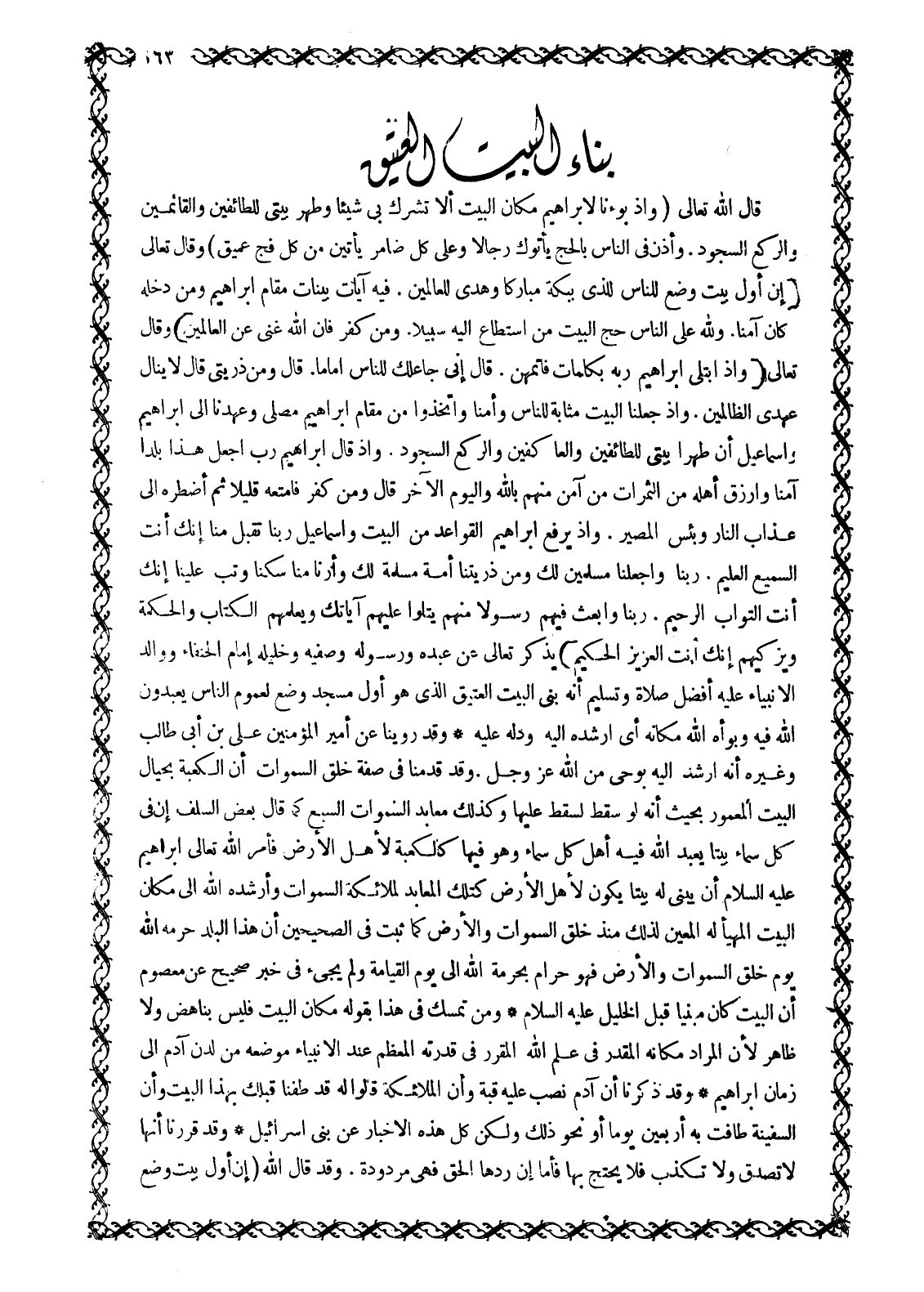 قَالَ اللَّهُ تَعَالَى وَإِذْ بَوَّأْنا لِإِبْراهِيمَ مَكانَ الْبَيْتِ أَنْ لَا تُشْرِكْ بِي شَيْئاً وَطَهِّرْ بَيْتِيَ لِلطَّائِفِينَ وَالْقائِمِينَ وَالرُّكَّعِ السُّجُودِ. وَأَذِّنْ فِي النَّاسِ بِالْحَجِّ يَأْتُوكَ رِجالًا وَعَلى كُلِّ ضامِرٍ يَأْتِينَ مِنْ كُلِّ فَجٍّ عَمِيقٍ 22: 26- 27 وَقَالَ تَعَالَى إِنَّ أَوَّلَ بَيْتٍ وُضِعَ لِلنَّاسِ لَلَّذِي بِبَكَّةَ مُبارَكاً وَهُدىً لِلْعالَمِينَ. فِيهِ آياتٌ بَيِّناتٌ مَقامُ إِبْراهِيمَ وَمن دَخَلَهُ كانَ آمِناً. وَلِلَّهِ عَلَى النَّاسِ حِجُّ الْبَيْتِ مَنِ اسْتَطاعَ إِلَيْهِ سَبِيلًا. وَمن كَفَرَ فَإِنَّ اللَّهَ غَنِيٌّ عَنِ الْعالَمِينَ 3: 96- 97 وقال تَعَالَى وَإِذِ ابْتَلى إِبْراهِيمَ رَبُّهُ بِكَلِماتٍ فَأَتَمَّهُنَّ. قَالَ إِنِّي جاعِلُكَ لِلنَّاسِ إِماماً. قَالَ وَمن ذُرِّيَّتِي قال لا يَنالُ عَهْدِي الظَّالِمِينَ. وَإِذْ جَعَلْنَا الْبَيْتَ مَثابَةً لِلنَّاسِ وَأَمْناً وَاتَّخِذُوا من مَقامِ إِبْراهِيمَ مُصَلًّى وَعَهِدْنا إِلى إِبْراهِيمَ وَإِسْماعِيلَ أَنْ طَهِّرا بَيْتِيَ لِلطَّائِفِينَ وَالْعاكِفِينَ وَالرُّكَّعِ السُّجُودِ. وَإِذْ قال إِبْراهِيمُ رَبِّ اجْعَلْ هذا بَلَداً آمِناً وَارْزُقْ أَهْلَهُ من الثَّمَراتِ من آمَنَ مِنْهُمْ بِاللَّهِ وَالْيَوْمِ الْآخِرِ قال وَمن كَفَرَ فَأُمَتِّعُهُ قَلِيلًا ثُمَّ أَضْطَرُّهُ إِلى عَذابِ النَّارِ وَبِئْسَ الْمَصِيرُ. وَإِذْ يَرْفَعُ إِبْراهِيمُ الْقَواعِدَ مِنَ الْبَيْتِ وَإِسْماعِيلُ رَبَّنا تَقَبَّلْ مِنَّا إِنَّكَ أَنْتَ السَّمِيعُ الْعَلِيمُ. رَبَّنا وَاجْعَلْنا مُسْلِمَيْنِ لَكَ وَمن ذُرِّيَّتِنا أُمَّةً مُسْلِمَةً لَكَ وَأَرِنا مَناسِكَنا وَتُبْ عَلَيْنا إِنَّكَ أَنْتَ التَّوَّابُ الرَّحِيمُ. رَبَّنا وَابْعَثْ فِيهِمْ رَسُولًا مِنْهُمْ يَتْلُوا عَلَيْهِمْ آياتِكَ وَيُعَلِّمُهُمُ الْكِتابَ وَالْحِكْمَةَ وَيُزَكِّيهِمْ إِنَّكَ أَنْتَ الْعَزِيزُ الْحَكِيمُ 2: 124- 129 يَذْكُرُ تَعَالَى عَنْ عَبْدِهِ وَرَسُولِهِ وَصَفِيِّهِ وَخَلِيلِهِ إِمَامِ الْحُنَفَاءِ وَوَالِدِ الْأَنْبِيَاءِ عَلَيْهِ أَفْضَلُ صَلَاةٍ وَتَسْلِيمٍ أَنَّهُ بَنَى الْبَيْتَ الْعَتِيقَ الَّذِي هُوَ أَوَّلُ مَسْجِدٍ وُضِعَ لِعُمُومِ النَّاسِ يَعْبُدُونَ اللَّهَ فِيهِ وَبَوَّأَهُ اللَّهُ مَكَانَهُ أَيْ أَرْشَدَهُ إِلَيْهِ وَدَلَّهُ عَلَيْهِ وَقَدْ رُوِّينَا عَنْ أَمِيرِ الْمُؤْمِنِينَ عَلِيِّ بْنِ أَبِي طَالِبٍ وَغَيْرِهِ أَنَّهُ أُرْشِدَ إِلَيْهِ بِوَحْيٍ مِنَ اللَّهِ عَزَّ وَجَلَّ. وَقَدْ قدمنا في صفة خلق السموات أَنَّ الْكَعْبَةَ بِحِيَالِ الْبَيْتِ الْمَعْمُورِ بِحَيْثُ أَنَّهُ لو سقط لسقط عليها وكذلك معابد السموات السَّبْعِ كَمَا قَالَ بَعْضُ السَّلَفِ إِنَّ فِي كُلِّ سَمَاءٍ بَيْتًا يَعْبُدُ اللَّهَ فِيهِ أَهْلُ كُلِّ سَمَاءٍ وَهُوَ فِيهَا كَالْكَعْبَةِ لِأَهْلِ الْأَرْضِ فَأَمَرَ اللَّهُ تَعَالَى إِبْرَاهِيمَ عَلَيْهِ السَّلَامُ أَنْ يَبْنِيَ لَهُ بَيْتًا يَكُونُ لِأَهْلِ الْأَرْضِ كَتِلْكَ المعابد لملائكة السموات وَأَرْشَدَهُ اللَّهُ إِلَى مَكَانِ الْبَيْتِ الْمُهَيَّأِ لَهُ المعين لذلك منذ خلق السموات وَالْأَرْضَ كَمَا ثَبَتَ فِي الصَّحِيحَيْنِ إِنَّ هَذَا الْبَلَدَ حَرَّمَهُ اللَّهُ يَوْمَ خلق السموات وَالْأَرْضَ فَهُوَ حَرَامٌ بِحُرْمَةِ اللَّهِ إِلَى يَوْمِ الْقِيَامَةِ وَلَمْ يَجِئْ فِي خَبَرٍ صَحِيحٍ عَنْ مَعْصُومٍ أَنَّ الْبَيْتَ كَانَ مَبْنِيًّا قَبْلَ الْخَلِيلِ عَلَيْهِ السَّلَامُ وَمَنْ تَمَسَّكَ فِي هَذَا بِقَوْلِهِ مكان البيت فَلَيْسَ بِنَاهِضٍ وَلَا ظَاهِرٍ لِأَنَّ الْمُرَادَ مَكَانُهُ المقدر في علم الله المقرر في قدرته الْمُعَظَّمُ عِنْدَ الْأَنْبِيَاءِ مَوْض