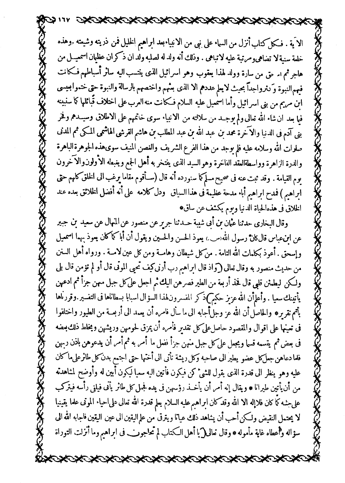 الْآيَةَ. فَكُلُّ كِتَابٍ أُنْزِلَ مِنَ السَّمَاءِ عَلَى نَبِيٍّ مِنَ الْأَنْبِيَاءِ بَعْدَ إِبْرَاهِيمَ الْخَلِيلِ فَمِنْ ذُرِّيَّتِهِ وَشِيعَتِهِ. وَهَذِهِ خِلْعَةٌ سَنِيَّةٌ لَا تُضَاهَى وَمَرْتَبَةٌ عَلِيَّةٌ لَا تُبَاهَى. وَذَلِكَ أَنَّهُ وُلِدَ لَهُ لِصُلْبِهِ وَلَدَانِ ذَكَرَانِ عَظِيمَانِ إِسْمَاعِيلُ مِنْ هَاجَرَ ثُمَّ إِسْحَاقُ مِنْ سَارَةَ وَوُلِدَ لِهَذَا يَعْقُوبُ وَهُوَ إِسْرَائِيلُ الَّذِي يَنْتَسِبُ إِلَيْهِ سَائِرُ أَسْبَاطِهِمْ فَكَانَتْ فِيهِمُ النُّبُوَّةُ وَكَثُرُوا جِدًّا بِحَيْثُ لَا يَعْلَمُ عَدَدَهُمْ إِلَّا الَّذِي بَعَثَهُمْ وَاخْتَصَّهُمْ بِالرِّسَالَةِ وَالنُّبُوَّةِ حَتَّى خُتِمُوا بِعِيسَى ابْنِ مَرْيَمَ مِنْ بَنِي إِسْرَائِيلَ وَأَمَّا إِسْمَاعِيلُ عَلَيْهِ السَّلَامُ فَكَانَتْ مِنْهُ الْعَرَبُ عَلَى اخْتِلَافِ قَبَائِلِهَا كَمَا سَنُبَيِّنُهُ فِيمَا بَعْدُ إِنْ شَاءَ اللَّهُ تَعَالَى وَلَمْ يُوجَدْ مِنْ سُلَالَتِهِ مِنَ الْأَنْبِيَاءِ سِوَى خَاتَمِهِمْ عَلَى الْإِطْلَاقِ وَسَيِّدِهِمْ وَفَخْرِ بَنِي آدَمَ فِي الدُّنْيَا وَالْآخِرَةِ مُحَمَّدِ بْنِ عَبْدِ اللَّهِ بْنِ عَبْدِ الْمُطَّلِبِ بْنِ هَاشِمٍ الْقُرَشِيِّ الْهَاشِمِيِّ الْمَكِّيِّ ثُمَّ الْمَدَنِيِّ صَلَوَاتُ اللَّهِ وَسَلَامُهُ عَلَيْهِ فَلَمْ يُوجَدْ مِنْ هَذَا الْفَرْعِ الشَّرِيفِ وَالْغُصْنِ الْمُنِيفِ سِوَى هَذِهِ الْجَوْهَرَةِ الْبَاهِرَةِ وَالدُّرَّةِ الزَّاهِرَةِ وَوَاسِطَةِ الْعِقْدِ الْفَاخِرَةِ وَهُوَ السَّيِّدُ الَّذِي يَفْتَخِرُ بِهِ أَهْلُ الْجَمْعِ وَيَغْبِطُهُ الْأَوَّلُونَ وَالْآخِرُونَ يَوْمَ الْقِيَامَةِ. وَقَدْ ثَبَتَ عَنْهُ فِي صَحِيحِ مُسْلِمٍ كَمَا سَنُورِدُهُ أَنَّهُ قَالَ (سَأَقُومُ مَقَامًا يَرْغَبُ إِلَيَّ الْخَلْقُ كُلُّهُمْ حَتَّى إِبْرَاهِيمُ) فَمَدَحَ إِبْرَاهِيمَ آباءه مِدْحَةً عَظِيمَةً فِي هَذَا السِّيَاقِ. وَدَلَّ كَلَامُهُ عَلَى أَنَّهُ أَفْضَلُ الْخَلَائِقِ بَعْدَهُ عِنْدَ الْخَلَّاقِ فِي هَذِهِ الْحَيَاةِ الدُّنْيَا وَيَوْمَ يُكْشَفُ عَنْ سَاقٍ وَقَالَ الْبُخَارِيُّ حَدَّثَنَا عُثْمَانُ بْنُ أَبِي شَيْبَةَ حَدَّثَنَا جَرِيرٌ عَنْ مَنْصُورٍ عَنِ الْمِنْهَالِ عَنْ سَعِيدِ بْنِ جُبَيْرٍ عَنِ ابْنِ عَبَّاسٍ قَالَ كَانَ رَسُولُ اللَّهِ صَلَّى اللَّهُ عَلَيْهِ وَسَلَّمَ يُعَوِّذُ الْحَسَنَ وَالْحُسَيْنَ وَيَقُولُ إِنَّ أَبَاكُمَا كَانَ يُعَوِّذُ بِهِمَا إِسْمَاعِيلَ وَإِسْحَاقَ. أَعُوذُ بِكَلِمَاتِ اللَّهِ التَّامَّةِ. مِنْ كُلِّ شَيْطَانٍ وَهَامَّةٍ وَمِنْ كُلِّ عَيْنٍ لَامَّةٍ. وَرَوَاهُ أَهْلُ السُّنَنِ مِنْ حَدِيثِ مَنْصُورٍ بِهِ وَقَالَ تَعَالَى وَإِذْ قَالَ إِبْراهِيمُ رَبِّ أَرِنِي كَيْفَ تُحْيِ الْمَوْتى قَالَ أَوَلَمْ تُؤْمِنْ قَالَ بَلى وَلكِنْ لِيَطْمَئِنَّ قَلْبِي قَالَ فَخُذْ أَرْبَعَةً مِنَ الطَّيْرِ فَصُرْهُنَّ إِلَيْكَ ثُمَّ اجْعَلْ عَلى كُلِّ جَبَلٍ مِنْهُنَّ جُزْءاً ثُمَّ ادْعُهُنَّ يَأْتِينَكَ سَعْياً. وَاعْلَمْ أَنَّ اللَّهَ عَزِيزٌ حَكِيمٌ 2: 260 ذكر المفسرون لهذا السؤال أسبابا بسطاناها فِي التَّفْسِيرِ. وَقَرَّرْنَاهَا بِأَتَمِّ تَقْرِيرٍ وَالْحَاصِلُ أَنَّ اللَّهَ عَزَّ وَجَلَّ أَجَابَهُ إِلَى مَا سَأَلَ فَأَمَرَهُ أَنْ يَعْمِدَ إِلَى أَرْبَعَةٍ مِنَ الطُّيُورِ واختلفوا في تعينها عَلَى أَقْوَالٍ وَالْمَقْصُودُ حَاصِلٌ عَلَى كُلِّ تَقْدِيرٍ فَأَمَرَهُ أَنْ يُمَزِّقَ لُحُومَهُنَّ وَرِيشَهُنَّ وَيَخْلِطَ ذَلِكَ بَعْضَهُ فِي بَعْضٍ ثُمَّ يُقَسِّمُهُ قِسَمًا وَيَجْعَلَ على كل جبل منهن جزأ فَفَعَلَ مَا أُمِرَ بِهِ ثُمَّ أُمِرَ أَنْ يَدْعُوَهُنَّ بِإِذْنِ رَبِّهِنَّ فَلَمَّا دَعَاهُنَّ جَعَلَ كُلُّ 