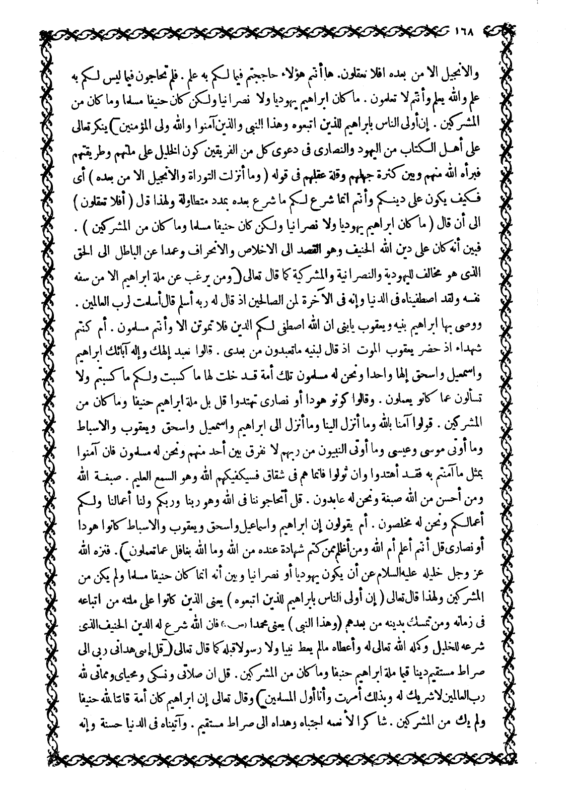 وَالْإِنْجِيلُ إِلَّا مِنْ بَعْدِهِ أَفَلا تَعْقِلُونَ. هَا أَنْتُمْ هؤُلاءِ حاجَجْتُمْ فِيما لَكُمْ بِهِ عِلْمٌ. فَلِمَ تُحَاجُّونَ فِيما لَيْسَ لَكُمْ بِهِ عِلْمٌ وَالله يَعْلَمُ وَأَنْتُمْ لَا تَعْلَمُونَ. مَا كانَ إِبْراهِيمُ يَهُودِيًّا وَلا نَصْرانِيًّا وَلكِنْ كانَ حَنِيفاً مُسْلِماً وَما كانَ مِنَ الْمُشْرِكِينَ. إِنَّ أَوْلَى النَّاسِ بِإِبْراهِيمَ لَلَّذِينَ اتَّبَعُوهُ وَهذَا النَّبِيُّ وَالَّذِينَ آمَنُوا وَالله وَلِيُّ الْمُؤْمِنِينَ 3: 65- 68 ينكر تعالى على أهل الكتاب من اليهود والنصارى في دعوى كل من الفريقين كون الخليل على ملتهم وطريقتهم فبرأه الله منهم وبين كثرة جهلهم وقلة عقلهم في قوله وَما أُنْزِلَتِ التَّوْراةُ وَالْإِنْجِيلُ إِلَّا مِنْ بَعْدِهِ 3: 65 أَيْ فَكَيْفَ يَكُونُ عَلَى دِينِكُمْ وَأَنْتُمْ إِنَّمَا شُرِعَ لَكُمْ مَا شُرِعَ بَعْدَهُ بِمُدَدٍ مُتَطَاوِلَةٍ ولهذا قال (أَفَلا تَعْقِلُونَ) 3: 65 إِلَى أَنْ قَالَ (مَا كانَ إِبْراهِيمُ يَهُودِيًّا وَلا نَصْرانِيًّا وَلكِنْ كانَ حَنِيفاً مُسْلِماً وَما كانَ مِنَ الْمُشْرِكِينَ) 3: 67.