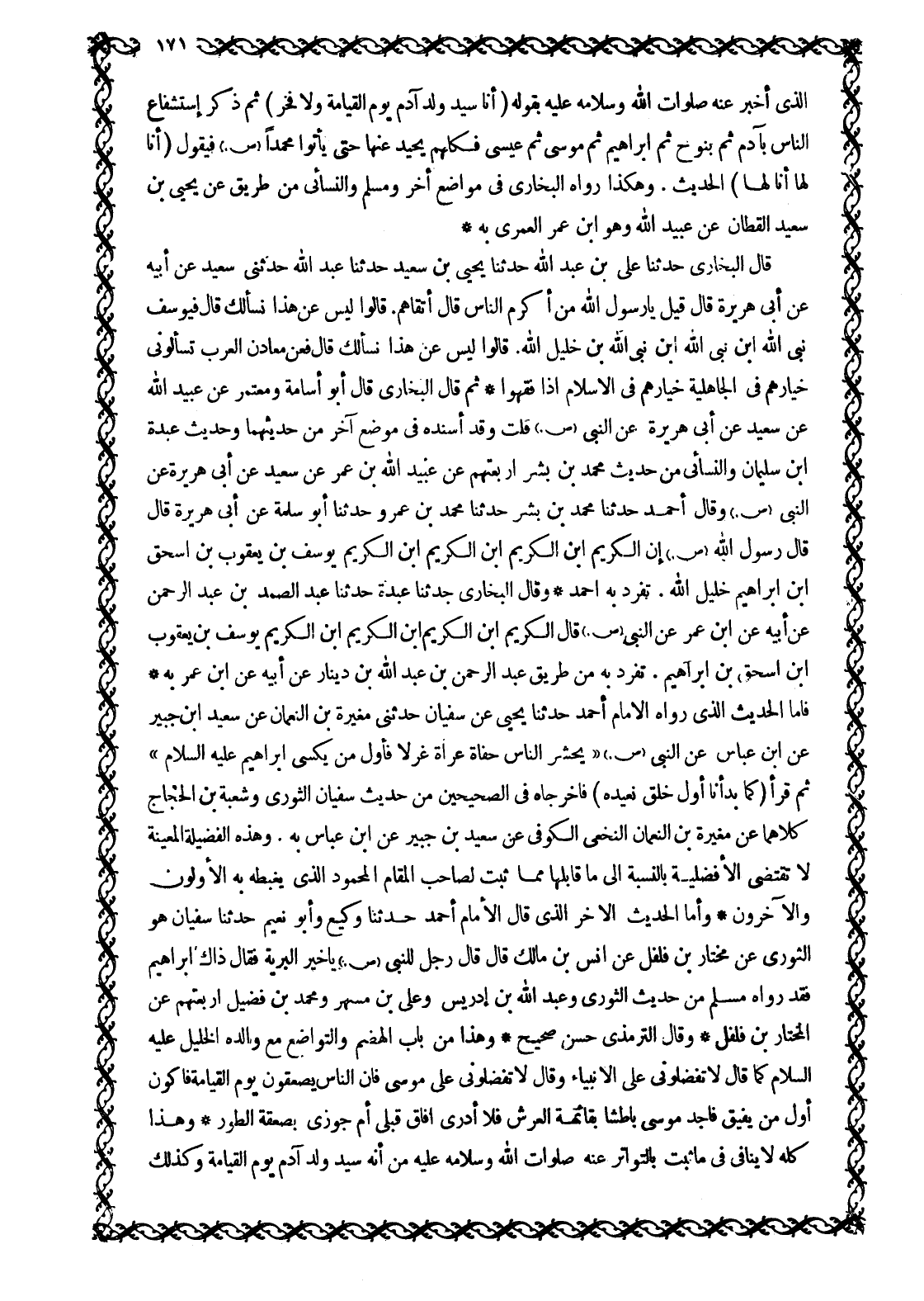 الَّذِي أَخْبَرَ عَنْهُ صَلَوَاتُ اللَّهِ وَسَلَامُهُ عَلَيْهِ بِقَوْلِهِ (أَنَا سَيِّدُ وَلَدِ آدَمَ يَوْمَ الْقِيَامَةِ وَلَا فَخْرَ) ثُمَّ ذَكَرَ اسْتِشْفَاعَ النَّاسِ بِآدَمَ ثم بنوح ثم إبراهيم ثُمَّ مُوسَى ثُمَّ عِيسَى فَكُلُّهُمْ يَحِيدُ عَنْهَا حَتَّى يَأْتُوا مُحَمَّدًا صَلَّى اللَّهُ عَلَيْهِ وَسَلَّمَ فَيَقُولُ (أَنَا لَهَا أنا لها) الحديث. وَهَكَذَا رَوَاهُ الْبُخَارِيُّ فِي مَوَاضِعَ أُخَرَ وَمُسْلِمٌ والنَّسَائِيُّ من طريق عَنْ يَحْيَى بْنِ سَعِيدٍ الْقَطَّانِ عَنْ عُبَيْدِ اللَّهِ وَهُوَ ابْنُ عُمَرَ الْعُمَرِيُّ به قَالَ الْبُخَارِيُّ حَدَّثَنَا عَلِيُّ بْنُ عَبْدِ اللَّهِ حَدَّثَنَا يَحْيَى بْنُ سَعِيدٍ حَدَّثَنَا عَبْدُ اللَّهِ حَدَّثَنِي سَعِيدٌ عَنْ أَبِيهِ عَنْ أَبِي هُرَيْرَةَ قَالَ قِيلَ يَا رَسُولَ اللَّهِ مَنْ أَكْرَمُ النَّاسِ قَالَ أَتْقَاهُمْ. قَالُوا لَيْسَ عَنْ هَذَا نَسْأَلُكَ قَالَ فَيُوسُفُ نَبِيُّ اللَّهِ ابْنُ نَبِيِّ الله ابن نبي الله بن خَلِيلِ اللَّهِ. قَالُوا لَيْسَ عَنْ هَذَا نَسْأَلُكَ قَالَ فَعَنْ مَعَادِنِ الْعَرَبِ تَسْأَلُونِي خِيَارُهُمْ فِي الجاهلية خيارهم في الإسلام إذا فقهوا ثُمَّ قَالَ الْبُخَارِيُّ قَالَ أَبُو أُسَامَةَ وَمُعْتَمِرٌ عَنْ عُبَيْدِ اللَّهِ عَنْ سَعِيدٍ عَنْ أَبِي هُرَيْرَةَ عَنِ النَّبِيِّ صَلَّى اللَّهُ عَلَيْهِ وَسَلَّمَ قُلْتُ وَقَدْ أَسْنَدَهُ فِي مَوْضِعٍ آخَرَ مِنْ حديثهما وحديث عبدة ابن سُلَيْمَانَ وَالنَّسَائِيُّ مِنْ حَدِيثِ مُحَمَّدِ بْنِ بِشْرٍ أَرْبَعَتُهُمْ عَنْ عُبَيْدِ اللَّهِ بْنِ عُمَرَ عَنْ سَعِيدٍ عَنْ أَبِي هُرَيْرَةَ عَنِ النَّبِيِّ صَلَّى اللَّهُ عليه وسلّم وَقَالَ أَحْمَدُ حَدَّثَنَا مُحَمَّدُ بْنُ بِشْرٍ حَدَّثَنَا مُحَمَّدُ بْنُ عَمْرٍو حَدَّثَنَا أَبُو سَلَمَةَ عَنْ أَبِي هُرَيْرَةَ قَالَ قَالَ رَسُولُ اللَّهِ صَلَّى اللَّهُ عَلَيْهِ وسلم إن الكريم ابن الكريم ابْنِ الْكَرِيمِ ابْنِ الْكَرِيمِ يُوسُفُ بْنُ يَعْقُوبَ بن إسحاق ابن إِبْرَاهِيمَ خَلِيلِ اللَّهِ. تَفَرَّدَ بِهِ أَحْمَدُ وَقَالَ الْبُخَارِيُّ حَدَّثَنَا عَبْدَةُ حَدَّثَنَا عَبْدُ الصَّمَدِ بْنُ عَبْدِ الرَّحْمَنِ عَنْ أَبِيهِ عَنِ ابْنِ عُمَرَ عَنِ النَّبِيِّ صَلَّى اللَّهُ عَلَيْهِ وَسَلَّمَ قَالَ الكريم ابن الكريم ابن الكريم ابن الكريم يوسف بن يعقوب ابن إِسْحَاقَ بْنِ إِبْرَاهِيمَ. تَفَرَّدَ بِهِ مِنْ طَرِيقِ عَبْدُ الرَّحْمَنِ بْنُ عَبْدِ اللَّهِ بْنِ دِينَارٍ عَنْ أَبِيهِ عَنِ ابْنِ عُمَرَ بِهِ فَأَمَّا الْحَدِيثُ الَّذِي رَوَاهُ الْإِمَامُ أَحْمَدُ حَدَّثَنَا يَحْيَى عَنْ سُفْيَانَ حَدَّثَنِي مُغِيرَةُ بْنُ النُّعْمَانِ عَنْ سعيد ابن جُبَيْرٍ عَنِ ابْنِ عَبَّاسٍ عَنِ النَّبِيِّ صَلَّى اللَّهُ عَلَيْهِ وَسَلَّمَ «يُحْشَرُ النَّاسُ حُفَاةً عُرَاةً غُرْلًا فَأَوَّلُ مَنْ يُكْسَى إِبْرَاهِيمُ عَلَيْهِ السَّلَامُ» ثُمَّ قَرَأَ (كَما بَدَأْنا أَوَّلَ خَلْقٍ نُعِيدُهُ) 21: 104 فَأَخْرَجَاهُ فِي الصَّحِيحَيْنِ مِنْ حَدِيثِ سُفْيَانَ الثَّوْرِيِّ وَشُعْبَةَ بْنِ الْحَجَّاجِ كِلَاهُمَا عَنْ مُغِيرَةَ بْنِ النُّعْمَانِ النَّخَعِيِّ الْكُوفِيِّ عَنْ سَعِيدِ بْنِ جُبَيْرٍ عَنِ ابْنِ عَبَّاسٍ بِهِ. وَهَذِهِ الْفَضِيلَةُ الْمُعَيَّنَةُ لَا تَقْتَضِي الْأَفْضَلِيَّةَ بِالنِّسْبَةِ إِلَى مَا قَابَلَهَا مِمَّا ثَبَتَ لِصَاحِبِ الْمَقَامِ الْمَحْمُودِ الَّذِي يَغْبِطُهُ بِهِ الْأَوَّلُونَ وَالْآخِرُونَ وَأَمَّا الْحَدِيثُ الْآخَرُ الَّذِي قَالَ الْإِمَامُ أَحْمَدُ حَدَّثَنَا وَكِيعٌ وَأَبُو نُعَيْمٍ حَدَّثَنَا سُفْيَانُ هُوَ الثَّوْرِيُّ عَنْ مُخْتَارِ بْنِ فُلْفُلٍ عَنْ أَنَسِ بْنِ مَالِكٍ قَالَ قَالَ رَجُلٌ لِلنَّبِي
