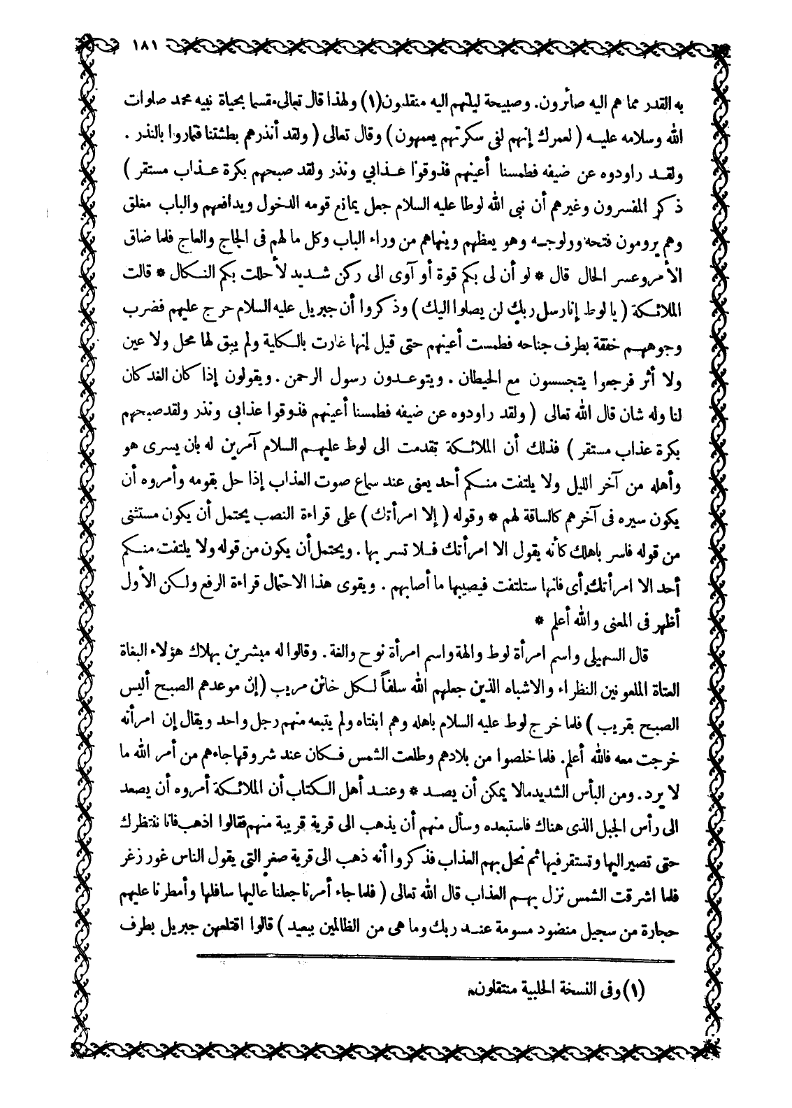 وَلَقَدْ راوَدُوهُ عَنْ ضَيْفِهِ فَطَمَسْنا أَعْيُنَهُمْ فَذُوقُوا عَذابِي وَنُذُرِ وَلَقَدْ صَبَّحَهُمْ بُكْرَةً عَذابٌ مُسْتَقِرٌّ 54: 36- 38 ذَكَرَ الْمُفَسِّرُونَ وَغَيْرُهُمْ أَنَّ نَبِيَّ اللَّهِ لُوطًا عَلَيْهِ السَّلَامُ جَعَلَ يُمَانِعُ قَوْمَهُ الدُّخُولَ وَيُدَافِعُهُمْ والباب مغلق وهم يرومون فتحه ولوجه وهو يعظهم وينهاهم من وراء الباب وكل ما لهم في الجاج والعاج فلما ضاق الأمر وعسر الحال قَالَ لَوْ أَنَّ لِي بِكُمْ قُوَّةً أَوْ آوى الى ركن شديد لَأَحْلَلْتُ بِكُمُ النَّكَالَ قَالَتِ الْمَلَائِكَةُ (يَا لُوطُ إِنَّا رُسُلُ رَبِّكَ لَنْ يَصِلُوا إِلَيْكَ) 11: 81 وَذَكَرُوا أَنَّ جِبْرِيلَ عَلَيْهِ السَّلَامُ خَرَجَ عَلَيْهِمْ فَضَرَبَ وُجُوهَهُمْ خَفْقَةً بِطَرَفِ جَنَاحِهِ فَطُمِسَتْ أَعْيُنُهُمْ حَتَّى قِيلَ إِنَّهَا غَارَتْ بِالْكُلِّيَّةِ وَلَمْ يَبْقَ لَهَا مَحَلٌّ وَلَا عَيْنٌ وَلَا أَثَرٌ فَرَجَعُوا يَتَجَسَّسُونَ مَعَ الْحِيطَانِ. وَيَتَوَعَّدُونَ رَسُولَ الرَّحْمَنِ. وَيَقُولُونَ إِذَا كَانَ الْغَدُ كَانَ لَنَا وَلَهُ شَأنٌ قَالَ اللَّهُ تَعَالَى وَلَقَدْ راوَدُوهُ عَنْ ضَيْفِهِ فَطَمَسْنا أَعْيُنَهُمْ فَذُوقُوا عَذابِي وَنُذُرِ وَلَقَدْ صَبَّحَهُمْ بُكْرَةً عَذابٌ مُسْتَقِرٌّ 54: 37- 38 فَذَلِكَ أَنَّ الْمَلَائِكَةَ تَقَدَّمَتْ إِلَى لُوطٍ عَلَيْهِمُ السَّلَامُ آمِرِينَ لَهُ بِأَنْ يَسْرِيَ هُوَ وَأَهْلُهُ مِنْ آخِرِ اللَّيْلِ وَلَا يَلْتَفِتْ مِنْكُمْ أَحَدٌ يَعْنِي عِنْدَ سَمَاعِ صَوْتِ الْعَذَابِ إِذَا حَلَّ بِقَوْمِهِ وَأَمَرُوهُ أَنْ يَكُونَ سَيْرُهُ فِي آخِرِهِمْ كالساقة لهم وقوله (إِلَّا امْرَأَتَكَ) 11: 81 عَلَى قِرَاءَةِ النَّصْبِ يَحْتَمِلُ أَنْ يَكُونَ مُسْتَثْنًى من قوله فأسر بأهلك كَأَنَّهُ يَقُولُ إِلَّا امْرَأَتَكَ فَلَا تَسْرِ بِهَا. وَيَحْتَمِلُ أَنْ يَكُونَ مِنْ قَوْلِهِ وَلَا يَلْتَفِتْ منكم أحد إِلَّا امْرَأَتَكَ أَيْ فَإِنَّهَا سَتَلْتَفِتُ فَيُصِيبُهَا مَا أَصَابَهُمْ. وَيُقَوِّي هَذَا الِاحْتِمَالَ قِرَاءَةُ الرَّفْعِ وَلَكِنَّ الْأَوَّلَ أَظْهَرُ فِي الْمَعْنَى وَاللَّهُ أَعْلَمُ قَالَ السُّهَيْلِيُّ وَاسْمُ امْرَأَةِ لُوطٍ وَالِهَةُ وَاسْمُ امْرَأَةِ نُوحٍ وَالِغَةُ. وَقَالُوا لَهُ مُبَشِّرِينَ بِهَلَاكِ هَؤُلَاءِ الْبُغَاةِ الْعُتَاةِ الْمَلْعُونِينَ النُّظَرَاءِ وَالْأَشْبَاهِ الَّذِينَ جَعَلَهُمُ اللَّهُ سَلَفًا لِكُلِّ خَائِنٍ مُرِيبٍ (إِنَّ مَوْعِدَهُمُ الصُّبْحُ أَلَيْسَ الصُّبْحُ بِقَرِيبٍ) 11: 81 فَلَمَّا خَرَجَ لُوطٌ عَلَيْهِ السَّلَامُ بِأَهْلِهِ وَهُمُ ابْنَتَاهُ وَلَمْ يَتْبَعْهُ مِنْهُمْ رَجُلٌ وَاحِدٌ وَيُقَالُ إِنَّ امْرَأَتَهُ خَرَجَتْ مَعَهُ فاللَّه أَعْلَمُ. فَلَمَّا خَلَصُوا مِنْ بِلَادِهِمْ وَطَلَعَتِ الشَّمْسُ فَكَانَ عِنْدَ شُرُوقِهَا جَاءَهُمْ مِنْ أَمْرِ اللَّهِ مَا لَا يُرَدُّ. وَمِنَ الْبَأْسِ الشَّدِيدِ مَا لَا يُمْكِنُ أَنْ يُصَدَّ وَعِنْدَ أَهْلِ الْكِتَابِ أَنَّ الْمَلَائِكَةَ أَمَرُوهُ أَنْ يَصْعَدَ إِلَى رَأْسِ الْجَبَلِ الَّذِي هُنَاكَ فَاسْتَبْعَدَهُ وَسَأَلَ مِنْهُمْ أَنْ يَذْهَبَ إِلَى قَرْيَةٍ قَرِيبَةٍ مِنْهُمْ فَقَالُوا اذْهَبْ فَإِنَّا نَنْتَظِرُكَ حَتَّى تَصِيرَ إِلَيْهَا وَتَسْتَقِرَّ فِيهَا ثُمَّ نُحِلَّ بِهِمُ الْعَذَابَ فَذَكَرُوا أَنَّهُ ذَهَبَ إِلَى قَرْيَةِ صُغَرَ الَّتِي يَقُولُ النَّاسُ غَوْرُ زُغَرَ فَلَمَّا أَشْرَقَتِ الشَّمْسُ نَزَلَ بِهِمُ الْعَذَابُ قَالَ اللَّهُ تَعَالَى فَلَمَّا جاءَ أَمْرُنا جَعَلْنا عالِيَها سافِلَها وَأَمْطَرْنا عَلَيْها حِجارَةً مِنْ سِجِّيلٍ مَنْضُودٍ مُسَوَّمَةً عِنْدَ رَبِّكَ وَما هِيَ مِنَ الظَّالِمِينَ بِبَعِيدٍ 11: 82- 83 قالوا اقتلعهن جب