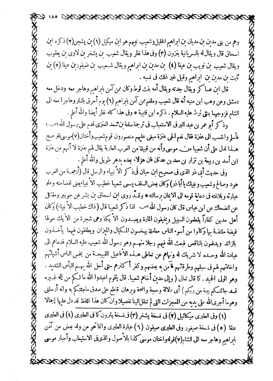 وَهُمْ مِنْ بَنِي مَدْيَنَ بْنِ مديَانَ بْنِ إبراهيم الخليل وَشُعَيْبٌ نَبِيُّهُمْ هُوَ ابْنُ ميكيلَ [1] بْنِ يَشْجَنَ [2] ذَكَرَهُ ابْنُ إِسْحَاقَ قَالَ وَيُقَالُ لَهُ بِالسُّرْيَانِيَّةِ بنزون [3] وفي هذا نظر ويقال شعيب بن يشخر بْنِ لَاوِي بْنِ يَعْقُوبَ وَيُقَالُ شُعَيْبُ بْنُ نويب بن عيفا [4] بْنِ مَدْيَنَ بْنِ إِبْرَاهِيمَ وَيُقَالُ شُعَيْبُ بْنُ ضيفور بن عيفا [5] بْنِ ثَابِتِ بْنِ مَدْيَنَ بْنِ إِبْرَاهِيمَ وَقِيلَ غَيْرُ ذَلِكَ فِي نَسَبِهِ.