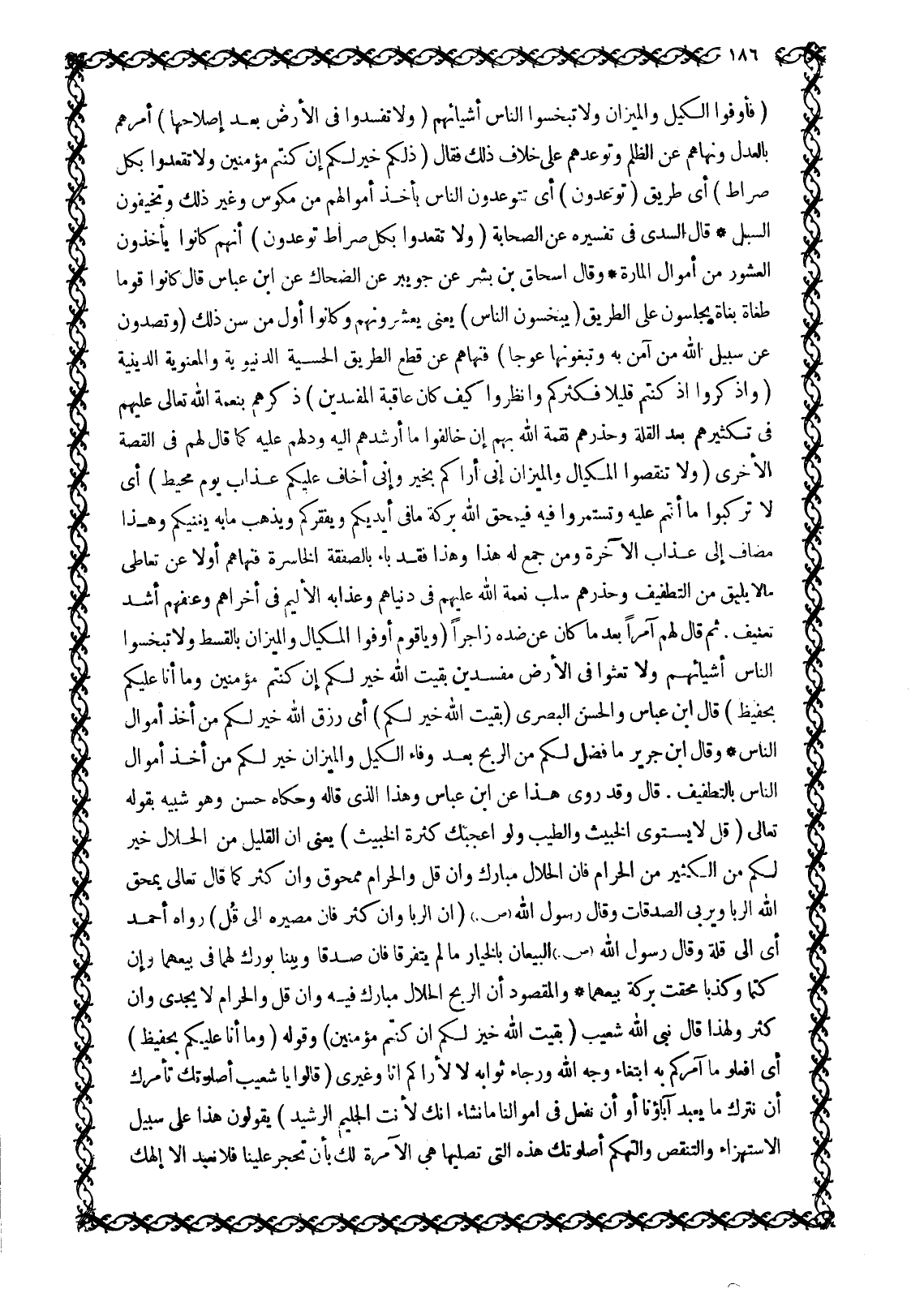 (فَأَوْفُوا الْكَيْلَ وَالْمِيزانَ وَلا تَبْخَسُوا النَّاسَ أَشْياءَهُمْ (وَلا تُفْسِدُوا في الْأَرْضِ بَعْدَ إِصْلاحِها) 7: 85 أَمَرَهُمْ بِالْعَدْلِ وَنَهَاهُمْ عَنِ الظُّلْمِ وَتَوَعَّدَهُمْ عَلَى خِلَافِ ذَلِكَ فَقَالَ (ذلِكُمْ خَيْرٌ لَكُمْ إِنْ كُنْتُمْ مُؤْمِنِينَ وَلا تَقْعُدُوا بِكُلِّ صِراطٍ) 7: 85- 86 أَيْ طَرِيقٍ (تُوعِدُونَ) أَيْ تَتَوَعَّدُونَ النَّاسَ بِأَخْذِ أَمْوَالِهِمْ مِنْ مُكُوسٍ وَغَيْرِ ذَلِكَ وَتُخِيفُونَ السُّبُلَ قَالَ السُّدِّيُّ فِي تَفْسِيرِهِ عَنِ الصَّحَابَةِ (وَلا تَقْعُدُوا بِكُلِّ صِراطٍ تُوعِدُونَ) 7: 86 أَنَّهُمْ كَانُوا يَأْخُذُونَ الْعُشُورَ مِنْ أَمْوَالِ الْمَارَّةِ وَقَالَ إِسْحَاقُ بْنُ بِشْرٍ عَنْ جُوَيْبِرٍ عَنِ الضَّحَّاكِ عَنِ ابْنِ عَبَّاسٍ قَالَ كَانُوا قَوْمًا طُغَاةً بُغَاةً يَجْلِسُونَ عَلَى الطَّرِيقِ (يَبْخَسُونَ النَّاسَ) يَعْنِي يَعْشُرُونَهُمْ وَكَانُوا أَوَّلَ مَنْ سَنَّ ذَلِكَ (وَتَصُدُّونَ عَنْ سَبِيلِ اللَّهِ مَنْ آمَنَ بِهِ وَتَبْغُونَها عِوَجاً) 7: 86 فَنَهَاهُمْ عَنْ قَطْعِ الطَّرِيقِ الْحِسِّيَّةِ الدُّنْيَوِيَّةِ وَالْمَعْنَوِيَّةِ الدِّينِيَّةِ (وَاذْكُرُوا إِذْ كُنْتُمْ قَلِيلًا فَكَثَّرَكُمْ وَانْظُرُوا كَيْفَ كانَ عاقِبَةُ الْمُفْسِدِينَ) 7: 86 ذَكَّرَهُمْ بِنِعْمَةِ اللَّهِ تَعَالَى عَلَيْهِمْ فِي تَكْثِيرِهِمْ بَعْدَ الْقِلَّةِ وَحَذَّرَهُمْ نِقْمَةَ اللَّهِ بِهِمْ إِنْ خَالَفُوا مَا أَرْشَدَهُمْ إِلَيْهِ وَدَلَّهُمْ عَلَيْهِ كَمَا قَالَ لَهُمْ فِي الْقِصَّةِ الْأُخْرَى (وَلا تَنْقُصُوا الْمِكْيالَ وَالْمِيزانَ إِنِّي أَراكُمْ بِخَيْرٍ وَإِنِّي أَخافُ عَلَيْكُمْ عَذابَ يَوْمٍ مُحِيطٍ) 11: 84 أَيْ لَا تَرْكَبُوا مَا أَنْتُمْ عَلَيْهِ وَتَسْتَمِرُّوا فِيهِ فَيَمْحَقَ اللَّهُ بَرَكَةَ مَا فِي أَيْدِيكُمْ وَيُفْقِرَكُمْ وَيُذْهِبَ مَا بِهِ يُغْنِيكُمْ وَهَذَا مُضَافٌ إِلَى عَذَابِ الْآخِرَةِ وَمَنْ جُمِعَ لَهُ هَذَا وَهَذَا فَقَدْ بَاءَ بِالصَّفْقَةِ الْخَاسِرَةِ فَنَهَاهُمْ أَوَّلًا عَنْ تَعَاطِي مَا لَا يَلِيقُ مِنَ التَّطْفِيفِ وَحَذَّرَهُمْ سَلْبَ نِعْمَةِ اللَّهِ عَلَيْهِمْ فِي دُنْيَاهُمْ وَعَذَابَهُ الْأَلِيمَ فِي أُخْرَاهُمْ وَعَنَّفَهُمْ أَشَدَّ تَعْنِيفٍ. ثم قال لهم آمرا بعد ما كَانَ عَنْ ضِدِّهِ زَاجِرًا (وَيا قَوْمِ أَوْفُوا الْمِكْيالَ وَالْمِيزانَ بِالْقِسْطِ وَلا تَبْخَسُوا النَّاسَ أَشْياءَهُمْ وَلا تَعْثَوْا في الْأَرْضِ مُفْسِدِينَ بَقِيَّتُ اللَّهِ خَيْرٌ لَكُمْ إِنْ كُنْتُمْ مُؤْمِنِينَ وَما أَنَا عَلَيْكُمْ بِحَفِيظٍ) 11: 85- 86 قال ابن عباس والحسن البصري (بَقِيَّتُ الله خَيْرٌ لَكُمْ) 11: 86 أَيْ رِزْقُ اللَّهِ خَيْرٌ لَكُمْ مِنْ أَخْذِ أموال الناس وَقَالَ ابْنُ جَرِيرٍ مَا فَضَلَ لَكُمْ مِنَ الرِّبْحِ بَعْدَ وَفَاءِ الْكَيْلِ وَالْمِيزَانِ خَيْرٌ لَكُمْ مِنْ أَخْذِ أَمْوَالِ النَّاسِ بِالتَّطْفِيفِ. قَالَ وَقَدْ رُوِيَ هَذَا عَنِ ابْنِ عَبَّاسٍ وَهَذَا الَّذِي قَالَهُ وَحَكَاهُ حَسَنٌ وَهُوَ شَبِيهٌ بِقَوْلِهِ تَعَالَى قُلْ لَا يَسْتَوِي الْخَبِيثُ وَالطَّيِّبُ وَلَوْ أَعْجَبَكَ كَثْرَةُ الْخَبِيثِ 5: 100 يَعْنِي أَنَّ الْقَلِيلَ مِنَ الْحَلَالِ خَيْرٌ لَكُمْ مِنَ الْكَثِيرِ مِنَ الْحَرَامِ فَإِنَّ الْحَلَالَ مُبَارَكٌ وَإِنْ قَلَّ وَالْحَرَامَ مَمْحُوقٌ وَإِنْ كَثُرَ كَمَا قَالَ تَعَالَى يَمْحَقُ اللَّهُ الرِّبا وَيُرْبِي الصَّدَقاتِ 2: 276 وَقَالَ رَسُولُ اللَّهِ صَلَّى اللَّهُ عَلَيْهِ وَسَلَّمَ (إِنَّ الرِّبَا وَإِنْ كَثُرَ فَإِنَّ مَصِيرَهُ إِلَى قُلٍّ) رَوَاهُ أَحْمَدُ أَيْ إِلَى قِلَّةٍ وَقَالَ رَسُولُ اللَّهِ صَلَّى اللَّهُ عَلَيْهِ وَسَلَّمَ الْبَيِّعَانِ بِالْخِيَارِ مَا لَمْ ي