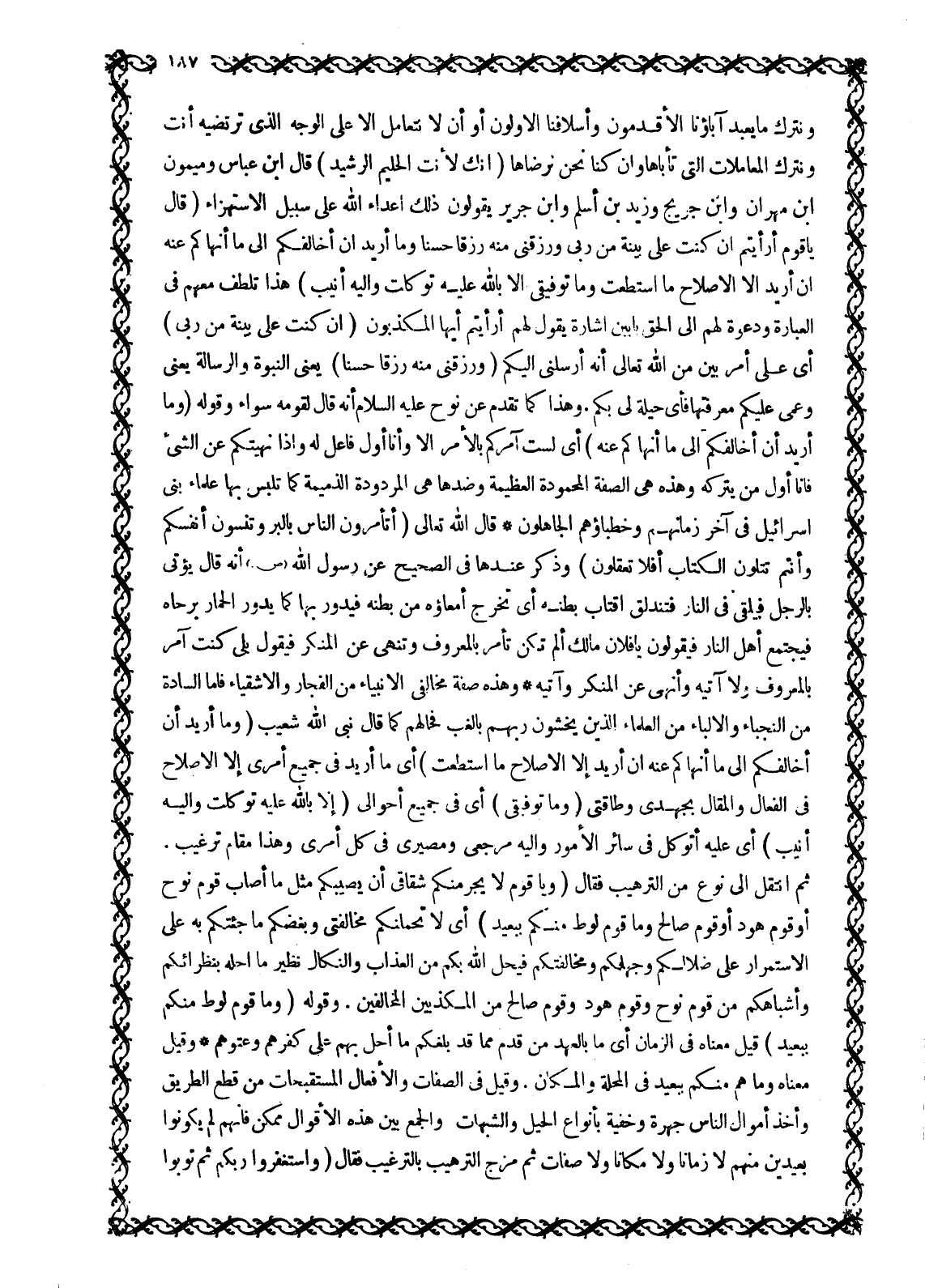 وَنَتْرُكَ مَا يَعْبُدُ آبَاؤُنَا الْأَقْدَمُونَ وَأَسْلَافُنَا الْأَوَّلُونَ أو أن لَا نَتَعَامَلُ إِلَّا عَلَى الْوَجْهِ الَّذِي تَرْتَضِيهِ أَنْتَ وَنَتْرُكُ الْمُعَامَلَاتِ الَّتِي تَأْبَاهَا وَإِنْ كُنَّا نحن نرضاها (إِنَّكَ لَأَنْتَ الْحَلِيمُ الرَّشِيدُ) 11: 87 قال ابن عباس وميمون ابن مِهْرَانَ وَابْنُ جُرَيْجٍ وَزَيْدُ بْنُ أَسْلَمَ وَابْنُ جَرِيرٍ يَقُولُونَ ذَلِكَ أَعْدَاءُ اللَّهِ عَلَى سَبِيلِ الِاسْتِهْزَاءِ (قَالَ يَا قَوْمِ أَرَأَيْتُمْ إِنْ كُنْتُ عَلى بَيِّنَةٍ مِنْ رَبِّي وَرَزَقَنِي مِنْهُ رِزْقاً حَسَناً وَما أُرِيدُ أَنْ أُخالِفَكُمْ إِلى مَا أَنْهاكُمْ عَنْهُ إِنْ أُرِيدُ إِلَّا الْإِصْلاحَ مَا اسْتَطَعْتُ وَما تَوْفِيقِي إِلَّا بِاللَّهِ عَلَيْهِ تَوَكَّلْتُ وَإِلَيْهِ أُنِيبُ) 11: 88 هَذَا تَلَطُّفٌ مَعَهُمْ فِي الْعِبَارَةِ وَدَعْوَةٌ لَهُمْ إِلَى الْحَقِّ بِأَبْيَنِ إِشَارَةٍ يَقُولُ لَهُمْ أَرَأَيْتُمْ أَيُّهَا الْمُكَذِّبُونَ (إِنْ كُنْتُ عَلى بَيِّنَةٍ مِنْ رَبِّي) 11: 28 أَيْ عَلَى أَمْرٍ بَيِّنٍ مِنَ اللَّهِ تَعَالَى أَنَّهُ أَرْسَلَنِي إِلَيْكُمْ (وَرَزَقَنِي مِنْهُ رِزْقاً حَسَناً) 11: 88 يَعْنِي النُّبُوَّةَ وَالرِّسَالَةَ يَعْنِي وَعَمَّى عَلَيْكُمْ مَعْرِفَتَهَا فَأَيُّ حِيلَةٍ لِي بِكُمْ. وَهَذَا كَمَا تَقَدَّمَ عَنْ نُوحٍ عَلَيْهِ السَّلَامُ أَنَّهُ قَالَ لِقَوْمِهِ سَوَاءً وَقَوْلُهُ (وَما أُرِيدُ أَنْ أُخالِفَكُمْ إِلى مَا أَنْهاكُمْ عَنْهُ) 11: 88 أَيْ لَسْتُ آمُرُكُمْ بِالْأَمْرِ إِلَّا وَأَنَا أَوَّلُ فَاعِلٍ لَهُ وَإِذَا نَهَيْتُكُمْ عَنِ الشَّيْءِ فَأَنَا أَوَّلُ مَنْ يَتْرُكُهُ وَهَذِهِ هِيَ الصِّفَةُ الْمَحْمُودَةُ الْعَظِيمَةُ وَضِدُّهَا هِيَ الْمَرْدُودَةُ الذَّمِيمَةُ كَمَا تَلَبَّسَ بِهَا عُلَمَاءُ بَنِي إِسْرَائِيلَ فِي آخِرِ زَمَانِهِمْ وَخُطَبَاؤُهُمُ الْجَاهِلُونَ قَالَ اللَّهُ تَعَالَى أَتَأْمُرُونَ النَّاسَ بِالْبِرِّ وَتَنْسَوْنَ أَنْفُسَكُمْ وَأَنْتُمْ تَتْلُونَ الْكِتابَ أَفَلا تَعْقِلُونَ 2: 44 وذكر عِنْدَهَا فِي الصَّحِيحِ عَنْ رَسُولِ اللَّهِ صَلَّى اللَّهُ عَلَيْهِ وَسَلَّمَ أَنَّهُ قَالَ يُؤْتَى بِالرَّجُلِ فَيُلْقَى فِي النَّارِ فَتَنْدَلِقُ أَقْتَابُ بَطْنِهِ أَيْ تَخْرُجُ أَمْعَاؤُهُ مِنْ بَطْنِهِ فَيَدُورُ بِهَا كَمَا يدور الحمار برحاه فيجتمع أهل النار فيقولون يا فلان ما لك أَلَمْ تَكُنْ تَأْمُرُ بِالْمَعْرُوفِ وَتَنْهَى عَنِ الْمُنْكَرِ فَيَقُولُ بَلَى كُنْتُ آمُرُ بِالْمَعْرُوفِ وَلَا آتِيهِ وَأَنْهَى عَنِ الْمُنْكَرِ وَآتِيهِ وَهَذِهِ صِفَةُ مُخَالِفِي الْأَنْبِيَاءِ مِنَ الْفُجَّارِ وَالْأَشْقِيَاءِ فَأَمَّا السَّادَةُ مِنَ النُّجَبَاءِ وَالْأَلِبَّاءِ مِنَ الْعُلَمَاءِ الَّذِينَ يَخْشَوْنَ رَبَّهُمْ بِالْغَيْبِ فَحَالُهُمْ كَمَا قَالَ نَبِيُّ اللَّهِ شُعَيْبٌ (وَما أُرِيدُ أَنْ أُخالِفَكُمْ إِلى مَا أَنْهاكُمْ عَنْهُ إِنْ أُرِيدُ إِلَّا الْإِصْلاحَ مَا اسْتَطَعْتُ) 11: 88 أَيْ مَا أُرِيدُ فِي جَمِيعِ أَمْرِي إِلَّا الْإِصْلَاحَ فِي الْفِعَالِ وَالْمَقَالِ بِجُهْدِي وَطَاقَتِي (وَما تَوْفِيقِي) 11: 88 أَيْ فِي جَمِيعِ أَحْوَالِي إِلَّا بِاللَّهِ عَلَيْهِ تَوَكَّلْتُ وَإِلَيْهِ أُنِيبُ 11: 88 أَيْ عَلَيْهِ أَتَوَكَّلُ فِي سَائِرِ الْأُمُورِ وَإِلَيْهِ مَرْجِعِي وَمَصِيرِي فِي كُلِّ أَمْرِي وَهَذَا مَقَامُ تَرْغِيبٍ.