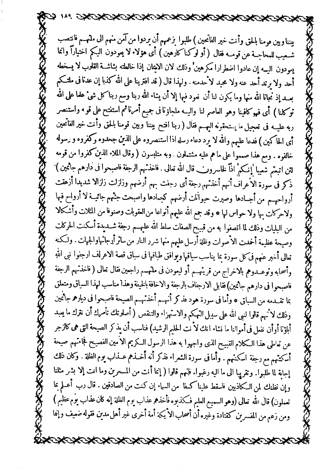 بَيْنَنا وَبَيْنَ قَوْمِنا بِالْحَقِّ وَأَنْتَ خَيْرُ الْفاتِحِينَ) 7: 89 طَلَبُوا بِزَعْمِهِمْ أَنْ يَرُدُّوا مَنْ آمَنُ مِنْهُمْ الى ملتهم فانتصب شعيب للمحلجة عن قومه فقال (أَوَلَوْ كُنَّا كارِهِينَ) 7: 88 أَيْ هَؤُلَاءِ لَا يَعُودُونَ إِلَيْكُمُ اخْتِيَارًا وَإِنَّمَا يَعُودُونَ إِلَيْهِ إِنْ عَادُوا اضْطِرَارًا مُكْرَهِينَ وَذَلِكَ لان الايمان إذا خالطته بشاشة القلوب لا يسخطه أحد ولا يرتد أحد عَنْهُ وَلَا مَحِيدَ لِأَحَدٍ مِنْهُ. وَلِهَذَا قَالَ (قَدِ افْتَرَيْنا عَلَى اللَّهِ كَذِباً إِنْ عُدْنا فِي مِلَّتِكُمْ بَعْدَ إِذْ نَجَّانَا اللَّهُ مِنْها وَما يَكُونُ لَنا أَنْ نَعُودَ فِيها إِلَّا أَنْ يَشاءَ اللَّهُ رَبُّنا وَسِعَ رَبُّنا كُلَّ شَيْءٍ عِلْماً عَلَى الله تَوَكَّلْنا) 7: 89 أَيْ فَهُوَ كَافِينَا وَهُوَ الْعَاصِمُ لَنَا وَإِلَيْهِ ملجاؤنا في جميع أمرنا ثم استفتح على قوله واستنصر ربه عليه فِي تَعْجِيلِ مَا يَسْتَحِقُّونَهُ إِلَيْهِمْ فَقَالَ (رَبَّنَا افْتَحْ بَيْنَنا وَبَيْنَ قَوْمِنا بِالْحَقِّ وَأَنْتَ خَيْرُ الْفاتِحِينَ 7: 89 أَيِ الْحَاكِمِينَ) فَدَعَا عَلَيْهِمْ وَاللَّهُ لَا يَرُدُّ دُعَاءَ رُسُلِهِ إِذَا اسْتَنْصَرُوهُ عَلَى الَّذِينَ جَحَدُوهُ وكفروه وبرسوله خَالَفُوهُ. وَمَعَ هَذَا صَمَّمُوا عَلَى مَا هُمْ عليه مشتملون. وبه متلبسون (وَقال الْمَلَأُ الَّذِينَ كَفَرُوا مِنْ قَوْمِهِ لَئِنِ اتَّبَعْتُمْ شُعَيْباً إِنَّكُمْ إِذاً لَخاسِرُونَ 7: 90 قَالَ اللَّهُ تَعَالَى. فَأَخَذَتْهُمُ الرَّجْفَةُ فَأَصْبَحُوا فِي دارِهِمْ جاثِمِينَ) 7: 91 ذَكَرَ فِي سُورَةِ الْأَعْرَافِ أَنَّهُمْ أَخَذَتْهُمْ رَجْفَةٌ أَيْ رَجَفَتْ بِهِمْ أَرْضُهُمْ وَزُلْزِلَتْ زِلْزَالًا شَدِيدًا أَزْهَقَتْ أَرْوَاحَهُمْ مِنْ أَجْسَادِهَا وَصَيَّرَتْ حَيَوَانَاتِ أَرْضِهِمْ كجمادها وأصبحت جثثهم جَاثِيَةً لَا أَرْوَاحَ فِيهَا وَلَا حَرَكَاتٍ بِهَا وَلَا حَوَاسَّ لَهَا وَقَدْ جَمَعَ اللَّهُ عَلَيْهِمْ أَنْوَاعًا مِنَ الْعُقُوبَاتِ وَصُنُوفًا مِنَ الْمَثُلَاتِ وَأَشْكَالًا مِنَ الْبَلِيَّاتِ وَذَلِكَ لِمَا اتَّصَفُوا بِهِ مِنْ قَبِيحِ الصِّفَاتِ سَلَّطَ اللَّهُ عَلَيْهِمْ رَجْفَةً شَدِيدَةً أَسْكَنَتِ الْحَرَكَاتِ وَصَيْحَةً عَظِيمَةً أَخْمَدَتِ الْأَصْوَاتَ وَظُلَّةً أَرْسَلَ عَلَيْهِمْ مِنْهَا شَرَرَ النَّارِ مِنْ سَائِرِ أَرْجَائِهَا وَالْجِهَاتِ. وَلَكِنَّهُ تَعَالَى أَخْبَرَ عَنْهُمْ فِي كُلِّ سُورَةٍ بِمَا يُنَاسِبُ سِيَاقَهَا وَيُوَافِقُ طِبَاقَهَا في سباق قِصَّةِ الْأَعْرَافِ أَرَجَفُوا نَبِيَّ اللَّهِ وَأَصْحَابَهُ وَتَوَعَّدُوهُمْ بِالْإِخْرَاجِ مِنْ قَرْيَتِهِمْ أَوْ لَيَعُودُنَّ فِي مِلَّتِهِمْ رَاجِعِينَ فَقَالَ تَعَالَى فَأَخَذَتْهُمُ الرَّجْفَةُ فَأَصْبَحُوا فِي دارِهِمْ جاثِمِينَ 7: 91 فقابل الارجفاف بِالرَّجْفَةِ وَالْإِخَافَةَ بِالْخِيفَةِ وَهَذَا مُنَاسِبٌ لِهَذَا السِّيَاقِ ومتعلق بما تقدمه من السباق وَأَمَّا فِي سُورَةِ هُودٍ فَذَكَرَ أَنَّهُمْ أَخَذَتْهُمُ الصَّيْحَةُ فَأَصْبَحُوا فِي دِيارِهِمْ جاثِمِينَ 11: 67 وَذَلِكَ لِأَنَّهُمْ قَالُوا لِنَبِيِّ اللَّهِ عَلَى سَبِيلِ التَّهَكُّمِ وَالِاسْتِهْزَاءِ وَالتَّنَقُّصِ (أَصَلاتُكَ تَأْمُرُكَ أَنْ نَتْرُكَ مَا يَعْبُدُ آباؤُنا أَوْ أَنْ نَفْعَلَ فِي أَمْوالِنا مَا نَشؤُا إِنَّكَ لَأَنْتَ الْحَلِيمُ الرَّشِيدُ) 11: 87 فَنَاسَبَ أَنْ يَذْكُرَ الصَّيْحَةَ الَّتِي هِيَ كَالزَّجْرِ عن تعاطى هذا الكلام القبيح الّذي واجهوا بِهِ هَذَا الرَّسُولَ الْكَرِيمَ الْأَمِينَ الْفَصِيحَ فَجَاءَتْهُمْ صَيْحَةٌ أَسْكَتَتْهُمْ مَعَ رَجْفَةٍ أَسْكَنَتْهُمْ. وَأَمَّا فِي سُورَةِ الشُّعَرَاءِ فَذَكَرَ أَنَّهُ أَخَذَهُمْ عَذَابُ يَوْ