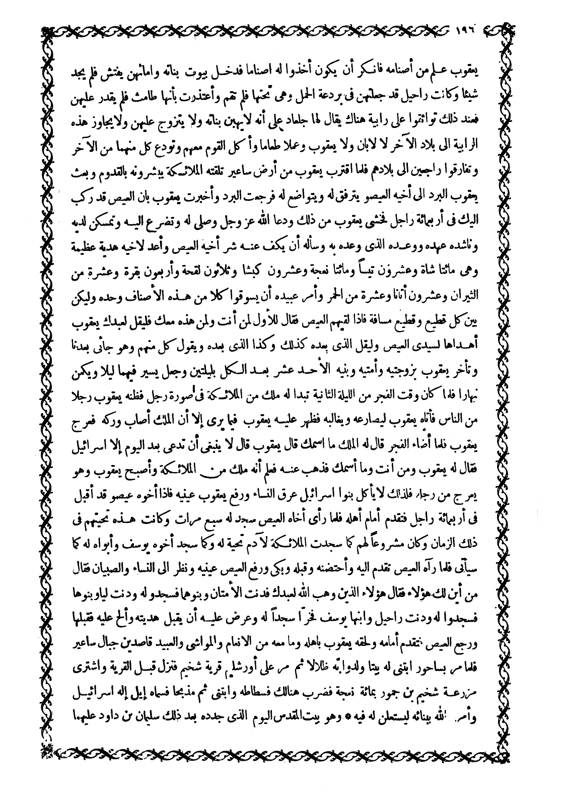 يَعْقُوبَ عِلْمٌ مِنْ أَصْنَامِهِ فَأَنْكَرَ أَنْ يَكُونَ أَخَذُوا لَهُ أَصْنَامًا فَدَخَلَ بُيُوتَ بَنَاتِهِ وَإِمَائِهِنَّ يُفَتِّشُ فَلَمْ يَجِدْ شَيْئًا وَكَانَتْ رَاحِيلُ قَدْ جعلتهن في بردعة الحمل وَهِيَ تَحْتَهَا فَلَمْ تَقُمْ وَاعْتَذَرَتْ بِأَنَّهَا طَامِثٌ فَلَمْ يَقْدِرْ عَلَيْهِنَّ فَعِنْدَ ذَلِكَ تَوَاثَقُوا عَلَى رَابِيَةٍ هُنَاكَ يُقَالُ لَهَا جَلْعَادُ عَلَى أَنَّهُ لا يهبن بَنَاتِهِ وَلَا يَتَزَوَّجُ عَلَيْهِنَّ وَلَا يُجَاوِزُ هَذِهِ الرَّابِيَةَ إِلَى بِلَادِ الْآخَرِ لَا لَابَانُ وَلَا يَعْقُوبُ وَعَمِلَا طَعَامًا وَأَكَلَ الْقَوْمُ مَعَهُمْ وَتَوَدَّعَ كُلٌّ مِنْهُمَا مِنَ الْآخَرِ وَتَفَارَقُوا رَاجِعِينَ إِلَى بِلَادِهِمْ فَلَمَّا اقْتَرَبَ يَعْقُوبُ مِنْ أَرْضِ سَاعِيرَ تَلَقَّتْهُ الْمَلَائِكَةُ يُبَشِّرُونَهُ بِالْقُدُومِ وَبَعَثَ يَعْقُوبُ الْبُرُدَ الى أخيه العيصو يترفق لَهُ وَيَتَوَاضَعُ لَهُ فَرَجَعَتِ الْبُرُدُ وَأَخْبَرَتْ يَعْقُوبَ بِأَنَّ الْعِيصَ قَدْ رَكِبَ إِلَيْكَ فِي أَرْبَعِمِائَةِ رَاجِلٍ فَخَشِيَ يَعْقُوبُ مِنْ ذَلِكَ وَدَعَا اللَّهَ عَزَّ وَجَلَّ وَصَلَّى لَهُ وَتَضَرَّعَ إِلَيْهِ وَتَمَسْكَنَ لَدَيْهِ وَنَاشَدَهُ عَهْدَهُ وَوَعْدَهُ الَّذِي وَعَدَهُ بِهِ وَسَأَلَهُ أَنْ يَكُفَّ عَنْهُ شَرَّ أَخِيهِ الْعِيصَ وَأَعَدَّ لِأَخِيهِ هَدِيَّةً عَظِيمَةً وَهِيَ مِائَتَا شَاةٍ وَعِشْرُونَ تَيْسًا وَمِائَتَا نَعْجَةٍ وَعِشْرُونَ كَبْشًا وَثَلَاثُونَ لِقْحَةً وَأَرْبَعُونَ بَقَرَةً وَعَشَرَةٌ مِنَ الثِّيرَانِ وَعِشْرُونَ أَتَانًا وَعَشَرَةٌ مِنَ الْحُمُرِ وَأَمَرَ عَبِيدَهُ أَنْ يَسُوقُوا كُلًّا مِنْ هَذِهِ الْأَصْنَافِ وَحْدَهُ وَلْيَكُنْ بَيْنَ كُلِّ قَطِيعٍ وَقَطِيعٍ مَسَافَةٌ فَإِذَا لَقِيَهُمُ الْعِيصُ فَقَالَ لِلْأَوَّلِ لِمَنْ أَنْتَ وَلِمَنْ هَذِهِ مَعَكَ فَلْيَقُلْ لِعَبْدِكَ يَعْقُوبَ أَهْدَاهَا لِسَيِّدِي الْعِيصَ وَلْيَقُلِ الَّذِي بَعْدَهُ كَذَلِكَ وَكَذَا الَّذِي بَعْدَهُ ويقول كل منهم وهو جائى بَعْدَنَا وَتَأَخَّرَ يَعْقُوبُ بِزَوْجَتَيْهِ وَأَمَتَيْهِ وَبَنِيهِ الْأَحَدَ عَشَرَ بَعْدَ الْكُلِّ بِلَيْلَتَيْنِ وَجَعَلَ يَسِيرُ فِيهِمَا لَيْلًا وَيَكْمُنُ نَهَارًا فَلَمَّا كَانَ وَقْتُ الْفَجْرِ مِنَ اللَّيْلَةِ الثَّانِيَةِ تَبَدَّى لَهُ مَلَكٌ مِنَ الْمَلَائِكَةِ فِي صُورَةِ رَجُلٍ فَظَنَّهُ يَعْقُوبُ رَجُلًا مِنَ النَّاسِ فَأَتَاهُ يَعْقُوبُ لِيُصَارِعَهُ وَيُغَالِبَهُ فَظَهَرَ عَلَيْهِ يَعْقُوبُ فِيمَا يُرَى إِلَّا أَنَّ الْمَلَكَ أَصَابَ وَرِكَهُ فَعَرَجَ يَعْقُوبُ فَلَمَّا أَضَاءَ الْفَجْرُ قَالَ لَهُ الْمَلَكُ مَا اسْمُكَ قَالَ يَعْقُوبُ قَالَ لَا يَنْبَغِي أَنْ تُدْعَى بَعْدَ الْيَوْمِ إِلَّا إِسْرَائِيلُ فَقَالَ لَهُ يَعْقُوبُ وَمَنْ أَنْتَ وَمَا اسْمُكَ فَذَهَبَ عَنْهُ فَعَلِمَ أَنَّهُ مَلَكٌ مِنَ الْمَلَائِكَةِ وَأَصْبَحَ يَعْقُوبُ وَهُوَ يَعْرُجُ مِنْ رِجْلِهِ فَلِذَلِكَ لَا يَأْكُلُ بَنُو إِسْرَائِيلَ عِرْقَ النساء ورفع يعقوب عينيه فإذا أخوه عيصو قَدْ أَقْبَلَ فِي أَرْبَعِمِائَةِ رَاجِلٍ فَتَقَدَّمَ أَمَامَ أَهْلِهِ فَلَمَّا رَأَى أَخَاهُ الْعِيصَ سَجَدَ لَهُ سَبْعَ مَرَّاتٍ وَكَانَتْ هَذِهِ تَحِيَّتَهُمْ فِي ذَلِكَ الزَّمَانِ وَكَانَ مَشْرُوعًا لَهُمْ كَمَا سَجَدَتِ الْمَلَائِكَةُ لِآدَمَ تَحِيَّةً لَهُ وَكَمَا سَجَدَ إِخْوَةُ يُوسُفَ وَأَبَوَاهُ لَهُ كَمَا سَيَأْتِي فَلَمَّا رَآهُ الْعِيصُ تَقَدَّمَ إِلَيْهِ وَاحْتَضَنَهُ وَقَبَّلَهُ وَبَكَى وَرَفَعَ الْعِيصُ عَيْنَيْهِ وَنَظَرَ إِلَى النِّسَاءِ وَالصِّبْيَانِ فَقَالَ مِنْ أَيْنَ لَكَ هَؤُلَاءِ فَقَالَ هَؤُلَاءِ الَّذ