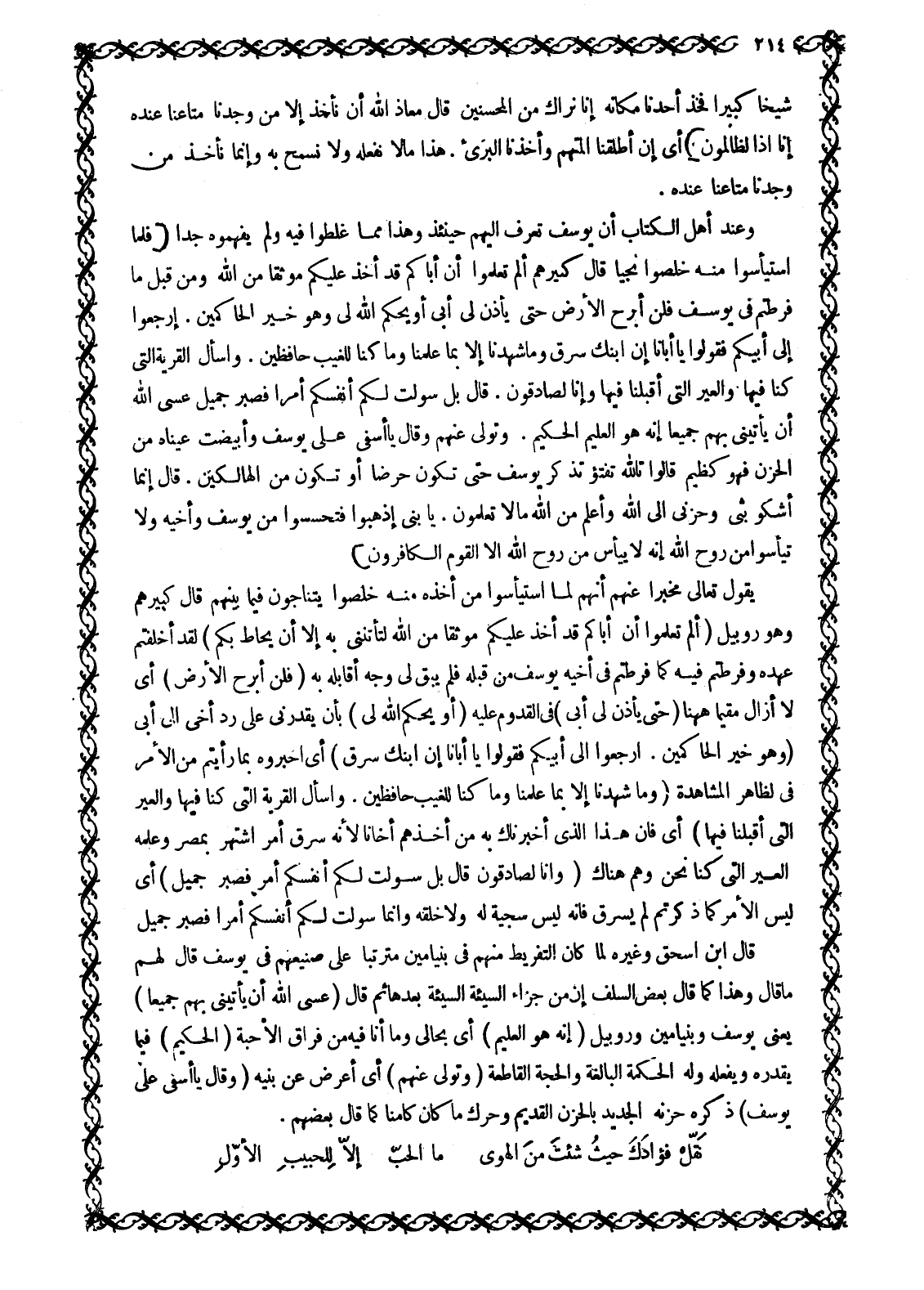 وَعِنْدَ أَهْلِ الْكِتَابِ أَنَّ يُوسُفَ تَعَرَّفَ إِلَيْهِمْ حِينَئِذٍ وَهَذَا مما غلطوا فيه ولم يفهموه جدا (فَلَمَّا اسْتَيْأَسُوا مِنْهُ خَلَصُوا نَجِيًّا قَالَ كَبِيرُهُمْ أَلَمْ تَعْلَمُوا أَنَّ أَباكُمْ قَدْ أَخَذَ عَلَيْكُمْ مَوْثِقاً مِنَ اللَّهِ وَمن قَبْلُ مَا فَرَّطْتُمْ فِي يُوسُفَ فَلَنْ أَبْرَحَ الْأَرْضَ حَتَّى يَأْذَنَ لِي أَبِي أَوْ يَحْكُمَ اللَّهُ لِي وَهُوَ خَيْرُ الْحاكِمِينَ. ارْجِعُوا إِلى أَبِيكُمْ فَقُولُوا يَا أَبانا إِنَّ ابْنَكَ سَرَقَ وَما شَهِدْنا إِلَّا بِما عَلِمْنا وَما كُنَّا لِلْغَيْبِ حافِظِينَ. وَسْئَلِ الْقَرْيَةَ الَّتِي كُنَّا فِيها وَالْعِيرَ الَّتِي أَقْبَلْنا فِيها وَإِنَّا لَصادِقُونَ. قَالَ بَلْ سَوَّلَتْ لَكُمْ أَنْفُسُكُمْ أَمْراً فَصَبْرٌ جَمِيلٌ عَسَى اللَّهُ أَنْ يَأْتِيَنِي بِهِمْ جَمِيعاً إِنَّهُ هُوَ الْعَلِيمُ الْحَكِيمُ. وَتَوَلَّى عَنْهُمْ وَقال يَا أَسَفى عَلى يُوسُفَ وَابْيَضَّتْ عَيْناهُ مِنَ الْحُزْنِ فَهُوَ كَظِيمٌ قالُوا تَاللَّهِ تَفْتَؤُا تَذْكُرُ يُوسُفَ حَتَّى تَكُونَ حَرَضاً أَوْ تَكُونَ من الْهالِكِينَ. قال إِنَّما أَشْكُوا بَثِّي وَحُزْنِي إِلَى اللَّهِ وَأَعْلَمُ مِنَ اللَّهِ ما لا تَعْلَمُونَ. يَا بَنِيَّ اذْهَبُوا فَتَحَسَّسُوا مِنْ يُوسُفَ وَأَخِيهِ وَلا تَيْأَسُوا مِنْ رَوْحِ اللَّهِ إِنَّهُ لَا يَيْأَسُ مِنْ رَوْحِ اللَّهِ إِلَّا الْقَوْمُ الْكافِرُونَ) 12: 80- 87 يَقُولُ تَعَالَى مُخْبِرًا عَنْهُمْ أَنَّهُمْ لَمَّا اسْتَيْأَسُوا مِنْ أَخْذِهِ مِنْهُ خَلَصُوا يَتَنَاجَوْنَ فِيمَا بَيْنَهُمْ قَالَ كَبِيرُهُمْ وَهُوَ رُوبِيلُ (أَلَمْ تَعْلَمُوا أَنَّ أَباكُمْ قَدْ أَخَذَ عَلَيْكُمْ مَوْثِقاً مِنَ اللَّهِ 12: 80 ... لَتَأْتُنَّنِي به إِلَّا أَنْ يُحاطَ بِكُمْ 12: 66) لَقَدْ أَخْلَفْتُمْ عَهْدَهُ وَفَرَّطْتُمْ فِيهِ كَمَا فَرَّطْتُمْ فِي أَخِيهِ يُوسُفَ مِنْ قَبْلِهِ فَلَمْ يَبْقَ لِي وَجْهٌ أُقَابِلُهُ بِهِ (فَلَنْ أَبْرَحَ الْأَرْضَ) 12: 80 أَيْ لَا أَزَالُ مُقِيمًا هَاهُنَا (حَتَّى يَأْذَنَ لِي أَبِي) 12: 80 فِي الْقُدُومِ عَلَيْهِ (أَوْ يَحْكُمَ اللَّهُ لِي) 12: 80 بِأَنْ يُقَدِّرَنِي عَلَى رَدِّ أَخِي إِلَى أَبِي (وَهُوَ خَيْرُ الْحاكِمِينَ. ارْجِعُوا إِلى أَبِيكُمْ فَقُولُوا يا أَبانا إِنَّ ابْنَكَ سَرَقَ) 12: 80- 81 أَيْ أَخْبِرُوهُ بِمَا رَأَيْتُمْ مِنَ الْأَمْرِ فِي لظاهر الْمُشَاهَدَةِ (وَما شَهِدْنا إِلَّا بِما عَلِمْنا وَما كُنَّا لِلْغَيْبِ حافِظِينَ. وَسْئَلِ الْقَرْيَةَ الَّتِي كُنَّا فِيها وَالْعِيرَ الَّتِي أَقْبَلْنا فِيها) 12: 81- 82 أَيْ فَإِنَّ هَذَا الَّذِي أَخْبَرْنَاكَ بِهِ مِنْ أَخْذِهِمْ أَخَانَا لِأَنَّهُ سَرَقَ أَمْرٌ اشْتَهَرَ بِمِصْرَ وَعَلِمَهُ الْعِيرُ الَّتِي كُنَّا نَحْنُ وَهُمْ هُنَاكَ (وَإِنَّا لَصادِقُونَ قَالَ بَلْ سَوَّلَتْ لَكُمْ أَنْفُسُكُمْ أَمْراً فَصَبْرٌ جَمِيلٌ) 12: 82- 83 أَيْ لَيْسَ الْأَمْرُ كَمَا ذَكَرْتُمْ لَمْ يَسْرِقْ فإنه ليس سجية لَهُ وَلَا خُلُقَهُ وَإِنَّمَا سَوَّلَتْ لَكُمْ أَنْفُسُكُمْ أمرا فصبر جميل قَالَ ابْنُ إِسْحَاقَ وَغَيْرُهُ لَمَّا كَانَ التَّفْرِيطُ مِنْهُمْ فِي بِنْيَامِينَ مُتَرَتِّبًا عَلَى صَنِيعِهِمْ فِي يُوسُفَ قَالَ لَهُمْ مَا قَالَ وَهَذَا كَمَا قَالَ بَعْضُ السَّلَفِ إِنَّ مِنْ جَزَاءِ السَّيِّئَةِ السَّيِّئَةَ بَعْدَهَا ثُمَّ قَالَ (عَسَى اللَّهُ أَنْ يَأْتِيَنِي بِهِمْ جَمِيعاً) 12: 83 يَعْنِي يُوسُفَ وَبِنْيَامِينَ وَرُوبِيلَ (إِنَّهُ هُوَ الْعَلِيمُ) 12: 83 أَيْ بِحَالِي وَمَا أَنَا فِيهِ مِنْ فِرَاقِ الْأَحِبَّةِ (الْحَكِيمُ) 12: 83 فِيمَا يُقَدِّرُهُ وَيَفْعَلُهُ وَلَهُ الْحِكْمَةُ البالغة والحجة القاطعة (وَتَوَلَّى عَنْهُمْ) 12: 84 أَيْ أَعْرَضَ عَنْ بَنِيه