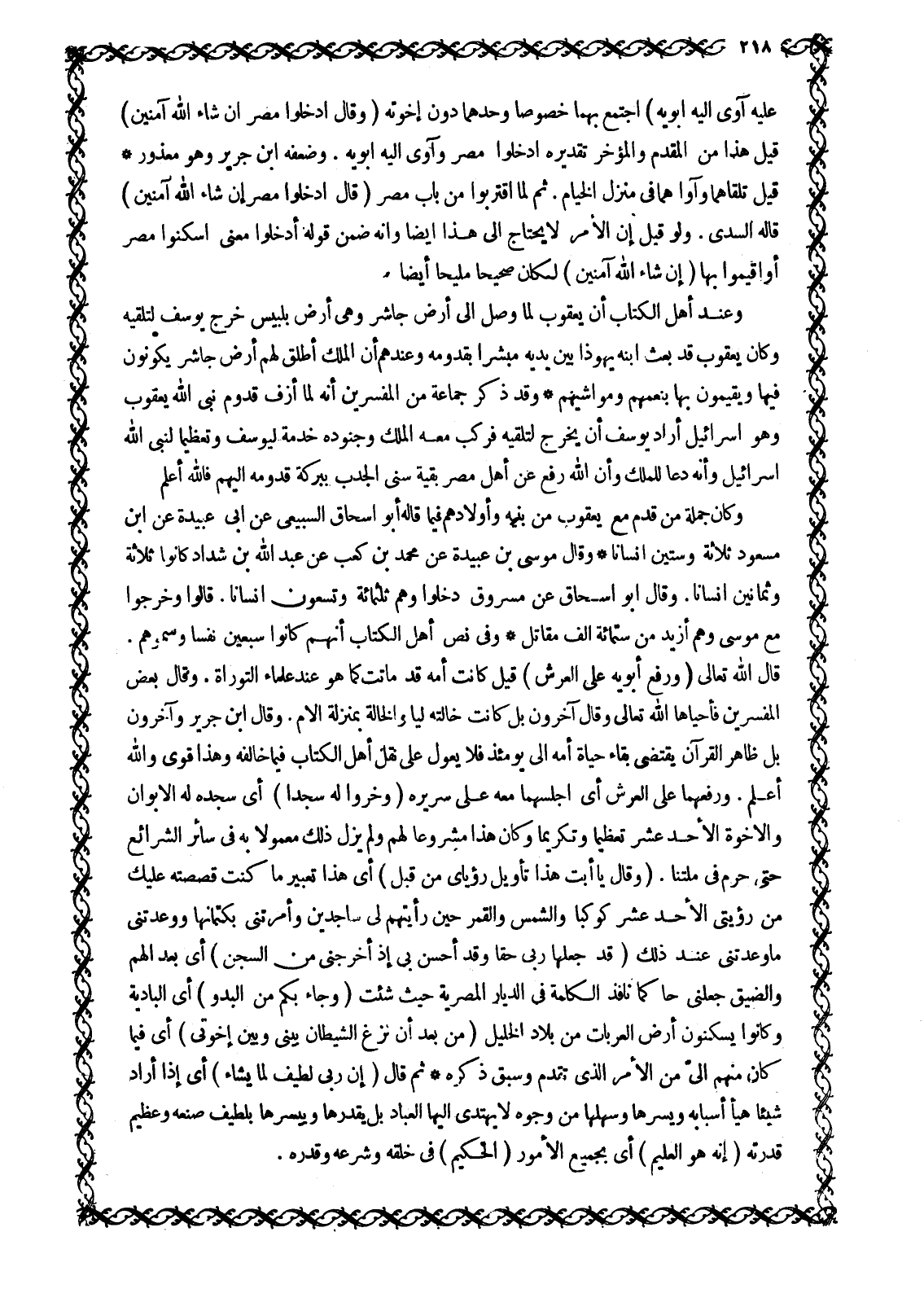 عَلى يُوسُفَ آوى إِلَيْهِ أَبَوَيْهِ) 12: 99 اجْتَمَعَ بِهِمَا خُصُوصًا وَحْدَهُمَا دُونَ إِخْوَتِهِ (وَقال ادْخُلُوا مِصْرَ إِنْ شاءَ الله آمِنِينَ) 12: 99 قِيلَ هَذَا مِنَ الْمُقَدَّمِ وَالْمُؤَخَّرِ تَقْدِيرُهُ ادْخُلُوا مِصْرَ وَآوَى إِلَيْهِ أَبَوَيْهِ. وَضَعَّفَهُ ابْنُ جَرِيرٍ وَهُوَ مَعْذُورٌ قِيلَ تَلَقَّاهُمَا وَآوَاهُمَا فِي مَنْزِلِ الْخِيَامِ. ثُمَّ لَمَّا اقْتَرَبُوا مِنْ بَابِ مِصْرَ (قَالَ ادْخُلُوا مِصْرَ إِنْ شاءَ اللَّهُ آمِنِينَ) 12: 99 قَالَهُ السُّدِّيُّ. وَلَوْ قِيلَ إِنَّ الْأَمْرَ لَا يَحْتَاجُ إِلَى هَذَا أَيْضًا وَأَنَّهُ ضُمِّنَ قَوْلُهُ أدخلوا مغنى اسْكُنُوا مِصْرَ أَوْ أَقِيمُوا بِهَا (إِنْ شاءَ اللَّهُ آمِنِينَ) 12: 99 لَكَانَ صَحِيحًا مَلِيحًا أَيْضًا وَعِنْدَ أَهْلِ الْكِتَابِ أَنَّ يَعْقُوبَ لَمَّا وَصَلَ إِلَى أَرْضِ جَاشِرَ وَهِيَ أَرْضُ بُلْبَيْسَ خَرَجَ يُوسُفُ لِتَلَقِّيهِ وَكَانَ يَعْقُوبُ قَدْ بَعَثَ ابْنَهُ يَهُوذَا بَيْنَ يَدَيْهِ مُبَشِّرًا بِقُدُومِهِ وَعِنْدَهُمْ أَنَّ الْمَلِكَ أَطْلَقَ لَهُمْ أَرْضَ جَاشِرَ يَكُونُونَ فِيهَا وَيُقِيمُونَ بِهَا بِنَعَمِهِمْ وَمَوَاشِيهِمْ وَقَدْ ذَكَرَ جَمَاعَةٌ مِنَ الْمُفَسِّرِينَ أَنَّهُ لَمَّا أَزِفَ قُدُومُ نَبِيِّ اللَّهِ يَعْقُوبَ وَهُوَ إِسْرَائِيلُ أَرَادَ يُوسُفُ أَنْ يَخْرُجَ لِتَلَقِّيهِ فَرَكِبَ مَعَهُ الْمَلِكُ وَجُنُودُهُ خِدْمَةً لِيُوسُفَ وَتَعْظِيمًا لِنَبِيِّ اللَّهِ إِسْرَائِيلَ وَأَنَّهُ دَعَا لِلْمَلِكِ وَأَنَّ اللَّهَ رَفَعَ عَنْ أَهْلِ مِصْرَ بَقِيَّةَ سِنِيِّ الْجَدْبِ بِبَرَكَةِ قُدُومِهِ إِلَيْهِمْ فاللَّه أَعْلَمُ وَكَانَ جُمْلَةُ مَنْ قَدِمَ مَعَ يَعْقُوبَ مِنْ بَنِيهِ وَأَوْلَادِهِمْ فِيمَا قَالَهُ أَبُو إِسْحَاقَ السَّبِيعِيُّ عَنْ أَبِي عُبَيْدَةَ عَنِ ابْنِ مَسْعُودٍ ثَلَاثَةً وَسِتِّينَ إِنْسَانًا وَقَالَ مُوسَى بْنُ عُبَيْدَةَ عَنْ مُحَمَّدِ بْنِ كَعْبٍ عَنْ عَبْدِ اللَّهِ بْنِ شَدَّادٍ كَانُوا ثَلَاثَةً وَثَمَانِينَ إِنْسَانًا. وَقَالَ أَبُو إِسْحَاقَ عَنْ مَسْرُوقٍ دَخَلُوا وَهُمْ ثَلَاثُمِائَةٍ وَتِسْعُونَ إِنْسَانًا: قَالُوا وَخَرَجُوا مَعَ مُوسَى وَهُمْ أَزْيَدُ مِنْ سِتِّمِائَةِ أَلْفِ مُقَاتِلٍ وَفِي نَصِّ أَهْلِ الْكِتَابِ أَنَّهُمْ كَانُوا سَبْعِينَ نَفْسًا وَسَمَّوْهُمْ.