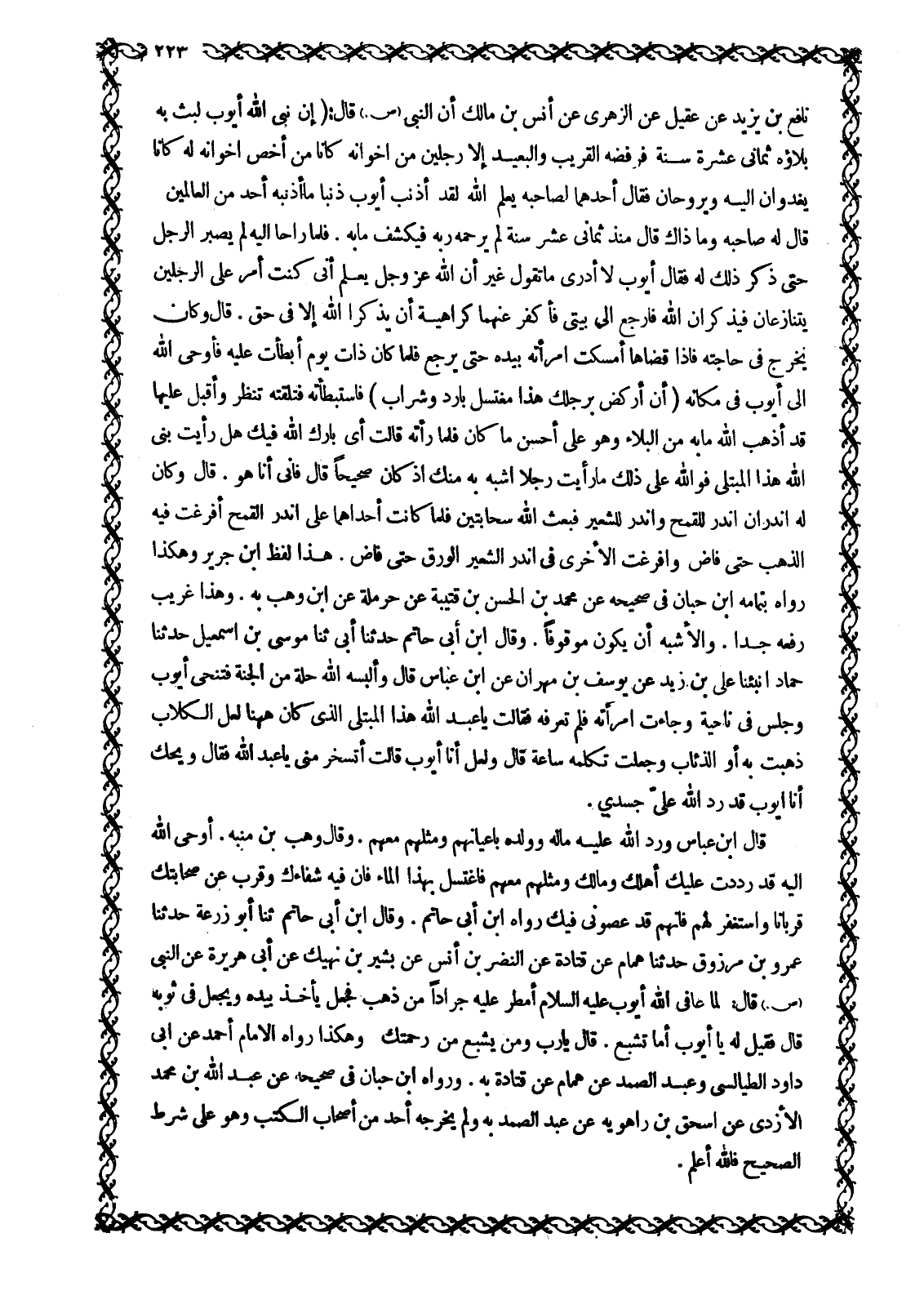 نَافِعُ بْنُ يَزِيدَ عَنْ عُقَيْلٍ عَنِ الزُّهْرِيِّ عَنْ أَنَسِ بْنِ مَالِكٍ أَنَّ النَّبِيَّ صَلَّى اللَّهُ عَلَيْهِ وَسَلَّمَ قَالَ (إِنَّ نَبِيَّ اللَّهِ أَيُّوبَ لَبِثَ بِهِ بَلَاؤُهُ ثَمَانِيَ عَشْرَةَ سَنَةً فَرَفَضَهُ الْقَرِيبُ وَالْبَعِيدُ إِلَّا رَجُلَيْنِ مِنْ إِخْوَانِهِ كَانَا مِنْ أَخَصِّ إِخْوَانِهِ لَهُ كَانَا يَغْدُوَانِ اليه ويروحان فقال أحدهما لصاحبه يعلم الله لَقَدْ أَذْنَبَ أَيُّوبُ ذَنْبًا مَا أَذْنَبَهُ أَحَدٌ مِنَ الْعَالَمِينَ.