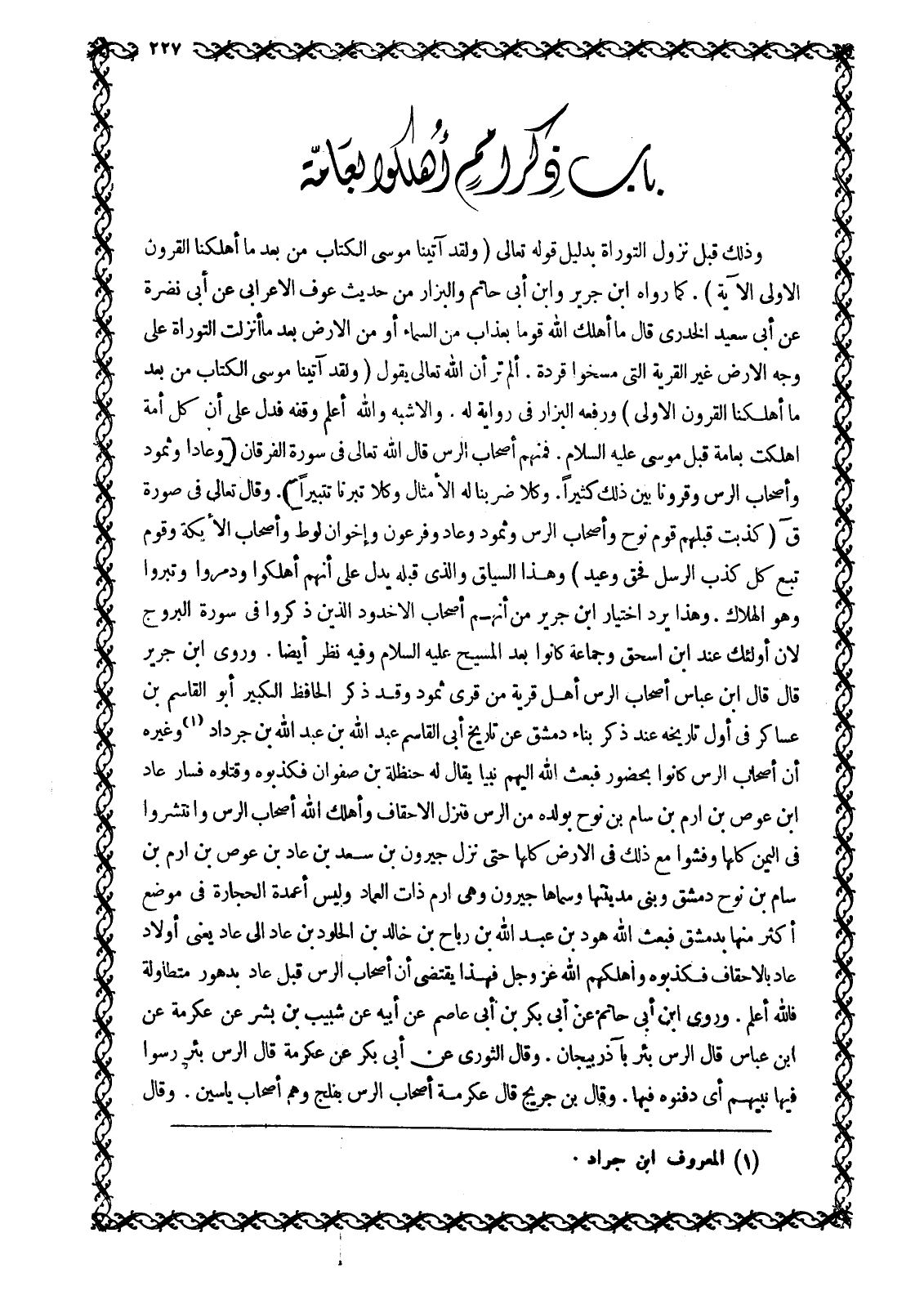 وَذَلِكَ قَبْلَ نُزُولِ التَّوْرَاةِ بِدَلِيلِ قَوْلِهِ تَعَالَى وَلَقَدْ آتَيْنا مُوسَى الْكِتابَ مِنْ بَعْدِ مَا أَهْلَكْنَا الْقُرُونَ الْأُولى 28: 43 الْآيَةَ. كَمَا رَوَاهُ ابْنُ جَرِيرٍ وَابْنُ أَبِي حَاتِمٍ وَالْبَزَّارُ مِنْ حَدِيثِ عَوْفٍ الْأَعْرَابِيِّ عَنْ أَبِي نَضْرَةَ عَنْ أَبِي سَعِيدٍ الْخُدْرِيِّ قَالَ مَا أَهْلَكَ اللَّهُ قَوْمًا بِعَذَابٍ مِنَ السَّمَاءِ أَوْ مِنَ الْأَرْضِ بَعْدَ مَا أُنْزِلَتِ التَّوْرَاةُ عَلَى وَجْهِ الْأَرْضِ غَيْرَ الْقَرْيَةِ الَّتِي مُسِخُوا قِرَدَةً. أَلَمْ تَرَ أَنَّ اللَّهَ تَعَالَى يَقُولُ وَلَقَدْ آتَيْنا مُوسَى الْكِتابَ مِنْ بَعْدِ مَا أَهْلَكْنَا الْقُرُونَ الْأُولى 28: 43 وَرَفَعَهُ الْبَزَّارُ فِي رِوَايَةٍ لَهُ. وَالْأَشْبَهُ وَاللَّهُ أَعْلَمُ وَقْفُهُ فَدَلَّ عَلَى أَنَّ كُلَّ أُمَّةٍ أُهْلِكَتْ بِعَامَّةٍ قَبْلَ مُوسَى عَلَيْهِ السَّلَامُ. فَمِنْهُمْ أَصْحَابُ الرَّسِّ قَالَ اللَّهُ تَعَالَى فِي سُورَةِ الْفُرْقَانِ وَعاداً وَثَمُودَ وَأَصْحابَ الرَّسِّ وَقُرُوناً بَيْنَ ذلِكَ كَثِيراً. وَكُلًّا ضَرَبْنا لَهُ الْأَمْثالَ وَكُلًّا تَبَّرْنا تَتْبِيراً 25: 38- 39. وقال تعالى في صورة ق كَذَّبَتْ قَبْلَهُمْ قَوْمُ نُوحٍ وَأَصْحابُ الرَّسِّ وَثَمُودُ وَعادٌ وَفِرْعَوْنُ وَإِخْوانُ لُوطٍ وَأَصْحابُ الْأَيْكَةِ وَقَوْمُ تُبَّعٍ كُلٌّ كَذَّبَ الرُّسُلَ فَحَقَّ وَعِيدِ 50: 12- 14 وَهَذَا السِّيَاقُ وَالَّذِي قَبْلَهُ يَدُلُّ عَلَى أَنَّهُمْ أُهْلِكُوا وَدُمِّرُوا وَتُبِّرُوا وَهُوَ الْهَلَاكُ. وَهَذَا يَرُدُّ اخْتِيَارَ ابْنِ جَرِيرٍ مِنْ أَنَّهُمْ أَصْحَابُ الْأُخْدُودِ الَّذِينَ ذُكِرُوا فِي سُورَةِ الْبُرُوجِ لِأَنَّ أُولَئِكَ عِنْدَ ابْنِ إِسْحَاقَ وَجَمَاعَةٍ كَانُوا بَعْدَ الْمَسِيحِ عَلَيْهِ السَّلَامُ وَفِيهِ نَظَرٌ أَيْضًا. وَرَوَى ابْنُ جَرِيرٍ قَالَ قَالَ ابْنُ عَبَّاسٍ أَصْحَابُ الرَّسِّ أَهْلُ قَرْيَةٍ مِنْ قُرَى ثَمُودَ وَقَدْ ذَكَرَ الْحَافِظُ الْكَبِيرُ أَبُو الْقَاسِمِ بْنُ عَسَاكِرَ فِي أَوَّلِ تَارِيخِهِ عِنْدَ ذِكْرِ بِنَاءِ دِمَشْقَ عَنْ تاريخ أبى القاسم عبد الله بن عبد الله بن جرداد [1] وَغَيْرِهِ أَنَّ أَصْحَابَ الرَّسِّ كَانُوا بِحَضُورٍ فَبَعْثَ اللَّهُ إِلَيْهِمْ نَبِيًّا يُقَالُ لَهُ حَنْظَلَةُ بْنُ صفوان فكذبوه وقتلوه فسار عاد ابن عَوْصَ بْنِ إِرَمَ بْنِ سَامِ بْنِ نُوحٍ بِوَلَدِهِ مِنَ الرَّسِّ فَنَزَلَ الْأَحْقَافَ وَأَهْلَكَ اللَّهُ أَصْحَابَ الرَّسِّ وَانْتَشَرُوا فِي الْيَمَنِ كُلِّهَا وَفَشَوْا مَعَ ذَلِكَ فِي الْأَرْضِ كُلِّهَا حَتَّى نَزَلَ جَيْرُونُ بْنُ سَعْدِ بْنِ عَادِ بْنِ عَوْصِ بْنِ إِرَمَ بْنِ سَامِ بْنِ نُوحٍ دِمَشْقَ وَبَنَى مَدِينَتَهَا وَسَمَّاهَا جَيْرُونَ وَهِيَ إِرَمُ ذَاتُ الْعِمَادِ وَلَيْسَ أَعْمِدَةُ الْحِجَارَةِ فِي مَوْضِعٍ أَكْثَرَ مِنْهَا بِدِمَشْقَ فَبَعَثَ اللَّهُ هُودَ بْنَ عَبْدِ اللَّهِ بْنِ رَبَاحِ بْنِ خَالِدِ بْنِ الْخُلُودِ بْنِ عَادٍ إِلَى عَادٍ يَعْنِي أَوْلَادَ عَادٍ بِالْأَحْقَافِ فَكَذَّبُوهُ وَأَهْلَكَهُمُ اللَّهُ عَزَّ وَجَلَّ فَهَذَا يَقْتَضِي أَنَّ أَصْحَابَ الرَّسِّ قَبْلَ عَادٍ بِدُهُورٍ مُتَطَاوِلَةٍ فاللَّه أَعْلَمُ. وَرَوَى ابْنُ أَبِي حَاتِمٍ عَنْ أَبِي بَكْرِ بْنِ أَبِي عَاصِمٍ عَنْ أَبِيهِ عَنْ شَبِيبِ بْنِ بِشْرٍ عَنْ عِكْرِمَةَ عَنِ ابْنِ عَبَّاسٍ قَالَ الرَّسُّ بِئْرٌ بِأَذْرَبِيجَانَ. وقال الثوري عن أبى بكر عَنْ عِكْرِمَةَ قَالَ الرَّسُّ بِئْرٌ رَسُّوا فِيهَا نبيهم أي دفنوه فيها. وقال بن جُرَيْجٍ قَالَ عِكْرِمَةُ أَصْحَابُ الرَّسِّ بِفَلْجَ وَهُمْ أصحاب ياسين. وقال
