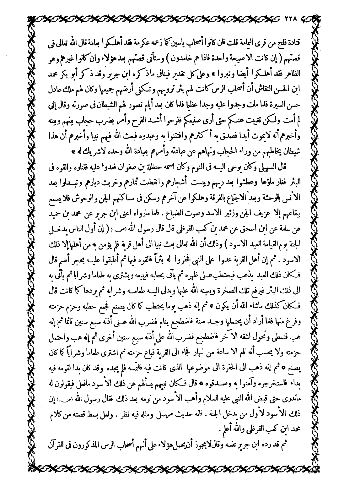 قَتَادَةُ فَلْجُ مِنْ قُرَى الْيَمَامَةِ قُلْتُ فَإِنْ كَانُوا أَصْحَابَ يَاسِينَ كَمَا زَعَمَهُ عِكْرِمَةُ فَقَدْ أُهْلِكُوا بِعَامَّةٍ قَالَ اللَّهُ تَعَالَى فِي قِصَّتِهِمْ (إِنْ كانَتْ إِلَّا صَيْحَةً واحِدَةً فَإِذا هُمْ خامِدُونَ) 36: 29 وَسَتَأْتِي قِصَّتُهُمْ بَعْدَ هَؤُلَاءِ وَإِنْ كَانُوا غَيْرَهُمْ وَهُوَ الظَّاهِرُ فَقَدْ أُهْلِكُوا أَيْضًا وَتُبِّرُوا وَعَلَى كُلِّ تَقْدِيرٍ فَيُنَافِي مَا ذَكَرَهُ ابْنُ جَرِيرٍ وقد ذكر أبو بكر محمد ابن الْحَسَنِ النَّقَّاشُ أَنَّ أَصْحَابَ الرَّسِّ كَانَتْ لَهُمْ بِئْرٌ تَرْوِيهِمْ وَتَكْفِي أَرْضَهُمْ جَمِيعَهَا وَكَانَ لَهُمْ مَلَكٌ عَادِلٌ حَسَنُ السِّيرَةِ فَلَمَّا مَاتَ وَجَدُوا عَلَيْهِ وَجْدًا عَظِيمًا فَلَمَّا كَانَ بَعْدَ أَيَّامٍ تَصَوَّرَ لَهُمُ الشَّيْطَانُ فِي صُورَتِهِ وَقَالَ إِنِّي لَمْ أَمُتْ وَلَكِنْ تَغَيَّبْتُ عَنْكُمْ حَتَّى أَرَى صَنِيعَكُمْ فَفَرِحُوا أَشَدَّ الْفَرَحِ وَأَمَرَ بِضَرْبِ حِجَابٍ بَيْنَهُمْ وَبَيْنَهُ وَأَخْبَرَهُمْ أَنَّهُ لَا يَمُوتُ أَبَدًا فَصَدَّقَ بِهِ أَكْثَرُهُمْ وَافْتَتَنُوا بِهِ وَعَبَدُوهُ فَبَعَثَ اللَّهُ فِيهِمْ نَبِيًّا وَأَخْبَرَهُمْ أَنَّ هَذَا شَيْطَانٌ يُخَاطِبُهُمْ مِنْ وَرَاءِ الْحِجَابِ وَنَهَاهُمْ عَنْ عِبَادَتِهِ وَأَمَرَهُمْ بِعِبَادَةِ اللَّهِ وَحْدَهُ لَا شَرِيكَ لَهُ قَالَ السُّهَيْلِيُّ وَكَانَ يُوحَى إِلَيْهِ فِي النَّوْمِ وَكَانَ اسْمُهُ حَنْظَلَةَ بْنَ صَفْوَانَ فَعَدَوْا عَلَيْهِ فَقَتَلُوهُ وَأَلْقَوْهُ فِي الْبِئْرِ فَغَارَ مَاؤُهَا وَعَطِشُوا بَعْدَ رَيِّهِمْ وَيَبِسَتْ أَشْجَارُهُمْ وَانْقَطَعَتْ ثِمَارُهُمْ وَخَرِبَتْ دِيَارُهُمْ وَتَبَدَّلُوا بَعْدَ الْأُنْسِ بِالْوَحْشَةِ وَبَعْدَ الِاجْتِمَاعِ بِالْفُرْقَةِ وَهَلَكُوا عَنْ آخِرِهِمْ وَسَكَنَ فِي مَسَاكِنِهِمُ الْجِنُّ وَالْوُحُوشُ فَلَا يُسْمَعُ بِبِقَاعِهِمْ إِلَّا عَزِيفُ الْجِنِّ وَزَئِيرُ الْأُسْدِ وَصَوْتُ الضِّبَاعِ. فَأَمَّا مَا رَوَاهُ أَعْنِي ابْنَ جَرِيرٍ عَنْ مُحَمَّدِ بْنِ حُمَيْدٍ عَنْ سَلَمَةَ عَنِ ابْنِ إِسْحَاقَ عَنْ مُحَمَّدِ بْنِ كَعْبٍ الْقُرَظِيِّ قَالَ قَالَ رَسُولُ اللَّهِ صَلَّى اللَّهُ عَلَيْهِ وَسَلَّمَ (إِنَّ أَوَّلَ النَّاسِ يَدْخُلُ الْجَنَّةَ يَوْمَ الْقِيَامَةِ الْعَبْدُ الْأَسْوَدُ) وَذَلِكَ أَنَّ اللَّهَ تَعَالَى بَعَثَ نَبِيًّا إِلَى أَهْلِ قَرْيَةٍ فَلَمْ يُؤْمِنْ بِهِ مِنْ أَهْلِهَا إِلَّا ذَلِكَ الْأَسْوَدُ. ثُمَّ إِنَّ أَهْلَ الْقَرْيَةِ عَدَوْا عَلَى النَّبِيِّ فَحَفَرُوا لَهُ بِئْرًا فَأَلْقَوْهُ فِيهَا ثُمَّ أَطْبَقُوا عَلَيْهِ بِحَجَرٍ أَصَمَّ قَالَ فَكَانَ ذَلِكَ الْعَبْدُ يَذْهَبُ فَيَحْتَطِبُ عَلَى ظَهْرِهِ ثُمَّ يَأْتِي بِحَطَبِهِ فَيَبِيعُهُ وَيَشْتَرِي بِهِ طَعَامًا وَشَرَابًا ثُمَّ يَأْتِي بِهِ إِلَى ذَلِكَ الْبِئْرِ فَيَرْفَعُ تِلْكَ الصَّخْرَةَ وَيُعِينُهُ اللَّهُ عَلَيْهَا وَيُدْلِي إِلَيْهِ طَعَامَهُ وَشَرَابَهُ ثُمَّ يَرُدُّهَا كَمَا كَانَتْ قَالَ فَكَانَ كَذَلِكَ مَا شَاءَ اللَّهُ أَنْ يَكُونَ ثُمَّ إِنَّهُ ذَهَبَ يَوْمًا يَحْتَطِبُ كَمَا كَانَ يَصْنَعُ فَجَمَعَ حَطَبَهُ وَحَزَمَ حُزْمَتَهُ وَفَرَغَ مِنْهَا فَلَمَّا أَرَادَ أَنْ يَحْتَمِلَهَا وَجَدَ سِنَةً فَاضْطَجَعَ يَنَامُ فَضَرَبَ اللَّهُ عَلَى أُذُنِهِ سَبْعَ سِنِينَ نَائِمًا ثُمَّ إِنَّهُ هَبَّ فَتَمَطَّى وَتَحَوَّلَ لِشِقِّهِ الْآخَرِ فَاضْطَجَعَ فَضَرَبَ اللَّهُ عَلَى أُذُنِهِ سَبْعَ سِنِينَ أُخْرَى ثُمَّ إِنَّهُ هَبَّ وَاحْتَمَلَ حُزْمَتَهُ وَلَا يَحْسَبُ أَنَّهُ نَامَ إِلَّا سَاعَةً مِنْ نَهَارٍ فَجَاءَ إِلَى الْقَرْيَةِ فَبَاعَ حُزْمَتَهُ ثُمَّ ا