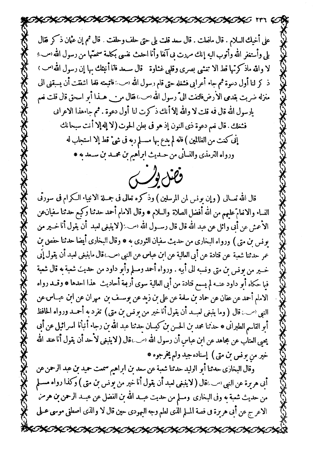 عَلَى أَخِيكَ السَّلَامَ. قَالَ مَا فَعَلْتُ. قَالَ سَعْدٌ قُلْتُ بَلَى حَتَّى حَلَفَ وَحَلَفْتُ. قَالَ ثُمَّ إِنْ عُثْمَانَ ذَكَرَ فَقَالَ بَلَى وَأَسْتَغْفِرُ اللَّهَ وَأَتُوبُ إِلَيْهِ إِنَّكَ مَرَرْتَ بِي آنِفًا وَأَنَا أُحَدِّثُ نَفْسِي بِكَلِمَةٍ سَمِعْتُهَا مِنْ رَسُولِ اللَّهِ صَلَّى اللَّهُ عَلَيْهِ وَسَلَّمَ لَا وَاللَّهِ مَا ذَكَرْتُهَا قَطُّ إِلَّا تَغَشَّى بَصَرِي وَقَلْبِي غِشَاوَةٌ. قَالَ سَعْدٌ فَأَنَا أُنْبِئُكَ بِهَا إِنَّ رَسُولَ اللَّهِ صَلَّى اللَّهُ عَلَيْهِ وَسَلَّمَ ذَكَرَ لَنَا أَوَّلَ دَعْوَةٍ ثُمَّ جَاءَ أَعْرَابِيٌّ فَشَغَلَهُ حَتَّى قَامَ رَسُولُ اللَّهِ صَلَّى اللَّهُ عَلَيْهِ وَسَلَّمَ فَاتَّبَعْتُهُ فَلَمَّا أَشْفَقْتُ أَنْ يَسْبِقَنِي إِلَى مَنْزِلِهِ ضَرَبْتُ بِقَدَمِي الْأَرْضَ فَالْتَفَتَ إِلَيَّ رَسُولُ اللَّهِ صَلَّى اللَّهُ عَلَيْهِ وَسَلَّمَ فَقَالَ مَنْ هَذَا أَبُو إِسْحَاقَ قَالَ قُلْتُ نَعَمْ يَا رَسُولَ اللَّهِ قَالَ فَمَهْ قُلْتُ لَا وَاللَّهِ إِلَّا أَنَّكَ ذَكَرْتَ لَنَا أَوَّلَ دَعْوَةٍ. ثُمَّ جَاءَ هَذَا الْأَعْرَابِيُّ فَشَغَلَكَ. قَالَ نَعَمْ دَعْوَةُ ذِي النُّونِ إِذْ هُوَ فِي بَطْنِ الْحُوتِ (لَا إِلهَ إِلَّا أَنْتَ سُبْحانَكَ إِنِّي كُنْتُ من الظَّالِمِينَ) 21: 87 فَإِنَّهُ لَمْ يَدْعُ بِهَا مُسْلِمٌ رَبَّهُ فِي شَيْءٍ قَطُّ إِلَّا اسْتَجَابَ لَهُ وَرَوَاهُ التِّرْمِذِيُّ وَالنَّسَائِيُّ مِنْ حَدِيثِ إِبْرَاهِيمَ بْنِ مُحَمَّدِ بْنِ سعد به