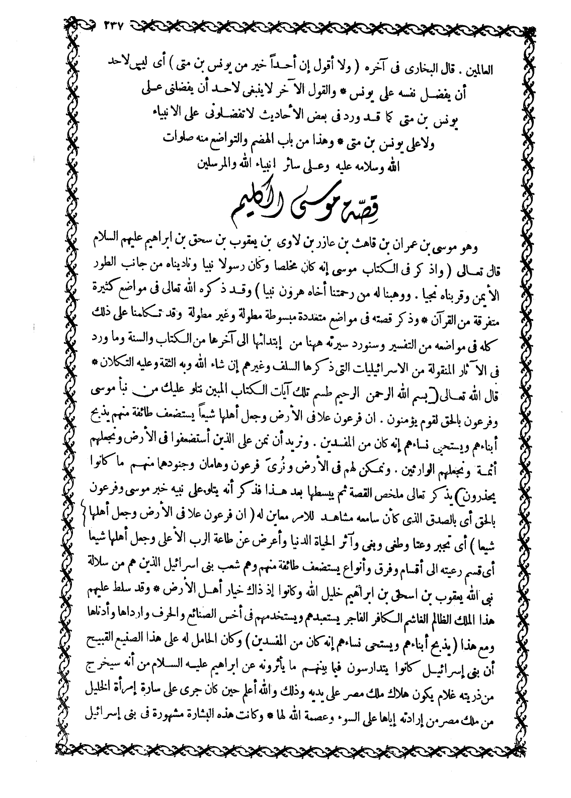 وَهُوَ مُوسَى بْنُ عِمْرَانَ بْنِ قَاهِثَ بْنِ عازر بن لاوى بن يعقوب بن سحق بن إبراهيم عليهم السلام قال تَعَالَى وَاذْكُرْ فِي الْكِتابِ مُوسى إِنَّهُ كانَ مُخْلَصاً وَكانَ رَسُولًا نَبِيًّا وَنادَيْناهُ مِنْ جانِبِ الطُّورِ الْأَيْمَنِ وَقَرَّبْناهُ نَجِيًّا. وَوَهَبْنا لَهُ مِنْ رَحْمَتِنا أَخاهُ هارُونَ نَبِيًّا 19: 51- 53 وَقَدْ ذَكَرَهُ اللَّهُ تَعَالَى فِي مَوَاضِعَ كَثِيرَةٍ مُتَفَرِّقَةٍ مِنَ الْقُرْآنِ وَذَكَرَ قصته في مواضع متعددة مبسوطة مطولة وغير مطولة وَقَدْ تَكَلَّمْنَا عَلَى ذَلِكَ كُلِّهِ فِي مَوَاضِعِهِ مِنَ التَّفْسِيرِ وَسَنُورِدُ سِيرَتَهُ هَاهُنَا مِنِ ابْتِدَائِهَا إِلَى آخِرِهَا مِنَ الْكِتَابِ وَالسَّنَةِ وَمَا وَرَدَ فِي الْآثَارِ الْمَنْقُولَةِ مِنَ الْإِسْرَائِيلِيَّاتِ الَّتِي ذَكَرَهَا السَّلَفُ وَغَيْرُهُمْ إِنْ شَاءَ اللَّهُ وَبِهِ الثِّقَةُ وَعَلَيْهِ التُّكْلَانُ قال الله تعالى بِسْمِ الله الرَّحْمنِ الرَّحِيمِ طسم تِلْكَ آياتُ الْكِتابِ الْمُبِينِ نَتْلُوا عَلَيْكَ مِنْ نَبَإِ مُوسى وَفِرْعَوْنَ بِالْحَقِّ لِقَوْمٍ يُؤْمِنُونَ. إِنَّ فِرْعَوْنَ عَلا فِي الْأَرْضِ وَجَعَلَ أَهْلَها شِيَعاً يَسْتَضْعِفُ طائِفَةً مِنْهُمْ يُذَبِّحُ أَبْناءَهُمْ وَيَسْتَحْيِي نِساءَهُمْ إِنَّهُ كانَ مِنَ الْمُفْسِدِينَ. وَنُرِيدُ أَنْ نَمُنَّ عَلَى الَّذِينَ اسْتُضْعِفُوا فِي الْأَرْضِ وَنَجْعَلَهُمْ أَئِمَّةً وَنَجْعَلَهُمُ الْوارِثِينَ. وَنُمَكِّنَ لَهُمْ فِي الْأَرْضِ وَنُرِيَ فِرْعَوْنَ وَهامانَ وَجُنُودَهُما مِنْهُمْ مَا كانُوا يَحْذَرُونَ 28: 0- 6 يَذْكُرُ تَعَالَى مُلَخَّصَ الْقِصَّةِ ثُمَّ يَبْسُطُهَا بَعْدَ هذا فذكر أنه يَتْلُو عَلَى نَبِيِّهِ خَبَرَ مُوسَى وَفِرْعَوْنَ بِالْحَقِّ أَيْ بِالصِّدْقِ الَّذِي كَأَنَّ سَامِعَهُ مُشَاهِدٌ لِلْأَمْرِ مُعَايِنٌ لَهُ (إِنَّ فِرْعَوْنَ عَلا فِي الْأَرْضِ وَجَعَلَ أَهْلَها شِيَعاً) 28: 4 أَيْ تَجَبَّرَ وَعَتَا وَطَغَى وَبَغَى وَآثَرَ الْحَيَاةَ الدُّنْيَا وَأَعْرَضَ عَنْ طَاعَةِ الرَّبِّ الْأَعْلَى وَجَعَلَ أهلها شيعا أَيْ قَسَّمَ رَعِيَّتَهُ إِلَى أَقْسَامٍ وَفِرَقٍ وَأَنْوَاعٍ يستضعف طائفة منهم وَهُمْ شَعْبُ بَنِي إِسْرَائِيلَ الَّذِينَ هُمْ مِنْ سُلَالَةِ نَبِيِّ اللَّهِ يَعْقُوبَ بْنِ إِسْحَاقَ بْنِ إِبْرَاهِيمَ خَلِيلِ اللَّهِ وَكَانُوا إِذْ ذَاكَ خِيَارَ أهل الأرض وقد سلط عَلَيْهِمْ هَذَا الْمَلِكَ الظَّالِمَ الْغَاشِمَ الْكَافِرَ الْفَاجِرَ يستعبدهم ويستخدمهم في أخس الصنائع والحرف وارداها وَأَدْنَاهَا وَمَعَ هَذَا (يُذَبِّحُ أَبْناءَهُمْ وَيَسْتَحْيِي نِساءَهُمْ إِنَّهُ كانَ مِنَ الْمُفْسِدِينَ) 28: 4 وَكَانَ الْحَامِلُ لَهُ عَلَى هَذَا الصَّنِيعِ الْقَبِيحِ أَنَّ بَنِي إِسْرَائِيلَ كَانُوا يَتَدَارَسُونَ فِيمَا بَيْنَهُمْ ما يأثرونه عن إبراهيم عَلَيْهِ السَّلَامُ مِنْ أَنَّهُ سَيَخْرُجُ مِنْ ذُرِّيَّتِهِ غُلَامٌ يَكُونُ هَلَاكُ مَلِكِ مِصْرَ عَلَى يَدَيْهِ وذلك والله أعلم حين كان جَرَى عَلَى سَارَّةَ امْرَأَةِ الْخَلِيلِ مِنْ مَلِكِ مِصْرَ مِنْ إِرَادَتِهِ إِيَّاهَا عَلَى السُّوءِ وَعِصْمَةِ اللَّهِ لَهَا وَكَانَتْ هَذِهِ الْبِشَارَةُ مَشْهُورَةً فِي بنى إسرائيل