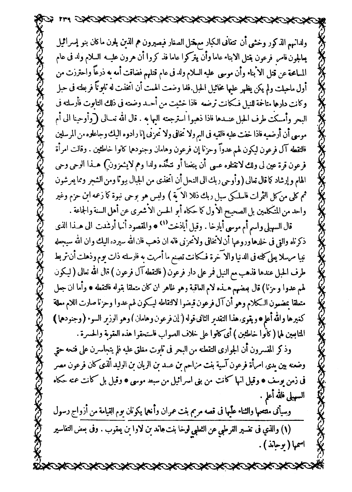 قَالَ السُّهَيْلِيُّ وَاسْمُ أُمِّ موسى أيارخا. وَقِيلَ أَيَاذَخْتُ [1] وَالْمَقْصُودُ أَنَّهَا أُرْشِدَتْ إِلَى هَذَا الَّذِي ذَكَرْنَاهُ وَأُلْقِيَ فِي خَلَدِهَا وَرُوعِهَا أَنْ لَا تَخَافِي وَلَا تَحْزَنِي فَإِنَّهُ إِنْ ذَهَبَ فَإِنَّ اللَّهَ سَيَرُدُّهُ إِلَيْكِ وَإِنَّ اللَّهَ سَيَجْعَلُهُ نَبِيًّا مُرْسَلًا يُعْلِي كَلِمَتَهُ فِي الدُّنْيَا وَالْآخِرَةِ فَكَانَتْ تَصْنَعُ مَا أُمِرَتْ بِهِ فَأَرْسَلَتْهُ ذَاتَ يَوْمٍ وَذَهَلَتْ أَنْ تَرْبُطَ طَرَفَ الْحَبْلِ عِنْدَهَا فَذَهَبَ مَعَ النِّيلِ فَمَرَّ عَلَى دَارِ فِرْعَوْنَ (فَالْتَقَطَهُ آلُ فِرْعَوْنَ) 28: 8 قَالَ اللَّهُ تَعَالَى لِيَكُونَ لَهُمْ عَدُوًّا وَحَزَناً 28: 8 قَالَ بَعْضُهُمْ هَذِهِ لَامُ الْعَاقِبَةِ وَهُوَ ظَاهِرٌ إِنْ كَانَ مُتَعَلِّقًا بِقَوْلِهِ فَالْتَقَطَهُ وَأَمَّا إِنْ جُعِلَ مُتَعَلِّقًا بِمَضْمُونِ الْكَلَامِ وَهُوَ أَنَّ آلَ فِرْعَوْنَ قُيِّضُوا لِالْتِقَاطِهِ لِيَكُونَ لَهُمْ عَدُوًّا وَحَزَنًا صارت اللام معللة كغيرها والله أعلم ويقوى هذا التقدير الثاني قوله (إِنَّ فِرْعَوْنَ وَهامانَ) 28: 8 وَهُوَ الْوَزِيرُ السُّوءُ (وَجُنُودَهُما) 28: 6 الْمُتَابِعِينَ لَهُمَا (كانُوا خاطِئِينَ) 28: 8 أَيْ كَانُوا عَلَى خِلَافِ الصَّوَابِ فَاسْتَحَقُّوا هَذِهِ الْعُقُوبَةَ وَالْحَسْرَةَ.