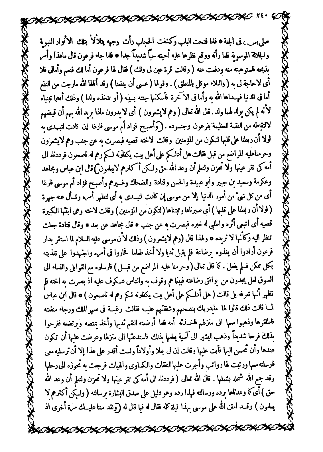 صلى صَلَّى اللَّهُ عَلَيْهِ وَسَلَّمَ فِي الْجَنَّةِ فَلَمَّا فَتَحَتِ الْبَابَ وَكَشَفَتِ الْحِجَابَ رَأَتْ وَجْهَهُ يَتَلَأْلَأُ بِتِلْكَ الْأَنْوَارِ النَّبَوِيَّةِ وَالْجَلَالَةِ الْمُوسَوِيَّةِ فَلَمَّا رَأَتْهُ ووقع نظرها عليه أحبته حبا شديدا جدا فَلَمَّا جَاءَ فِرْعَوْنُ قَالَ مَا هَذَا وَأَمَرَ بذبحه فاستوهبته منه ودفعت عنه (وقالت قُرَّتُ عَيْنٍ لِي وَلَكَ) 28: 9 فقال لها فرعون أما لك فنعم وأمالى فَلَا أَيْ لَا حَاجَةَ لِي بِهِ (وَالْبَلَاءُ موكل بالمنطق) . وقولها (عَسى أَنْ يَنْفَعَنا) 28: 9 وَقَدْ أَنَالَهَا اللَّهُ مَا رَجَتْ مِنَ النَّفْعِ أَمَّا فِي الدُّنْيَا فَهَدَاهَا اللَّهُ بِهِ وَأَمَّا فِي الْآخِرَةِ فَأَسْكَنَهَا جَنَّتَهُ بِسَبَبِهِ (أَوْ نَتَّخِذَهُ وَلَداً) 28: 9 وذلك أنهما تَبَنَّيَاهُ لِأَنَّهُ لَمْ يَكُنْ يُولَدُ لَهُمَا وَلَدٌ. قال الله تعالى وَهُمْ لا يَشْعُرُونَ 28: 9 أَيْ لَا يَدْرُونَ مَاذَا يُرِيدُ اللَّهُ بِهِمْ أَنَّ قَيَّضَهُمْ لِالْتِقَاطِهِ مِنَ النِّقْمَةِ الْعَظِيمَةِ بِفِرْعَوْنَ وجنوده. (وَأَصْبَحَ فُؤادُ أُمِّ مُوسى فارِغاً إِنْ كادَتْ لَتُبْدِي بِهِ لَوْلا أَنْ رَبَطْنا عَلى قَلْبِها لِتَكُونَ مِنَ الْمُؤْمِنِينَ وَقالَتْ لِأُخْتِهِ قُصِّيهِ فَبَصُرَتْ بِهِ عَنْ جُنُبٍ وَهُمْ لَا يَشْعُرُونَ وَحَرَّمْنا عَلَيْهِ الْمَراضِعَ مِنْ قَبْلُ فَقالَتْ هَلْ أَدُلُّكُمْ عَلى أَهْلِ بَيْتٍ يَكْفُلُونَهُ لَكُمْ وَهُمْ لَهُ ناصِحُونَ فَرَدَدْناهُ إِلى أُمِّهِ كَيْ تَقَرَّ عَيْنُها وَلا تَحْزَنَ وَلِتَعْلَمَ أَنَّ وَعْدَ اللَّهِ حَقٌّ وَلكِنَّ أَكْثَرَهُمْ لا يَعْلَمُونَ) 28: 10- 13 قَالَ ابْنُ عَبَّاسٍ وَمُجَاهِدٌ وَعِكْرِمَةُ وَسَعِيدُ بْنُ جُبَيْرٍ وَأَبُو عُبَيْدَةَ وَالْحَسَنُ وَقَتَادَةُ وَالضَّحَّاكُ وَغَيْرُهُمْ وأَصْبَحَ فُؤادُ أُمِّ مُوسى فارِغاً 28: 10 أَيْ مَنْ كُلِّ شَيْءٍ مِنْ أُمُورِ الدُّنْيَا إلا من موسى إن كادت لتبدي به أَيْ لَتُظْهِرُ أَمْرَهُ وَتَسْأَلُ عَنْهُ جَهْرَةً (لَوْلا أَنْ رَبَطْنا عَلى قَلْبِها) 28: 10 أَيْ صَبَّرْنَاهَا وَثَبَّتْنَاهَا (لِتَكُونَ مِنَ الْمُؤْمِنِينَ) 28: 10 وَقَالَتْ لأخته وهي ابنتها الكبيرة قصيه أي اتبعى أثره واطلبى له خبره فبصرت به عن جنب قَالَ مُجَاهِدٌ عَنْ بُعْدٍ وَقَالَ قَتَادَةُ جَعَلَتْ تَنْظُرُ إِلَيْهِ وَكَأَنَّهَا لَا تُرِيدُهُ وَلِهَذَا قَالَ (وَهُمْ لا يَشْعُرُونَ) 28: 9 وَذَلِكَ لِأَنَّ مُوسَى عَلَيْهِ السَّلَامُ لَمَّا اسْتَقَرَّ بِدَارِ فِرْعَوْنَ أَرَادُوا أَنْ يُغَذُّوهُ بِرَضَاعَةٍ فَلَمْ يَقْبَلْ ثَدْيًا وَلَا أَخَذَ طَعَامًا فَحَارُوا فِي أمره واجتهدوا عَلَى تَغْذِيَتِهِ بِكُلِّ مُمْكِنٍ فَلَمْ يَفْعَلْ. كَمَا قَالَ تَعَالَى وَحَرَّمْنا عَلَيْهِ الْمَراضِعَ مِنْ قَبْلُ 28: 12 فأرسلوه مع القوابل والنساء الى السوق لعل يَجِدُونَ مَنْ يُوَافِقُ رَضَاعَتَهُ فَبَيْنَمَا هُمْ وُقُوفٌ بِهِ وَالنَّاسُ عُكُوفٌ عَلَيْهِ إِذْ بَصُرَتْ بِهِ أُخْتُهُ فَلَمْ تُظْهِرْ أَنَّهَا تَعْرِفُهُ بَلْ قَالَتْ (هَلْ أَدُلُّكُمْ عَلى أَهْلِ بَيْتٍ يَكْفُلُونَهُ لَكُمْ وَهُمْ لَهُ ناصِحُونَ) 28: 12 قَالَ ابْنُ عَبَّاسٍ لَمَّا قَالَتْ ذَلِكَ قَالُوا لَهَا مَا يُدْرِيكِ بِنُصْحِهِمْ وَشَفَقَتِهِمْ علَيْهِ فَقَالَتْ رَغْبَةً فِي صِهْرِ الْمَلِكِ وَرَجَاءَ مَنْفَعَتِهِ فَأَطْلَقُوهَا وَذَهَبُوا مَعَهَا إِلَى مَنْزِلِهِمْ فَأَخَذَتْهُ أُمُّهُ فَلَمَّا أَرْضَعَتْهُ الْتَقَمَ ثَدْيَهَا وَأَخَذَ يَمْتَصُّهُ وَيَرْتَضِعُهُ فَفَرِحُوا بِذَلِكَ فَرَحًا شَدِيدًا وَذَهَبَ الْبَشِيرُ إِلَى آسِيَةَ يُعْلِمُهَا بِذَلِكَ فَاسْتَدْعَتْهَا إِلَى مَنْزِلِهَا وَعَرَضَتْ عَلَيْهَا أَنْ تَكُونَ عِنْدَهَا وَأَنَّ تُحْسِنَ إِلَيْهَا فَأَبَت