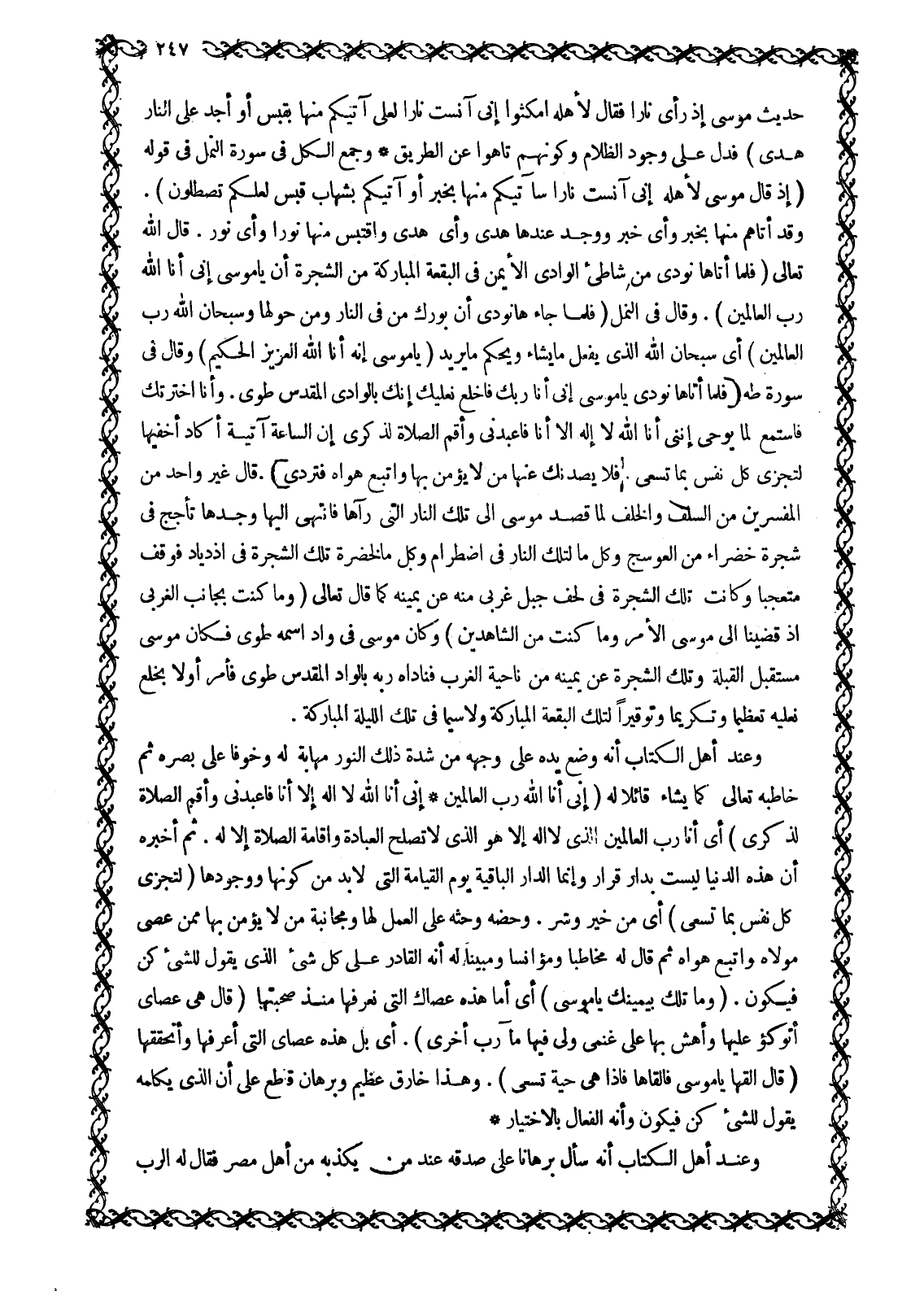 وَقَدْ أَتَاهُمْ مِنْهَا بِخَبَرٍ وَأَيُّ خَبَرٍ وَوَجَدَ عِنْدَهَا هُدًى وَأَيُّ هُدًى وَاقْتَبَسَ مِنْهَا نُورًا وَأَيُّ نُورٍ. قَالَ اللَّهُ تَعَالَى فَلَمَّا أَتاها نُودِيَ من شاطِئِ الْوادِ الْأَيْمَنِ فِي الْبُقْعَةِ الْمُبارَكَةِ مِنَ الشَّجَرَةِ أَنْ يا مُوسى إِنِّي أَنَا الله رَبُّ الْعالَمِينَ 28: 30. وقال فِي النَّمْلِ فَلَمَّا جاءَها نُودِيَ أَنْ بُورِكَ مَنْ فِي النَّارِ وَمن حَوْلَها وَسُبْحانَ اللَّهِ رَبِّ الْعالَمِينَ 27: 8 أَيْ سُبْحَانَ اللَّهِ الَّذِي يَفْعَلُ مَا يَشَاءُ ويحكم ما يريد (يا مُوسى إِنَّهُ أَنَا الله الْعَزِيزُ الْحَكِيمُ) 27: 9 وَقَالَ فِي سُورَةِ طه فَلَمَّا أَتاها نُودِيَ يَا مُوسى إِنِّي أَنَا رَبُّكَ فَاخْلَعْ نَعْلَيْكَ إِنَّكَ بِالْوادِ الْمُقَدَّسِ طُوىً. وَأَنَا اخْتَرْتُكَ فَاسْتَمِعْ لِما يُوحى إِنَّنِي أَنَا اللَّهُ لَا إِلهَ إِلَّا أَنَا فَاعْبُدْنِي وَأَقِمِ الصَّلاةَ لِذِكْرِي إِنَّ السَّاعَةَ آتِيَةٌ أَكادُ أُخْفِيها لِتُجْزى كُلُّ نَفْسٍ بِما تَسْعى فَلا يَصُدَّنَّكَ عَنْها مَنْ لَا يُؤْمِنُ بِها وَاتَّبَعَ هَواهُ فَتَرْدى) 20: 11- 16. قَالَ غَيْرُ وَاحِدٍ مِنَ الْمُفَسِّرِينَ مِنَ السَّلَفِ وَالْخَلَفِ لَمَّا قَصَدَ مُوسَى إِلَى تِلْكَ النَّارِ الَّتِي رَآهَا فَانْتَهَى إِلَيْهَا وَجَدَهَا تَأَجَّجُ فِي شَجَرَةٍ خَضْرَاءَ مِنَ الْعَوْسَجِ وَكُلُّ مَا لِتِلْكَ النَّارِ فِي اضْطِرَامٍ وَكُلُّ مَا لِخُضْرَةِ تِلْكَ الشَّجَرَةِ فِي ازْدِيَادٍ فَوَقَفَ مُتَعَجِّبًا وَكَانَتْ تِلْكَ الشَّجَرَةُ فِي لِحْفِ جَبَلٍ غَرْبِيٍّ مِنْهُ عَنْ يَمِينِهِ كَمَا قَالَ تَعَالَى وَما كُنْتَ بِجانِبِ الْغَرْبِيِّ إِذْ قَضَيْنا إِلى مُوسَى الْأَمْرَ وَما كُنْتَ من الشَّاهِدِينَ 28: 44 وَكَانَ مُوسَى فِي وَادٍ اسْمُهُ طُوًى فَكَانَ مُوسَى مُسْتَقْبَلَ الْقِبْلَةِ وَتِلْكَ الشَّجَرَةُ عَنْ يَمِينِهِ مِنْ نَاحِيَةِ الْغَرْبِ فَنَادَاهُ رَبُّهُ بِالْوَادِ الْمُقَدَّسِ طُوًى فَأُمِرَ أَوَّلًا بِخَلْعِ نَعْلَيْهِ تَعْظِيمًا وَتَكْرِيمًا وَتَوْقِيرًا لِتِلْكَ الْبُقْعَةِ الْمُبَارَكَةِ وَلَا سِيَّمَا فِي تِلْكَ اللَّيْلَةِ الْمُبَارَكَةِ.