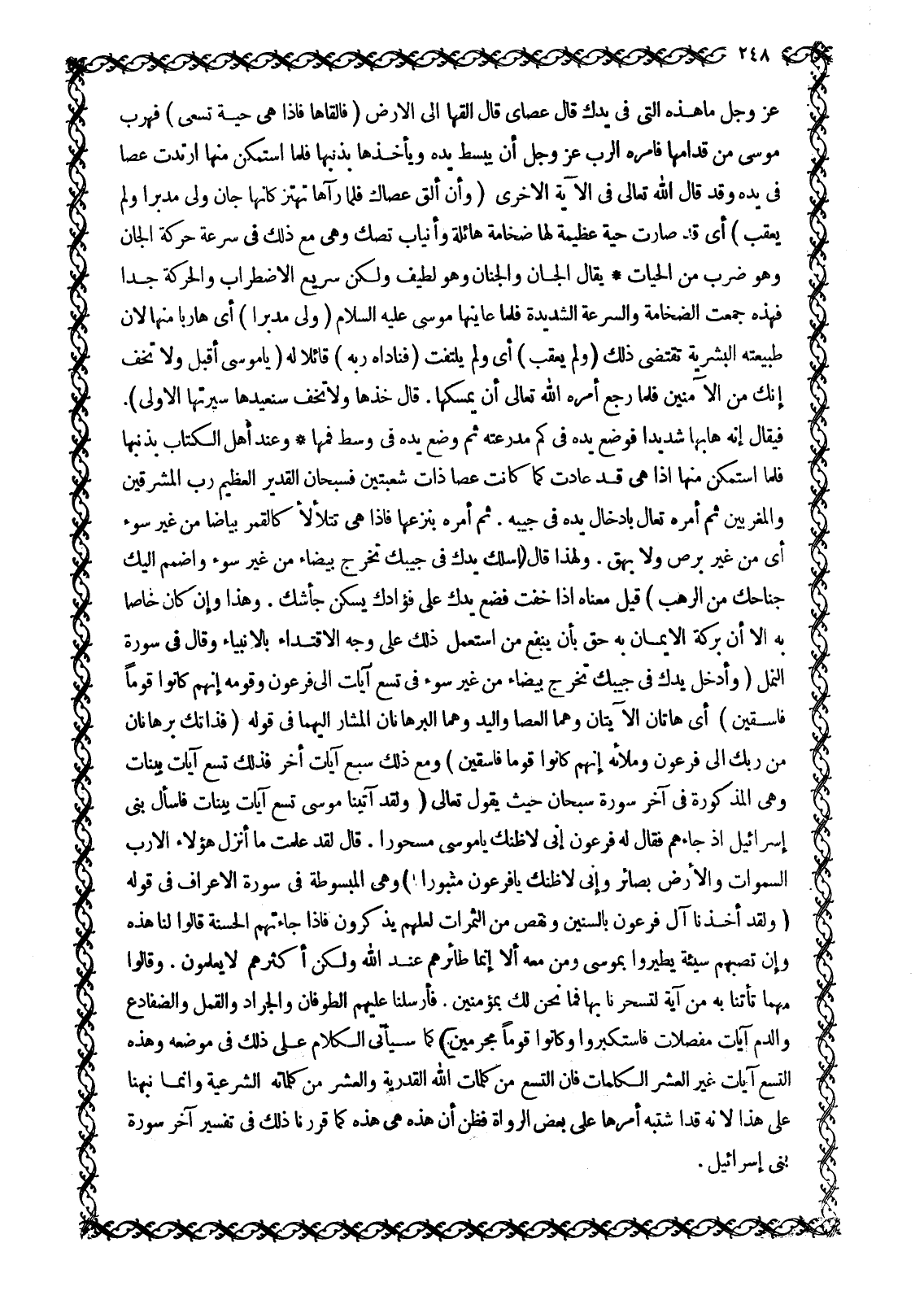 فَيُقَالُ إِنَّهُ هَابَهَا شَدِيدًا فَوَضَعَ يَدَهُ فِي كُمِّ مِدْرَعَتِهِ ثُمَّ وَضَعَ يَدَهُ فِي وَسَطِ فَمِهَا وَعِنْدَ أَهْلِ الْكِتَابِ بِذَنَبِهَا فَلَمَّا اسْتَمْكَنَ مِنْهَا إِذَا هِيَ قَدْ عَادَتْ كَمَا كَانَتْ عَصًا ذَاتَ شُعْبَتَيْنِ فَسُبْحَانُ الْقَدِيرِ الْعَظِيمِ رَبِّ المشرقين والمغربين ثم أمره تعال بِإِدْخَالِ يَدِهِ فِي جَيْبِهِ. ثُمَّ أَمَرَهُ بِنَزْعِهَا فَإِذَا هِيَ تَتَلَأْلَأُ كَالْقَمَرِ بَيَاضًا مِنْ غَيْرِ سُوءٍ أَيْ مِنْ غَيْرِ بَرَصٍ وَلَا بَهَقٍ. وَلِهَذَا قَالَ اسْلُكْ يَدَكَ فِي جَيْبِكَ تَخْرُجْ بَيْضاءَ مِنْ غَيْرِ سُوءٍ وَاضْمُمْ إِلَيْكَ جَناحَكَ مِنَ الرَّهْبِ) 28: 32 قِيلَ مَعْنَاهُ إِذَا خِفْتَ فَضَعْ يَدَكَ عَلَى فؤادك يسكن جأشك. وهذا وإن كان خاصما به الا أن بركة الايمان به حق بأن ينفع مَنِ اسْتَعْمَلَ ذَلِكَ عَلَى وَجْهِ الِاقْتِدَاءِ بِالْأَنْبِيَاءِ وَقَالَ فِي سُورَةِ النَّمْلِ (وَأَدْخِلْ يَدَكَ فِي جَيْبِكَ تَخْرُجْ بَيْضاءَ مِنْ غَيْرِ سُوءٍ فِي تِسْعِ آياتٍ إِلى فِرْعَوْنَ وَقَوْمِهِ إِنَّهُمْ كانُوا قَوْماً فاسِقِينَ) 27: 12 أَيْ هَاتَانِ الْآيَتَانِ وَهُمَا الْعَصَا وَالْيَدُ وَهُمَا الْبُرْهَانَانِ الْمُشَارُ إِلَيْهِمَا فِي قَوْلِهِ (فَذانِكَ بُرْهانانِ من رَبِّكَ إِلى فِرْعَوْنَ وَمَلَائِهِ إِنَّهُمْ كانُوا قَوْماً فاسِقِينَ) 28: 32 وَمَعَ ذَلِكَ سَبْعُ آيَاتٍ أُخَرُ فَذَلِكَ تِسْعُ آيَاتٍ بَيِّنَاتٍ وَهِيَ الْمَذْكُورَةُ فِي آخِرِ سُورَةِ سُبْحَانَ حَيْثُ يَقُولُ تَعَالَى وَلَقَدْ آتَيْنا مُوسى تِسْعَ آياتٍ بَيِّناتٍ فَسْئَلْ بَنِي إِسْرائِيلَ إِذْ جاءَهُمْ فَقالَ لَهُ فِرْعَوْنُ إِنِّي لَأَظُنُّكَ يَا مُوسى مَسْحُوراً. قَالَ لَقَدْ عَلِمْتَ مَا أَنْزَلَ هؤُلاءِ إِلَّا رَبُّ السَّماواتِ وَالْأَرْضِ بَصائِرَ وَإِنِّي لَأَظُنُّكَ يَا فِرْعَوْنُ مَثْبُوراً 17: 101- 102 وَهِيَ الْمَبْسُوطَةُ فِي سُورَةِ الْأَعْرَافِ فِي قَوْلِهِ وَلَقَدْ أَخَذْنا آلَ فِرْعَوْنَ بِالسِّنِينَ وَنَقْصٍ مِنَ الثَّمَراتِ لَعَلَّهُمْ يَذَّكَّرُونَ فَإِذا جاءَتْهُمُ الْحَسَنَةُ قالُوا لَنا هذِهِ وَإِنْ تُصِبْهُمْ سَيِّئَةٌ يَطَّيَّرُوا بِمُوسى وَمن مَعَهُ أَلا إِنَّما طائِرُهُمْ عِنْدَ اللَّهِ وَلكِنَّ أَكْثَرَهُمْ لَا يَعْلَمُونَ. وَقالُوا مَهْما تَأْتِنا بِهِ مِنْ آيَةٍ لِتَسْحَرَنا بِها فَما نَحْنُ لَكَ بِمُؤْمِنِينَ. فَأَرْسَلْنا عَلَيْهِمُ الطُّوفانَ وَالْجَرادَ وَالْقُمَّلَ وَالضَّفادِعَ وَالدَّمَ آياتٍ مُفَصَّلاتٍ فَاسْتَكْبَرُوا وَكانُوا قَوْماً مُجْرِمِينَ 7: 130- 133 كَمَا سَيَأْتِي الْكَلَامُ عَلَى ذَلِكَ فِي مَوْضِعِهِ وهذه التسع آيات غير العشر الكلمات فان التسع من كلمات اللَّهِ الْقَدَرِيَّةِ وَالْعَشْرَ مِنْ كَلِمَاتِهِ الشَّرْعِيَّةِ وَإِنَّمَا نَبَّهْنَا عَلَى هَذَا لِأَنَّهُ قَدِ اشْتَبَهَ أَمْرُهَا عَلَى بَعْضِ الرُّوَاةِ فَظَنَّ أَنَّ هَذِهِ هِيَ هَذِهِ كَمَا قَرَّرْنَا ذَلِكَ فِي تَفْسِيرِ آخِرِ سورة بنى إسرائيل.