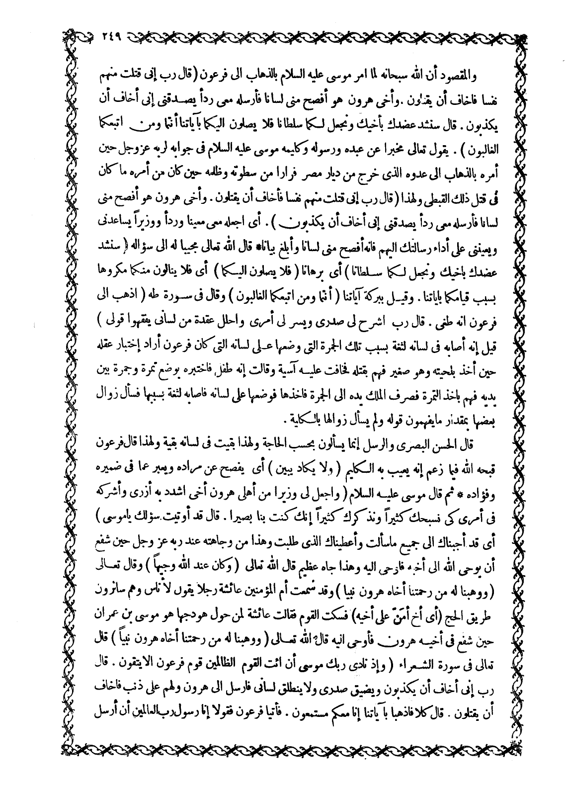 وَالْمَقْصُودُ أَنَّ اللَّهَ سُبْحَانَهُ لَمَّا أَمَرَ مُوسَى عَلَيْهِ السَّلَامُ بِالذَّهَابِ إِلَى فِرْعَوْنَ قَالَ رَبِّ إِنِّي قَتَلْتُ مِنْهُمْ نَفْساً فَأَخافُ أَنْ يَقْتُلُونِ. وَأَخِي هارُونُ هُوَ أَفْصَحُ مِنِّي لِساناً فَأَرْسِلْهُ مَعِي رِدْءاً يُصَدِّقُنِي إِنِّي أَخافُ أَنْ يُكَذِّبُونِ. قَالَ سَنَشُدُّ عَضُدَكَ بِأَخِيكَ وَنَجْعَلُ لَكُما سُلْطاناً فَلا يَصِلُونَ إِلَيْكُما بِآياتِنا أَنْتُما وَمن اتَّبَعَكُمَا الْغالِبُونَ 28: 33- 35. يَقُولُ تَعَالَى مُخْبِرًا عَنْ عَبْدِهِ وَرَسُولِهِ وَكَلِيمِهِ مُوسَى عَلَيْهِ السَّلَامُ فِي جَوَابِهِ لِرَبِّهِ عَزَّ وَجَلَّ حِينَ أَمَرَهُ بِالذَّهَابِ إِلَى عَدُوِّهِ الَّذِي خَرَجَ مِنْ دِيَارِ مِصْرَ فِرَارًا مِنْ سَطْوَتِهِ وَظُلْمِهِ حِينَ كَانَ مِنْ أَمْرِهِ مَا كَانَ فِي قَتْلِ ذَلِكَ الْقِبْطِيِّ وَلِهَذَا (قَالَ رَبِّ إِنِّي قَتَلْتُ مِنْهُمْ نَفْساً فَأَخافُ أَنْ يَقْتُلُونِ. وَأَخِي هارُونُ هُوَ أَفْصَحُ مِنِّي لِساناً فَأَرْسِلْهُ مَعِي رِدْءاً يُصَدِّقُنِي إِنِّي أَخافُ أَنْ يُكَذِّبُونِ) 28: 33- 34. أَيْ اجْعَلْهُ مَعِي مُعِينًا وَرِدْءًا وَوَزِيرًا يُسَاعِدُنِي وَيُعِينُنِي عَلَى أَدَاءِ رِسَالَتِكَ إِلَيْهِمْ فَإِنَّهُ أَفْصَحُ مِنِّي لِسَانًا وَأَبْلَغُ بَيَانًا قَالَ اللَّهُ تَعَالَى مُجِيبًا لَهُ إِلَى سُؤَالِهِ (سَنَشُدُّ عَضُدَكَ بِأَخِيكَ وَنَجْعَلُ لَكُما سُلْطاناً) 28: 35 أي برهانا (فَلا يَصِلُونَ إِلَيْكُما) 28: 35 أَيْ فَلَا يَنَالُونَ مِنْكُمَا مَكْرُوهًا بِسَبَبِ قِيَامِكُمَا بِآيَاتِنَا. وَقِيلَ بِبَرَكَةِ آيَاتِنَا (أَنْتُما وَمن اتَّبَعَكُمَا الْغالِبُونَ) 28: 35 وَقَالَ فِي سُورَةِ طه اذْهَبْ إِلى فِرْعَوْنَ إِنَّهُ طَغى. قَالَ رَبِّ اشْرَحْ لِي صَدْرِي وَيَسِّرْ لِي أَمْرِي وَاحْلُلْ عُقْدَةً مِنْ لِسانِي يَفْقَهُوا قَوْلِي 20: 24- 28 قِيلَ إِنَّهُ أَصَابَهُ فِي لِسَانِهِ لُثْغَةٌ بِسَبَبِ تِلْكَ الْجَمْرَةِ الَّتِي وَضَعَهَا عَلَى لِسَانِهِ الَّتِي كَانَ فِرْعَوْنُ أَرَادَ اخْتِبَارَ عَقْلِهِ حِينَ أَخَذَ بِلِحْيَتِهِ وَهُوَ صَغِيرٌ فَهَمَّ بِقَتْلِهِ فَخَافَتْ عَلَيْهِ آسِيَةُ وَقَالَتْ إِنَّهُ طِفْلٌ فَاخْتَبَرَهُ بِوَضْعِ تَمْرَةٍ وَجَمْرَةٍ بَيْنَ يَدَيْهِ فَهَمَّ بِأَخْذِ التَّمْرَةِ فَصَرَفَ الْمَلَكُ يَدَهُ إِلَى الْجَمْرَةِ فَأَخَذَهَا فَوَضَعَهَا عَلَى لِسَانِهِ فَأَصَابَهُ لُثْغَةٌ بِسَبَبِهَا فَسَأَلَ زَوَالَ بَعْضِهَا بِمِقْدَارِ مَا يَفْهَمُونَ قَوْلَهُ وَلَمْ يَسْأَلْ زَوَالَهَا بِالْكُلِّيَّةِ.