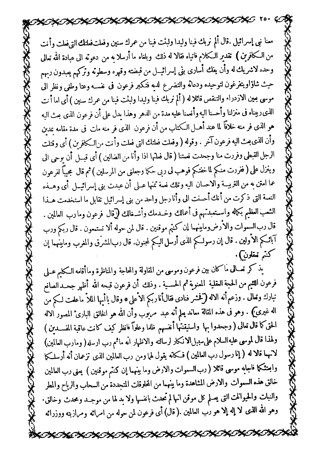 مَعَنا بَنِي إِسْرائِيلَ. قَالَ أَلَمْ نُرَبِّكَ فِينا وَلِيداً وَلَبِثْتَ فِينا مِنْ عُمُرِكَ سِنِينَ وَفَعَلْتَ فَعْلَتَكَ الَّتِي فَعَلْتَ وَأَنْتَ من الْكافِرِينَ 26: 10- 19 تقدير الكلام فأتياه فقالا له ذلك وبلغاه ما أرسلا بِهِ مِنْ دَعْوَتِهِ إِلَى عِبَادَةِ اللَّهِ تَعَالَى وَحْدَهُ لَا شَرِيكَ لَهُ وَأَنْ يَفُكَّ أُسَارَى بنى إسرائيل من قبضته وقهره وسطوته وتركهم يَعْبُدُونَ رَبَّهُمْ حَيْثُ شَاءُوا وَيَتَفَرَّغُونَ لِتَوْحِيدِهِ وَدُعَائِهِ وَالتَّضَرُّعِ لَدَيْهِ فَتَكَبَّرَ فِرْعَوْنُ فِي نَفْسِهِ وَعَتَا وطغى ونظر الى موسى بِعَيْنِ الِازْدِرَاءِ وَالتَّنَقُّصِ قَائِلًا لَهُ أَلَمْ نُرَبِّكَ فِينا وَلِيداً وَلَبِثْتَ فِينا مِنْ عُمُرِكَ سِنِينَ 26: 18 أَيْ أَمَا أَنْتَ الَّذِي رَبَّيْنَاهُ فِي مَنْزِلِنَا وَأَحْسَنَّا إِلَيْهِ وَأَنْعَمْنَا عَلَيْهِ مُدَّةً مِنَ الدَّهْرِ وَهَذَا يَدُلُّ عَلَى أَنَّ فِرْعَوْنَ الَّذِي بُعِثَ إِلَيْهِ هُوَ الَّذِي فَرَّ مِنْهُ خِلَافًا لِمَا عِنْدَ أَهْلِ الْكِتَابِ مِنْ أَنَّ فِرْعَوْنَ الَّذِي فَرَّ مِنْهُ مَاتَ فِي مُدَّةِ مُقَامِهِ بِمَدْيَنَ وَأَنَّ الَّذِي بُعِثَ إِلَيْهِ فِرْعَوْنُ آخَرُ. وَقَوْلُهُ وَفَعَلْتَ فَعْلَتَكَ الَّتِي فَعَلْتَ وَأَنْتَ مِنَ الْكافِرِينَ 26: 19 أَيْ وَقَتَلْتَ الرَّجُلَ الْقِبْطِيَّ وَفَرَرْتَ مِنَّا وَجَحَدْتَ نِعْمَتَنَا قَالَ فَعَلْتُها إِذاً وَأَنَا مِنَ الضَّالِّينَ 26: 20 أَيْ قَبْلَ أَنْ يُوحَى إِلَى وَيَنْزِلَ عَلَى فَفَرَرْتُ مِنْكُمْ لَمَّا خِفْتُكُمْ فَوَهَبَ لِي رَبِّي حُكْماً وَجَعَلَنِي من الْمُرْسَلِينَ 26: 21 ثُمَّ قَالَ مُجِيبًا لِفِرْعَوْنَ عَمَّا امْتَنَّ بِهِ مِنَ التَّرْبِيَةِ وَالْإِحْسَانِ إِلَيْهِ وَتِلْكَ نِعْمَةٌ تَمُنُّهَا على أن عبدت بنى إسرائيل أَيْ وَهَذِهِ النِّعْمَةُ الَّتِي ذَكَرْتَ مِنْ أَنَّكَ أَحْسَنْتَ إِلَيَّ وَأَنَا رَجُلٌ وَاحِدٌ مِنْ بَنِي إِسْرَائِيلَ تُقَابِلُ مَا اسْتَخْدَمْتَ هَذَا الشَّعْبَ الْعَظِيمَ بكماله واستعبدتهم في أعمالك وخدمك وَأَشْغَالِكَ قَالَ فِرْعَوْنُ وَما رَبُّ الْعالَمِينَ.