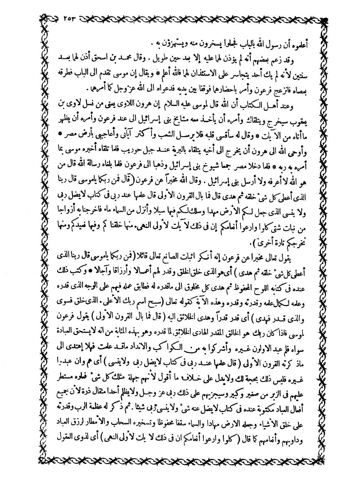 وَعِنْدَ أَهْلِ الْكِتَابِ أَنَّ اللَّهَ قَالَ لِمُوسَى عَلَيْهِ السَّلَامُ إِنَّ هَارُونَ اللَّاوِيَّ يَعْنِي مِنْ نَسْلِ لَاوِي بْنِ يَعْقُوبَ سَيَخْرُجُ وَيَتَلَقَّاكَ وَأَمَرَهُ أَنْ يَأْخُذَ مَعَهُ مَشَايِخَ بَنِي إِسْرَائِيلَ إِلَى عِنْدِ فِرْعَوْنَ وَأَمَرَهُ أَنْ يُظْهِرَ مَا آتَاهُ مِنَ الْآيَاتِ وَقَالَ لَهُ سَأُقْسِّي قَلْبَهُ فَلَا يُرْسِلُ الشَّعْبَ وَأَكْثَرُ آيَاتِي وَأَعَاجِيبِي بِأَرْضِ مِصْرَ وَأَوْحَى اللَّهُ إِلَى هَارُونَ أَنْ يَخْرُجَ إِلَى أَخِيهِ يَتَلَقَّاهُ بِالْبَرِّيَّةِ عِنْدَ جَبَلِ حُورِيبَ فَلَمَّا تَلْقَاهُ أَخْبَرَهُ مُوسَى بِمَا أَمَرَهُ بِهِ رَبُّهُ فَلَمَّا دَخَلَا مِصْرَ جَمْعَا شُيُوخَ بَنِي إِسْرَائِيلَ وَذَهَبَا إِلَى فِرْعَوْنَ فَلَمَّا بَلَّغَاهُ رِسَالَةَ اللَّهِ قَالَ مَنْ هُوَ اللَّهُ لَا أَعْرِفُهُ وَلَا أُرْسِلُ بَنِي إِسْرَائِيلَ. وَقَالَ اللَّهُ مُخْبِرًا عَنْ فِرْعَوْنَ قَالَ فَمَنْ رَبُّكُما يَا مُوسى قَالَ رَبُّنَا الَّذِي أَعْطى كُلَّ شَيْءٍ خَلْقَهُ ثُمَّ هَدى قَالَ فَما بالُ الْقُرُونِ الْأُولى قَالَ عِلْمُها عِنْدَ رَبِّي فِي كِتابٍ لَا يَضِلُّ رَبِّي وَلا يَنْسى الَّذِي جَعَلَ لَكُمُ الْأَرْضَ مَهْداً وَسَلَكَ لَكُمْ فِيها سُبُلًا وَأَنْزَلَ مِنَ السَّماءِ مَاءً فَأَخْرَجْنا بِهِ أَزْواجاً مِنْ نَباتٍ شَتَّى كُلُوا وَارْعَوْا أَنْعامَكُمْ إِنَّ فِي ذلِكَ لَآياتٍ لِأُولِي النُّهى. مِنْها خَلَقْناكُمْ وَفِيها نُعِيدُكُمْ وَمِنْها نُخْرِجُكُمْ تارَةً أُخْرى 20: 49- 55 يَقُولُ تَعَالَى مُخْبِرًا عَنْ فِرْعَوْنَ أَنَّهُ أَنْكَرَ إِثْبَاتَ الصَّانِعِ تَعَالَى قَائِلًا فَمَنْ رَبُّكُما يَا مُوسى قال رَبُّنَا الَّذِي أَعْطى كُلَّ شَيْءٍ خَلْقَهُ ثُمَّ هَدى 20: 49- 50 أَيْ هُوَ الَّذِي خَلَقَ الْخَلْقَ وَقَدَّرَ لَهُمْ أَعْمَالًا وَأَرْزَاقًا وَآجَالًا وَكَتَبَ ذَلِكَ عِنْدَهُ فِي كِتَابِهِ اللَّوْحِ الْمَحْفُوظِ ثُمَّ هَدَى كُلَّ مَخْلُوقٍ الى ما قدره له فطابق عمله فِيهِمْ عَلَى الْوَجْهِ الَّذِي قَدَّرَهُ وَعَلِمَهُ لِكَمَالِ عِلْمِهِ وَقُدْرَتِهِ وَقَدَرِهِ وَهَذِهِ الْآيَةُ كَقَوْلِهِ تَعَالَى سَبِّحِ اسْمَ رَبِّكَ الْأَعْلَى. الَّذِي خَلَقَ فَسَوَّى وَالَّذِي قَدَّرَ فَهَدى 87: 1- 3 أَيْ قَدَّرَ قَدَرًا وَهَدَى الْخَلَائِقَ إِلَيْهِ قَالَ فَما بالُ الْقُرُونِ الْأُولى 20: 51 يَقُولُ فِرْعَوْنُ لِمُوسَى فَإِذَا كَانَ رَبُّكَ هُوَ الْخَالِقُ الْمُقَدِّرُ الْهَادِي الْخَلَائِقَ لِمَا قَدَّرَهُ وَهُوَ بِهَذِهِ الْمَثَابَةِ مِنْ أَنَّهُ لَا يَسْتَحِقُّ الْعِبَادَةَ سِوَاهُ فَلِمَ عَبَدَ الْأَوَّلُونَ غَيْرَهُ وَأَشْرَكُوا بِهِ مِنَ الْكَوَاكِبِ وَالْأَنْدَادِ مَا قَدْ عَلِمْتَ فَهَلَّا اهْتَدَى إِلَى مَا ذَكَرْتَهُ الْقُرُونُ الْأُولَى قَالَ عِلْمُها عِنْدَ رَبِّي فِي كِتابٍ لَا يَضِلُّ رَبِّي وَلا يَنْسى 20: 52 أَيْ هُمْ وَإِنْ عَبَدُوا غَيْرَهُ فَلَيْسَ ذَلِكَ بِحُجَّةٍ لَكَ وَلَا يَدُلُّ عَلَى خِلَافِ مَا أقول لأنهم جهلة مثلك كل شَيْءٍ فَعَلُوهُ مُسْتَطَرٌ عَلَيْهِمْ فِي الزُّبُرِ مِنْ صَغِيرٍ وَكَبِيرٍ وَسَيَجْزِيهِمْ عَلَى ذَلِكَ رَبِّي عَزَّ وَجَلَّ وَلَا يَظْلِمُ أَحَدًا مِثْقَالَ ذَرَّةٍ لِأَنَّ جَمِيعَ أَفْعَالِ الْعِبَادِ مَكْتُوبَةٌ عِنْدَهُ فِي كِتَابٍ لَا يَضِلُّ عَنْهُ شَيْءٌ وَلَا يَنْسَى رَبِّي شَيْئًا. ثُمَّ ذَكَرَ لَهُ عَظَمَةَ الرَّبِّ وَقُدْرَتَهُ عَلَى خَلْقِ الْأَشْيَاءِ وَجَعْلَهُ الْأَرْضَ مِهَادًا وَالسَّمَاءَ سَقْفًا مَحْفُوظًا وَتَسْخِيرَهُ السَّحَابَ وَالْأَمْطَارَ لِرِزْقِ الْعِبَادِ وَدَوَابِّهِمْ وَأَنْعَامِهِمْ كَمَا قَالَ كُلُوا وَارْعَوْا أَنْعامَكُمْ إِنَّ في ذلِكَ لَآياتٍ لِأُو