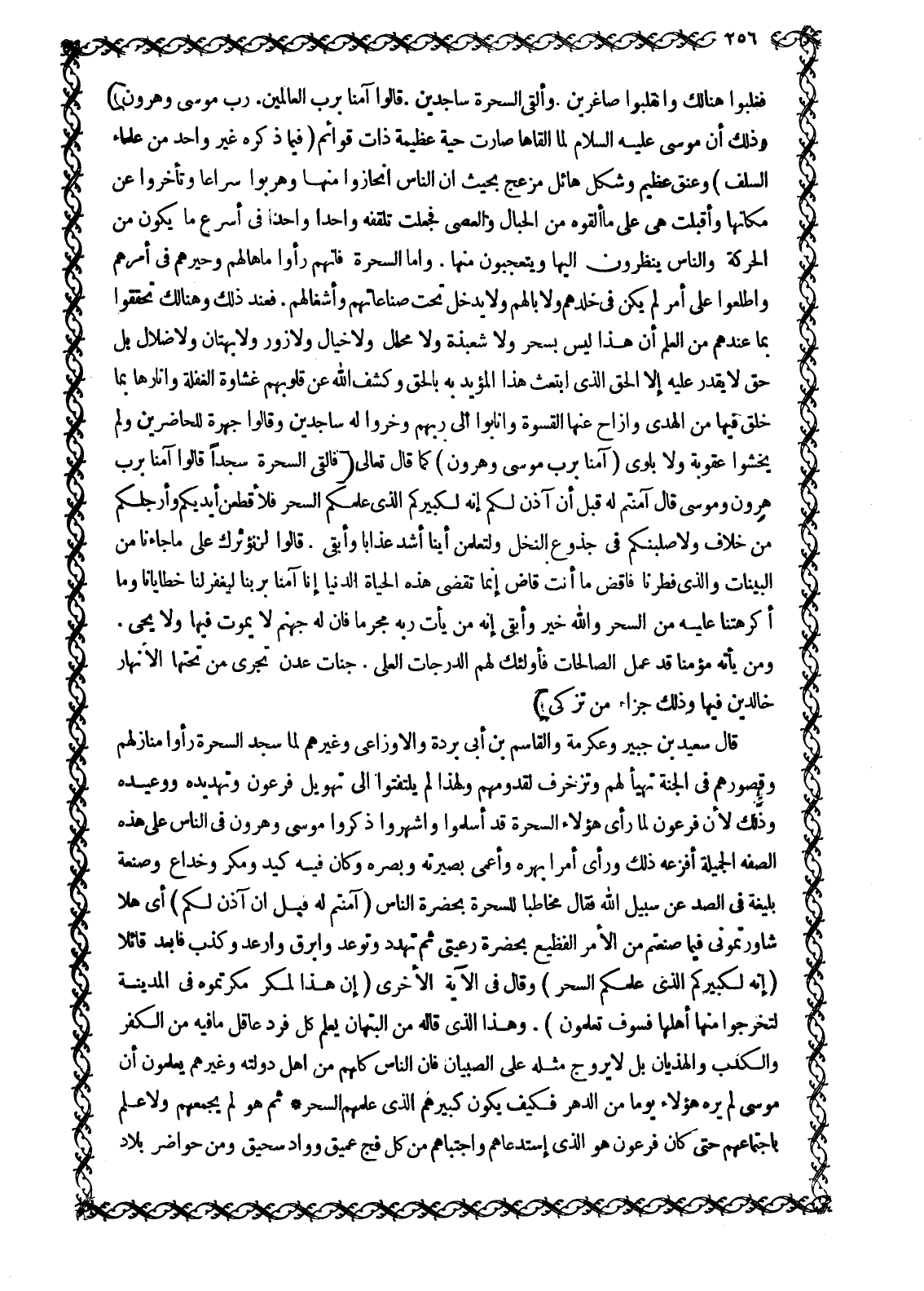 وَمن يَأْتِهِ مُؤْمِناً قَدْ عَمِلَ الصَّالِحاتِ فَأُولئِكَ لَهُمُ الدَّرَجاتُ الْعُلى. جَنَّاتُ عَدْنٍ تَجْرِي مِنْ تَحْتِهَا الْأَنْهارُ خالِدِينَ فِيها وَذلِكَ جَزاءُ من تَزَكَّى 20: 70- 76 قَالَ سَعِيدُ بْنُ جُبَيْرٍ وَعِكْرِمَةُ وَالْقَاسِمُ بْنُ أبى بردة وَالْأَوْزَاعِيُّ وَغَيْرُهُمْ لَمَّا سَجَدَ السَّحَرَةُ رَأَوْا مَنَازِلَهُمْ وَقُصُورَهُمْ فِي الْجَنَّةِ تُهَيَّأُ لَهُمْ وَتُزَخْرَفُ لِقُدُومِهِمْ وَلِهَذَا لَمْ يَلْتَفِتُوا إِلَى تَهْوِيلِ فِرْعَوْنَ وَتَهْدِيدِهِ وَوَعِيدِهِ وَذَلِكَ لِأَنَّ فِرْعَوْنَ لَمَّا رَأَى هَؤُلَاءِ السحرة قد أسلموا واشهروا ذكروا مُوسَى وَهَارُونَ فِي النَّاسِ عَلَى هَذِهِ الصِّفَةِ الْجَمِيلَةِ أَفْزَعَهُ ذَلِكَ وَرَأَى أَمْرًا بَهَرَهُ وَأَعْمَى بَصِيرَتَهُ وَبَصَرَهُ وَكَانَ فِيهِ كَيْدٌ وَمَكْرٌ وَخِدَاعٌ وَصَنْعَةٌ بَلِيغَةٌ فِي الصَّدِّ عَنْ سَبِيلِ اللَّهِ فَقَالَ مُخَاطِبًا لِلسَّحَرَةِ بِحَضْرَةِ النَّاسِ آمَنْتُمْ لَهُ قَبْلَ أَنْ آذَنَ لَكُمْ 20: 71 أَيْ هَلَّا شَاوَرْتُمُونِي فِيمَا صَنَعْتُمْ مِنَ الْأَمْرِ الْفَظِيعِ بِحَضْرَةِ رَعِيَّتِي ثُمَّ تَهَدَّدَ وَتَوَعَّدَ وَأَبْرَقَ وَأَرْعَدَ وَكَذَبَ فَأَبْعَدَ قَائِلًا إِنَّهُ لَكَبِيرُكُمُ الَّذِي عَلَّمَكُمُ السِّحْرَ 20: 71 وَقَالَ فِي الْآيَةِ الْأُخْرَى إِنَّ هَذَا لَمَكْرٌ مَكَرْتُمُوهُ فِي الْمَدِينَةِ لِتُخْرِجُوا مِنْها أَهْلَها فَسَوْفَ تَعْلَمُونَ 7: 123. وهذا الّذي قاله من البهتان يَعْلَمُ كُلُّ فَرْدٍ عَاقِلٍ مَا فِيهِ مِنَ الْكُفْرِ وَالْكَذِبِ وَالْهَذَيَانِ بَلْ لَا يَرُوجُ مَثَلَهُ عَلَى الصِّبْيَانِ فَإِنَّ النَّاسَ كُلَّهُمْ مِنْ أَهْلِ دَوْلَتِهِ وَغَيْرِهِمْ يَعْلَمُونَ أَنَّ مُوسَى لَمْ يَرَهُ هَؤُلَاءِ يَوْمًا مِنَ الدَّهْرِ فَكَيْفَ يَكُونُ كَبِيرَهُمُ الَّذِي عَلَّمَهُمُ السِّحْرَ ثُمَّ هُوَ لَمْ يَجْمَعْهُمْ وَلَا عِلْمَ بِاجْتِمَاعِهِمْ حَتَّى كَانَ فِرْعَوْنُ هُوَ الَّذِي اسْتَدْعَاهُمْ وَاجْتَبَاهُمْ مِنْ كُلِّ فَجٍّ عَمِيقٍ وواد سحيق ومن حواضر بلاد