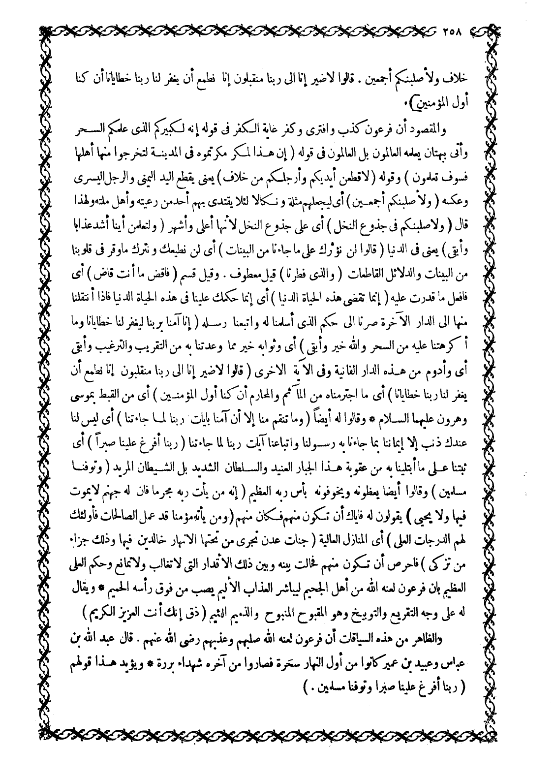 خِلافٍ وَلَأُصَلِّبَنَّكُمْ أَجْمَعِينَ. قالُوا لَا ضَيْرَ إِنَّا إِلى رَبِّنا مُنْقَلِبُونَ إِنَّا نَطْمَعُ أَنْ يَغْفِرَ لَنا رَبُّنا خَطايانا أَنْ كُنَّا أَوَّلَ الْمُؤْمِنِينَ 26: 29- 51 وَالْمَقْصُودُ أَنَّ فِرْعَوْنَ كَذَّبَ وَافْتَرَى وَكَفَرَ غَايَةَ الْكُفْرِ فِي قَوْلِهِ إِنَّهُ لَكَبِيرُكُمُ الَّذِي عَلَّمَكُمُ السحر وَأَتَى بِبُهْتَانٍ يَعْلَمُهُ الْعَالِمُونَ بَلِ الْعَالَمُونَ فِي قَوْلِهِ إِنَّ هَذَا لَمَكْرٌ مَكَرْتُمُوهُ فِي الْمَدِينَةِ لِتُخْرِجُوا مِنْها أَهْلَها فَسَوْفَ تَعْلَمُونَ 7: 123 وقوله لَأُقَطِّعَنَّ أَيْدِيَكُمْ وَأَرْجُلَكُمْ من خِلافٍ 26: 49 يَعْنِي يَقْطَعُ الْيَدَ الْيُمْنَى وَالرِّجْلَ الْيُسْرَى وَعَكْسَهُ وَلَأُصَلِّبَنَّكُمْ أَجْمَعِينَ 26: 49 أَيْ لَيَجْعَلُهُمْ مَثُلَةً وَنَكَالًا لِئَلَّا يَقْتَدِيَ بِهِمْ أَحَدٌ مِنْ رَعِيَّتِهِ وَأَهْلِ مِلَّتِهِ وَلِهَذَا قَالَ وَلَأُصَلِّبَنَّكُمْ في جُذُوعِ النَّخْلِ 20: 71 أَيْ عَلَى جُذُوعِ النَّخْلِ لِأَنَّهَا أَعْلَى وَأَشْهَرُ وَلَتَعْلَمُنَّ أَيُّنا أَشَدُّ عَذاباً وَأَبْقى 20: 71 يَعْنِي فِي الدُّنْيَا قالُوا لَنْ نُؤْثِرَكَ عَلى ما جاءَنا من الْبَيِّناتِ 20: 72 أَيْ لَنْ نُطِيعَكَ وَنَتْرُكَ مَا وَقَرَ فِي قُلُوبِنَا مِنَ الْبَيِّنَاتِ وَالدَّلَائِلِ الْقَاطِعَاتِ وَالَّذِي فَطَرَنا 20: 72 قِيلَ مَعْطُوفٌ. وَقِيلَ قَسَمٌ فَاقْضِ مَا أَنْتَ قاضٍ 20: 72 أَيْ فَافْعَلْ مَا قَدَرْتَ عَلَيْهِ إِنَّما تَقْضِي هذِهِ الْحَياةَ الدُّنْيا 20: 72 أَيْ إِنَّمَا حُكْمُكَ عَلَيْنَا فِي هَذِهِ الْحَيَاةِ الدُّنْيَا فَإِذَا انْتَقَلْنَا مِنْهَا إِلَى الدَّارِ الْآخِرَةِ صِرْنَا إِلَى حُكْمِ الَّذِي أَسْلَمْنَا لَهُ وَاتَّبَعْنَا رُسُلَهُ إِنَّا آمَنَّا بِرَبِّنا لِيَغْفِرَ لَنا خَطايانا وَما أَكْرَهْتَنا عَلَيْهِ مِنَ السِّحْرِ وَالله خَيْرٌ وَأَبْقى 20: 73 أَيْ وَثَوَابُهُ خَيْرٌ مِمَّا وَعَدَتْنَا بِهِ مِنَ التَّقْرِيبِ وَالتَّرْغِيبِ وَأَبْقَى أَيْ وَأَدْوَمُ مِنْ هَذِهِ الدَّارِ الْفَانِيَةِ وَفِي الْآيَةِ الْأُخْرَى قالُوا لَا ضَيْرَ إِنَّا إِلى رَبِّنا مُنْقَلِبُونَ إِنَّا نَطْمَعُ أَنْ يَغْفِرَ لَنا رَبُّنا خَطايانا 26: 50- 51 أَيْ مَا اجْتَرَمْنَاهُ مِنَ الْمَآثِمِ وَالْمَحَارِمِ أَنْ كُنَّا أَوَّلَ الْمُؤْمِنِينَ أَيْ مِنَ الْقِبْطِ بِمُوسَى وَهَارُونَ عَلَيْهِمَا السَّلَامُ وَقَالُوا لَهُ أَيْضًا وَما تَنْقِمُ مِنَّا إِلَّا أَنْ آمَنَّا بِآياتِ رَبِّنا لَمَّا جاءَتْنا 7: 126 أَيْ لَيْسَ لَنَا عِنْدَكَ ذَنْبٌ إِلَّا إِيمَانُنَا بِمَا جَاءَنَا بِهِ رَسُولُنَا وَاتِّبَاعُنَا آيَاتِ رَبِّنَا لما جاءتنا رَبَّنا أَفْرِغْ عَلَيْنا صَبْراً 7: 126 أَيْ ثَبِّتْنَا عَلَى مَا ابْتُلِينَا بِهِ مِنْ عُقُوبَةِ هَذَا الْجَبَّارِ الْعَنِيدِ وَالسُّلْطَانِ الشَّدِيدِ بَلِ الشَّيْطَانِ الْمَرِيدِ وَتَوَفَّنا مُسْلِمِينَ 7: 126 وَقَالُوا أَيْضًا يَعِظُونَهُ وَيُخَوِّفُونَهُ بِأْسَ رَبِّهِ الْعَظِيمِ إِنَّهُ مَنْ يَأْتِ رَبَّهُ مُجْرِماً فَإِنَّ لَهُ جَهَنَّمَ لَا يَمُوتُ فِيها وَلا يَحْيى 20: 74 يَقُولُونَ لَهُ فَإِيَّاكَ أَنْ تَكُونَ مِنْهُمْ فَكَانَ مِنْهُمْ وَمن يَأْتِهِ مُؤْمِناً قَدْ عَمِلَ الصَّالِحاتِ فَأُولئِكَ لَهُمُ الدَّرَجاتُ الْعُلى 20: 75 أَيِ الْمَنَازِلُ الْعَالِيَةُ جَنَّاتُ عَدْنٍ تَجْرِي مِنْ تَحْتِهَا الْأَنْهارُ خالِدِينَ فِيها وَذلِكَ جَزاءُ مَنْ تَزَكَّى 20: 76 فَاحْرِصْ أَنْ تَكُونَ مِنْهُمْ فَحَالَتْ بَيْنَهُ وَبَيْنَ ذَلِكَ الْأَقْدَارُ الَّتِي لَا تُغَالَبُ وَلَا تُمَانَعُ وَحُكْمُ الْعَلِيِّ الْعَظِيمِ بِأَنَّ فِرْعَوْنَ لَعَنَهُ اللَّهُ مِنْ أَهْلِ الْجَحِيمِ لِيُبَاشِرَ الْعَذَابَ الْأَلِيمَ يَصُب