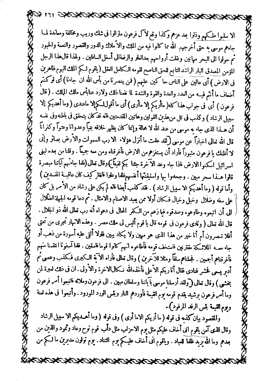 إِلَّا سُلِبُوا مُلْكَهُمْ وَذَلُّوا بَعْدَ عِزِّهِمْ وَكَذَا وَقْعَ لِآلِ فِرْعَوْنَ مَا زَالُوا فِي شَكٍّ وَرَيْبٍ وَمُخَالَفَةٍ وَمُعَانَدَةٍ لِمَا جَاءَهُمْ مُوسَى بِهِ حَتَّى أَخْرَجَهُمُ اللَّهُ مِمَّا كَانُوا فِيهِ مِنَ الْمُلْكِ وَالْأَمْلَاكِ وَالدُّورِ وَالْقُصُورِ وَالنِّعْمَةِ وَالْحُبُورِ ثُمَّ حُوِّلُوا إِلَى الْبَحْرِ مُهَانِينَ وَنُقِلَتْ أَرْوَاحُهُمْ بَعْدَ الْعُلُوِّ وَالرِّفْعَةِ إِلَى أَسْفَلِ السَّافِلِينَ. وَلِهَذَا قَالَ هذا الرجل المؤمن المصدق الْبَارُّ الرَّاشِدُ التَّابِعُ لِلْحَقِّ النَّاصِحُ لِقَوْمِهِ الْكَامِلُ العقل يَا قَوْمِ لَكُمُ الْمُلْكُ الْيَوْمَ ظاهِرِينَ فِي الْأَرْضِ 40: 29 أَيْ عَالِينَ عَلَى النَّاسِ حَاكِمِينَ عَلَيْهِمْ فَمَنْ يَنْصُرُنا من بَأْسِ الله إِنْ جاءَنا 40: 29 أَيْ لَوْ كُنْتُمْ أَضْعَافَ مَا أَنْتُمْ فِيهِ مِنَ الْعَدَدِ وَالْعُدَّةِ وَالْقُوَّةِ وَالشِّدَّةِ لَمَا نَفَعَنَا ذَلِكَ وَلَا رَدَّ عَنَّا بَأْسَ مَالِكِ الْمَمَالِكِ. قال فِرْعَوْنُ 40: 29 أَيْ فِي جَوَابِ هَذَا كُلِّهِ مَا أُرِيكُمْ إِلَّا ما أَرى 40: 29 أَيْ مَا أَقُولُ لَكُمْ إِلَّا مَا عِنْدِي وَما أَهْدِيكُمْ إِلَّا سَبِيلَ الرَّشادِ 40: 29 وَكَذَبَ فِي كُلٍّ مِنْ هَذَيْنِ الْقَوْلَيْنِ وَهَاتَيْنِ المقدمتين فإنه قد كان يتحقق فِي بَاطِنِهِ وَفِي نَفْسِهِ أَنَّ هَذَا الَّذِي جاء به موسى مِنْ عِنْدِ اللَّهِ لَا مَحَالَةَ وَإِنَّمَا كَانَ يُظْهِرُ خِلَافَهُ بَغْيًا وَعُدْوَانًا وَعُتُوًّا وَكُفْرَانًا قَالَ الله تعالى اخبارا عن مُوسَى لَقَدْ عَلِمْتَ مَا أَنْزَلَ هؤُلاءِ إِلَّا رَبُّ السَّماواتِ وَالْأَرْضِ بَصائِرَ وَإِنِّي لَأَظُنُّكَ يَا فِرْعَوْنُ مَثْبُوراً فَأَرادَ أَنْ يَسْتَفِزَّهُمْ من الْأَرْضِ فَأَغْرَقْناهُ وَمن مَعَهُ جَمِيعاً. وَقُلْنا مِنْ بَعْدِهِ لِبَنِي إِسْرائِيلَ اسْكُنُوا الْأَرْضَ فَإِذا جاءَ وَعْدُ الْآخِرَةِ جِئْنا بِكُمْ لَفِيفاً 17: 102- 104 وَقَالَ تَعَالَى فَلَمَّا جاءَتْهُمْ آياتُنا مُبْصِرَةً قالُوا هَذَا سِحْرٌ مُبِينٌ. وَجَحَدُوا بِها وَاسْتَيْقَنَتْها أَنْفُسُهُمْ ظُلْماً وَعُلُوًّا فَانْظُرْ كَيْفَ كانَ عاقِبَةُ الْمُفْسِدِينَ 27: 13- 14 وَأَمَّا قَوْلُهُ وَما أَهْدِيكُمْ إِلَّا سَبِيلَ الرَّشادِ 40: 29. فَقَدْ كَذَبَ أَيْضًا فَإِنَّهُ لَمْ يَكُنْ عَلَى رَشَادٍ مِنَ الْأَمْرِ بَلْ كَانَ عَلَى سَفَهٍ وضلال وخبل وخيال فكان أَوَّلًا مِمَّنْ يَعْبُدُ الْأَصْنَامَ وَالْأَمْثَالَ. ثُمَّ دَعَا قَوْمَهُ الْجَهَلَةَ الضُّلَّالَ إِلَى أَنِ اتَّبَعُوهُ وَطَاوَعُوهُ وَصَدَّقُوهُ فِيمَا زَعَمَ مِنَ الْكُفْرِ الْمُحَالِ فِي دَعْوَاهُ أَنَّهُ رَبٌّ تَعَالَى اللَّهُ ذُو الْجَلَالِ.