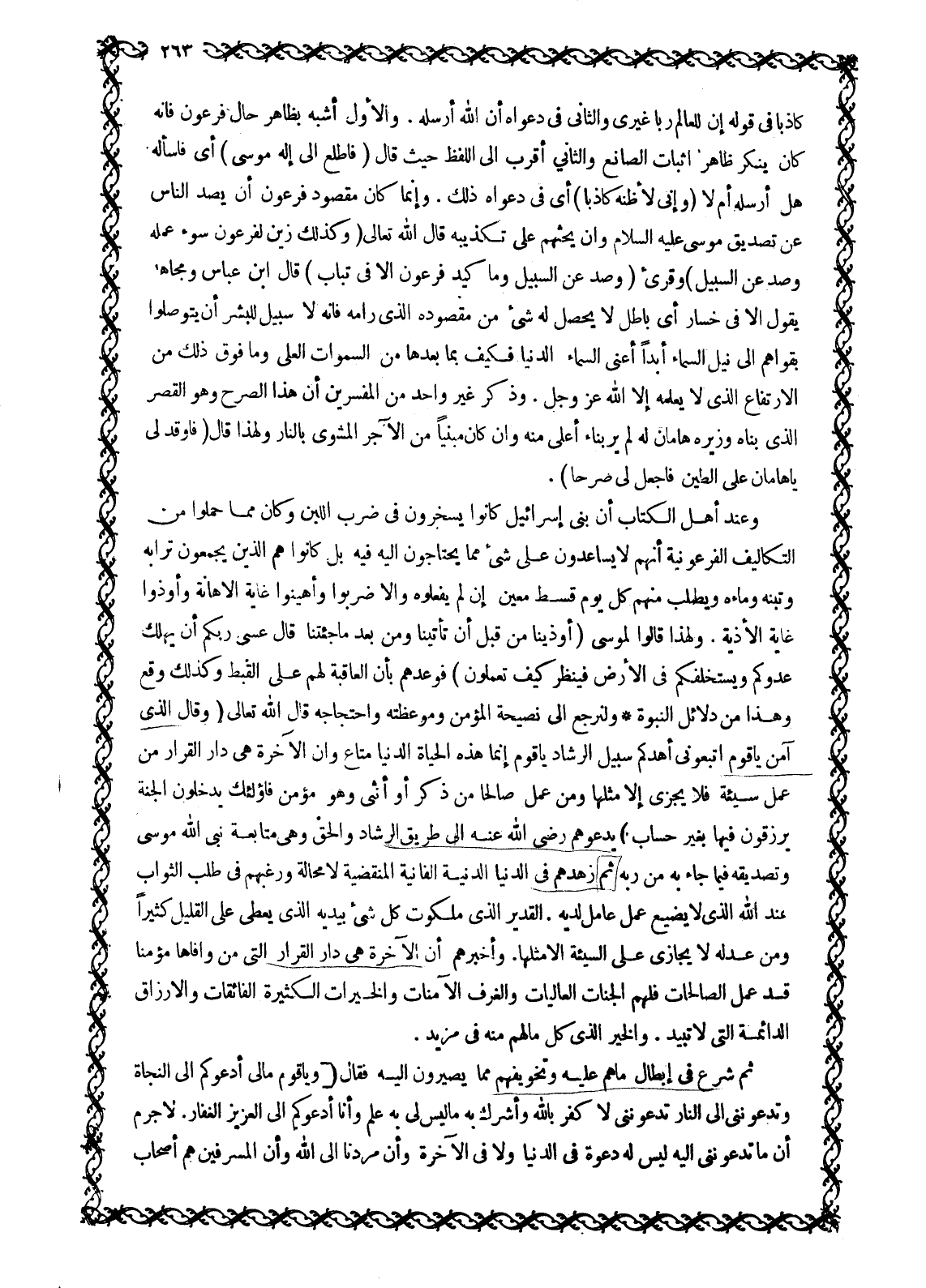 وَعِنْدَ أَهْلِ الْكِتَابِ أَنَّ بَنِي إِسْرَائِيلَ كَانُوا يُسَخَّرُونَ فِي ضَرْبِ اللَّبِنِ وَكَانَ مِمَّا حَمَلُوا مِنَ التَّكَالِيفِ الْفِرْعَوْنِيَّةِ أَنَّهُمْ لَا يُسَاعَدُونَ عَلَى شَيْءٍ مِمَّا يَحْتَاجُونَ إِلَيْهِ فِيهِ بَلْ كَانُوا هم الذين يجمعون ترابه وتبنه وماءه ويصلب مِنْهُمْ كُلَّ يَوْمٍ قِسْطٌ مُعَيَّنٌ إِنْ لَمْ يَفْعَلُوهُ وَإِلَّا ضُرِبُوا وَأُهِينُوا غَايَةَ الْإِهَانَةِ وَأُوذُوا غَايَةَ الْأَذِيَّةِ. وَلِهَذَا قَالُوا لِمُوسَى أُوذِينا مِنْ قَبْلِ أَنْ تَأْتِيَنا وَمن بَعْدِ مَا جِئْتَنا قَالَ عَسى رَبُّكُمْ أَنْ يُهْلِكَ عَدُوَّكُمْ وَيَسْتَخْلِفَكُمْ فِي الْأَرْضِ فَيَنْظُرَ كَيْفَ تَعْمَلُونَ 7: 129 فَوَعَدَهُمْ بِأَنَّ الْعَاقِبَةَ لَهُمْ عَلَى الْقِبْطِ وَكَذَلِكَ وَقَعَ وَهَذَا مِنْ دَلَائِلِ النُّبُوَّةِ وَلْنَرْجِعْ إِلَى نَصِيحَةِ الْمُؤْمِنِ وَمَوْعِظَتِهِ وَاحْتِجَاجِهِ قَالَ اللَّهُ تَعَالَى وَقال الَّذِي آمَنَ يَا قَوْمِ اتَّبِعُونِ أَهْدِكُمْ سَبِيلَ الرَّشادِ يَا قَوْمِ إِنَّما هذِهِ الْحَياةُ الدُّنْيا مَتاعٌ وَإِنَّ الْآخِرَةَ هِيَ دارُ الْقَرارِ مَنْ عَمِلَ سَيِّئَةً فَلا يُجْزى إِلَّا مِثْلَها وَمن عَمِلَ صالِحاً مِنْ ذَكَرٍ أَوْ أُنْثى وَهُوَ مُؤْمِنٌ فَأُولئِكَ يَدْخُلُونَ الْجَنَّةَ يُرْزَقُونَ فِيها بِغَيْرِ حِسابٍ 40: 38- 40 يَدْعُوهُمْ رَضِيَ اللَّهُ عَنْهُ إِلَى طَرِيقِ الرَّشَادِ وَالْحَقِّ وَهِيَ مُتَابَعَةُ نَبِيِّ اللَّهِ مُوسَى وَتَصْدِيقُهُ فِيمَا جَاءَ بِهِ مِنْ رَبِّهِ ثُمَّ زَهَّدَهُمْ فِي الدُّنْيَا الدَّنِيَّةِ الْفَانِيَةِ الْمُنْقَضِيَةِ لَا مَحَالَةَ وَرَغَّبَهُمْ فِي طَلَبِ الثَّوَابِ عِنْدَ اللَّهِ الَّذِي لَا يُضَيِّعُ عَمَلَ عَامِلٍ لَدَيْهِ. الْقَدِيرِ الَّذِي مَلَكُوتُ كُلِّ شَيْءٍ بِيَدَيْهِ الَّذِي يُعْطِي عَلَى الْقَلِيلِ كَثِيرًا وَمِنْ عَدْلِهِ لَا يُجَازَى عَلَى السَّيِّئَةِ إِلَّا مِثْلَهَا. وَأَخْبَرَهُمْ أَنَّ الْآخِرَةَ هِيَ دَارُ الْقَرَارِ الَّتِي مِنْ وَافَاهَا مُؤْمِنًا قَدْ عَمِلَ الصَّالِحَاتِ فَلَهُمُ الْجَنَّاتُ الْعَالِيَاتُ وَالْغُرَفُ الْآمِنَاتُ وَالْخَيْرَاتُ الْكَثِيرَةِ الْفَائِقَاتُ وَالْأَرْزَاقُ الدَّائِمَةُ الَّتِي لَا تَبِيدُ. وَالْخَيْرُ الَّذِي كُلُّ مَا لَهُمْ مِنْهُ فِي مَزِيدٍ.