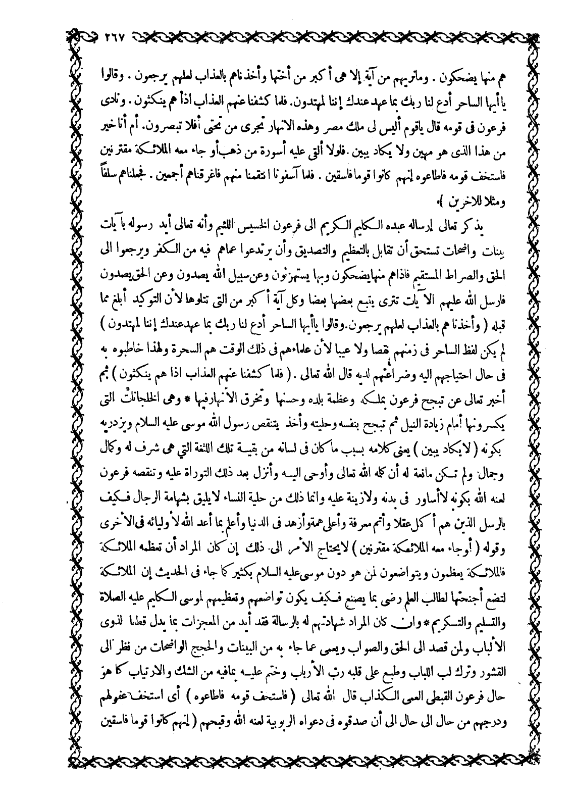 هُمْ مِنْها يَضْحَكُونَ. وَما نُرِيهِمْ مِنْ آيَةٍ إِلَّا هِيَ أَكْبَرُ مِنْ أُخْتِها وَأَخَذْناهُمْ بِالْعَذابِ لَعَلَّهُمْ يَرْجِعُونَ. وَقالُوا يَا أَيُّهَا السَّاحِرُ ادْعُ لَنا رَبَّكَ بِما عَهِدَ عِنْدَكَ إِنَّنا لَمُهْتَدُونَ. فَلَمَّا كَشَفْنا عَنْهُمُ الْعَذابَ إِذا هُمْ يَنْكُثُونَ. وَنادى فِرْعَوْنُ فِي قَوْمِهِ قَالَ يَا قَوْمِ أَلَيْسَ لِي مُلْكُ مِصْرَ وَهذِهِ الْأَنْهارُ تَجْرِي مِنْ تَحْتِي أَفَلا تُبْصِرُونَ. أَمْ أَنَا خَيْرٌ مِنْ هذَا الَّذِي هُوَ مَهِينٌ وَلا يَكادُ يُبِينُ. فَلَوْلا أُلْقِيَ عَلَيْهِ أَسْوِرَةٌ مِنْ ذَهَبٍ أَوْ جاءَ مَعَهُ الْمَلائِكَةُ مُقْتَرِنِينَ فَاسْتَخَفَّ قَوْمَهُ فَأَطاعُوهُ إِنَّهُمْ كانُوا قَوْماً فاسِقِينَ. فَلَمَّا آسَفُونا انْتَقَمْنا مِنْهُمْ فَأَغْرَقْناهُمْ أَجْمَعِينَ. فَجَعَلْناهُمْ سَلَفاً وَمَثَلًا لِلْآخِرِينَ 43: 46- 56 يَذْكُرُ تَعَالَى إِرْسَالَهُ عَبْدَهُ الْكَلِيمَ الْكَرِيمَ إِلَى فِرْعَوْنَ الْخَسِيسِ اللَّئِيمِ وَأَنَّهُ تَعَالَى أَيَّدَ رَسُولَهُ بآيات بينات واضحات تستحق أن تقابل بالتعظيم والتصديق وأن يرتدعوا عماهم فِيهِ مِنَ الْكُفْرِ وَيَرْجِعُوا إِلَى الْحَقِّ وَالصِّرَاطِ المستقيم فإذا هم منها يضحكون وبها يستهزءون وعن سبيل الله يصدون وعن الحق يصدون فَأَرْسَلَ اللَّهُ عَلَيْهِمُ الْآيَاتِ تَتْرَى يَتْبَعُ بَعْضُهَا بعضا وكل آية أكبر من التي تتلوها لأن التوكيد أَبْلَغُ مِمَّا قَبْلَهُ وَأَخَذْناهُمْ بِالْعَذابِ لَعَلَّهُمْ يَرْجِعُونَ. وَقالُوا يَا أَيُّهَا السَّاحِرُ ادْعُ لَنا رَبَّكَ بِما عَهِدَ عِنْدَكَ إِنَّنا لَمُهْتَدُونَ 43: 48- 49 لم يكن لفظ الساحر في زمنهم نَقْصًا وَلَا عَيْبًا لِأَنَّ عُلَمَاءَهُمْ فِي ذَلِكَ الْوَقْتِ هُمُ السَّحَرَةُ وَلِهَذَا خَاطَبُوهُ بِهِ فِي حَالِ احْتِيَاجِهِمْ إِلَيْهِ وَضَرَاعَتِهِمْ لَدَيْهِ قَالَ اللَّهُ تَعَالَى. فَلَمَّا كَشَفْنا عَنْهُمُ الْعَذابَ إِذا هُمْ يَنْكُثُونَ 43: 50 ثُمَّ أَخْبَرَ تَعَالَى عَنْ تَبَجُّحِ فِرْعَوْنَ بِمُلْكِهِ وَعَظْمَةِ بَلَدِهِ وَحُسْنِهَا وَتَخَرُّقِ الْأَنْهَارِ فِيهَا وَهِيَ الخلجانات الَّتِي يَكْسِرُونَهَا أَمَامَ زِيَادَةِ النِّيلِ ثُمَّ تَبَجَّحَ بِنَفْسِهِ وَحِلْيَتِهِ وَأَخَذَ يَتَنَقَّصُ رَسُولَ اللَّهِ مُوسَى عليه السلام ويزدريه بكونه لا يَكادُ يُبِينُ 43: 52 يَعْنِي كَلَامَهُ بِسَبَبِ مَا كَانَ فِي لِسَانِهِ مِنْ بَقِيَّةِ تِلْكَ اللُّثْغَةِ الَّتِي هِيَ شَرَفٌ لَهُ وَكَمَالٌ وَجَمَالٌ وَلَمْ تَكُنْ مَانِعَةً لَهُ أَنْ كَلَّمَهُ اللَّهُ تَعَالَى وَأَوْحَى إِلَيْهِ وَأَنْزَلَ بَعْدَ ذَلِكَ التَّوْرَاةَ عَلَيْهِ وَتَنَقَّصَهُ فِرْعَوْنُ لَعَنَهُ الله بكونه لا أساور في بدنه وَلَا زِينَةَ عَلَيْهِ وَإِنَّمَا ذَلِكَ مِنْ حِلْيَةِ النِّسَاءِ لَا يَلِيقُ بِشَهَامَةِ الرِّجَالِ فَكَيْفَ بِالرُّسُلِ الَّذِينَ هُمْ أَكْمَلُ عَقْلًا وَأَتَمُّ مَعْرِفَةٌ وَأَعْلَى هِمَّةً وَأَزْهَدُ فِي الدُّنْيَا وَأَعْلَمُ بِمَا أَعَدَّ اللَّهُ لِأَوْلِيَائِهِ فِي الْأُخْرَى وَقَوْلُهُ أَوْ جاءَ مَعَهُ الْمَلائِكَةُ مُقْتَرِنِينَ 43: 53 لَا يَحْتَاجُ الْأَمْرُ إِلَى ذَلِكَ إِنْ كَانَ الْمُرَادُ أَنْ تُعَظِّمَهُ الْمَلَائِكَةُ فَالْمَلَائِكَةُ يُعَظِّمُونَ وَيَتَوَاضَعُونَ لِمَنْ هُوَ دُونَ مُوسَى عَلَيْهِ السَّلَامُ بِكَثِيرٍ كَمَا جَاءَ فِي الْحَدِيثِ إِنَّ الْمَلَائِكَةَ لَتَضَعُ أَجْنِحَتَهَا لِطَالِبِ الْعِلْمِ رِضًى بِمَا يَصْنَعُ فَكَيْفَ يَكُونُ تَوَاضُعُهُمْ وَتَعْظِيمُهُمْ لِمُوسَى الْكَلِيمِ عَلَيْهِ الصَّلَاةُ وَالتَّسْلِيمُ وَالتَّكْرِيمُ وَإِنْ كَانَ الْمُرَادُ شَهَادَتَهُمْ لَهُ بِالرِّسَالَةِ فَقَدْ أُيِّدَ مِنَ الْمُ