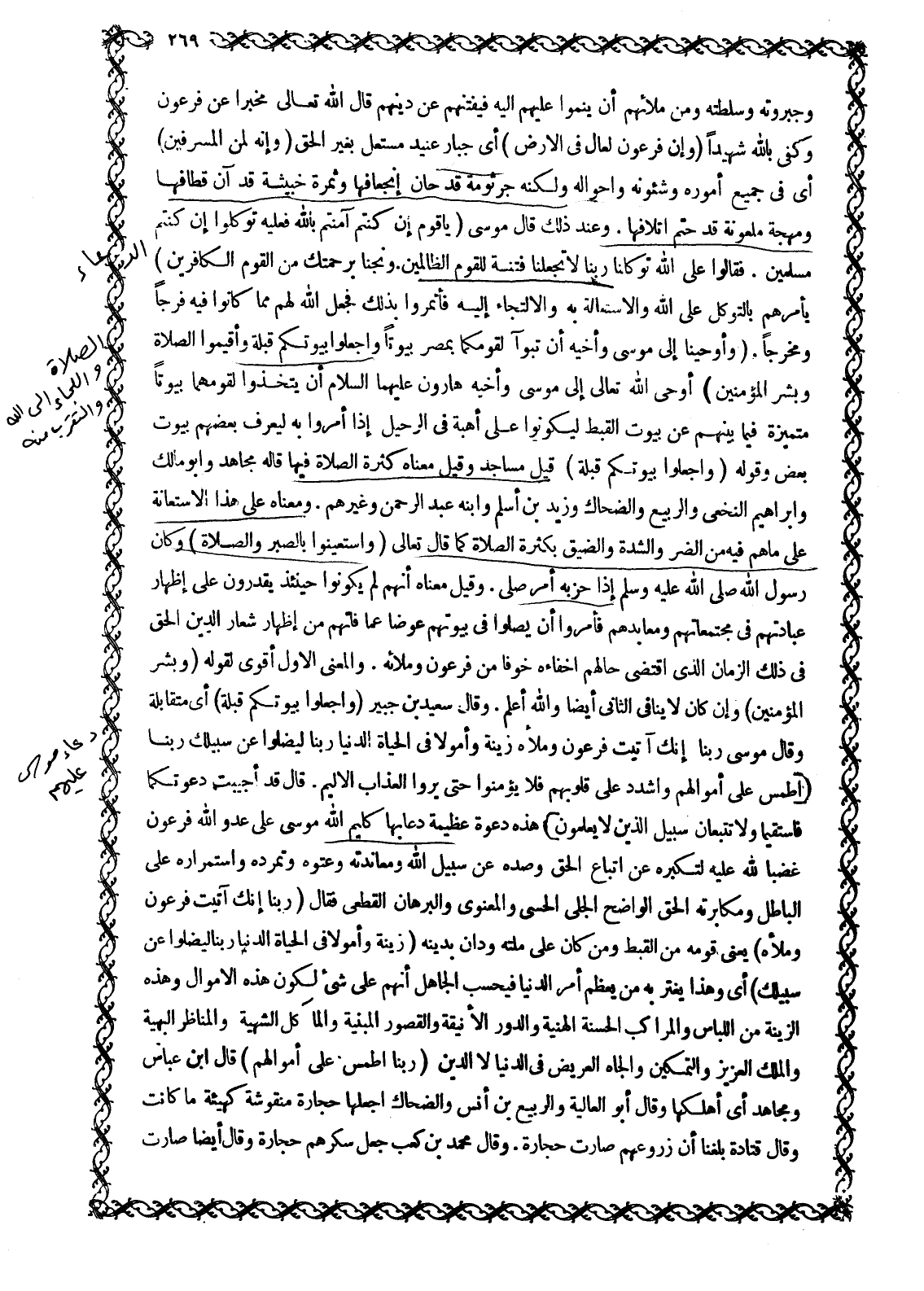 وجبروته وسلطته ومن ملإهم أَنْ يَنِمُّوا عَلَيْهِمْ إِلَيْهِ فَيَفْتِنَهُمْ عَنْ دِينِهِمْ قَالَ اللَّهُ تَعَالَى مُخْبِرًا عَنْ فِرْعَوْنَ وَكَفَى باللَّه شَهِيدًا وَإِنَّ فِرْعَوْنَ لَعالٍ فِي الْأَرْضِ 10: 83 أَيْ جَبَّارٌ عَنِيدٌ مُسْتَعْلٍ بِغَيْرِ الْحَقِّ وَإِنَّهُ لَمِنَ الْمُسْرِفِينَ 10: 83 أَيْ فِي جَمِيعِ أُمُورِهِ وَشُئُونِهِ وَأَحْوَالِهِ وَلَكِنَّهُ جُرْثُومَةٌ قَدْ حَانَ انْجِعَافُهَا وَثَمَرَةٌ خَبِيثَةٌ قَدْ آنَ قِطَافُهَا وَمُهْجَةٌ مَلْعُونَةٌ قَدْ حُتِمَ إِتْلَافُهَا. وعند ذلك قال مُوسَى يَا قَوْمِ إِنْ كُنْتُمْ آمَنْتُمْ بِاللَّهِ فَعَلَيْهِ تَوَكَّلُوا إِنْ كُنْتُمْ مُسْلِمِينَ. فَقالُوا عَلَى اللَّهِ تَوَكَّلْنا رَبَّنا لَا تَجْعَلْنا فِتْنَةً لِلْقَوْمِ الظَّالِمِينَ. وَنَجِّنا بِرَحْمَتِكَ من الْقَوْمِ الْكافِرِينَ 10: 84- 86 يَأْمُرُهُمْ بِالتَّوَكُّلِ عَلَى اللَّهِ وَالِاسْتِعَانَةِ بِهِ وَالِالْتِجَاءِ إِلَيْهِ فَأْتَمَرُوا بِذَلِكَ فَجَعَلَ اللَّهُ لَهُمْ مِمَّا كَانُوا فِيهِ فَرَجًا وَمَخْرَجًا. وَأَوْحَيْنا إِلى مُوسى وَأَخِيهِ أَنْ تَبَوَّءا لِقَوْمِكُما بِمِصْرَ بُيُوتاً وَاجْعَلُوا بُيُوتَكُمْ قِبْلَةً وَأَقِيمُوا الصَّلاةَ وَبَشِّرِ الْمُؤْمِنِينَ 10: 87 أَوْحَى اللَّهُ تَعَالَى إِلَى مُوسَى وَأَخِيهِ هَارُونَ عَلَيْهِمَا السَّلَامُ أَنْ يَتَّخِذُوا لِقَوْمِهِمَا بُيُوتًا مُتَمَيِّزَةً فِيمَا بَيْنَهُمْ عَنْ بُيُوتِ الْقِبْطِ لِيَكُونُوا عَلَى أهبة في الرَّحِيلِ إِذَا أَمَرُوا بِهِ لِيَعْرِفَ بَعْضُهُمْ بُيُوتَ بعض وقوله وَاجْعَلُوا بُيُوتَكُمْ قِبْلَةً 10: 87 قِيلَ مَسَاجِدَ وَقِيلَ مَعْنَاهُ كَثْرَةُ الصَّلَاةِ فِيهَا قَالَهُ مُجَاهِدٌ وَأَبُو مَالِكٍ وَإِبْرَاهِيمُ النَّخَعِيُّ وَالرَّبِيعُ وَالضَّحَّاكُ وَزَيْدُ بْنُ أَسْلَمَ وَابْنُهُ عَبْدُ الرَّحْمَنِ وَغَيْرُهُمْ. وَمَعْنَاهُ عَلَى هَذَا الِاسْتِعَانَةِ عَلَى مَا هُمْ فِيهِ مِنَ الضُّرِّ وَالشِّدَّةِ وَالضِّيقِ بِكَثْرَةِ الصَّلَاةِ كَمَا قَالَ تَعَالَى وَاسْتَعِينُوا بِالصَّبْرِ وَالصَّلاةِ 2: 45 وَكَانَ رَسُولُ اللَّهِ صَلَّى اللَّهُ عَلَيْهِ وَسَلَّمَ إِذَا حَزَبَهُ أَمْرٌ صَلَّى. وَقِيلَ مَعْنَاهُ أَنَّهُمْ لَمْ يَكُونُوا حِينَئِذٍ يَقْدِرُونَ عَلَى إِظْهَارِ عِبَادَتِهِمْ فِي مُجْتَمَعَاتِهِمْ وَمَعَابِدِهِمْ فَأُمِرُوا أَنْ يُصَلُّوا فِي بُيُوتِهِمْ عِوَضًا عَمَّا فَاتَهُمْ مِنْ إِظْهَارِ شِعَارِ الدِّينِ الْحَقِّ فِي ذَلِكَ الزَّمَانِ الَّذِي اقْتَضَى حَالُهُمْ إِخْفَاءَهُ خَوْفًا مِنْ فِرْعَوْنَ وَمَلَئِهِ. وَالْمَعْنَى الأول أقوى لقوله وَبَشِّرِ الْمُؤْمِنِينَ 10: 87 وَإِنْ كَانَ لَا يُنَافِي الثَّانِيَ أَيْضًا وَاللَّهُ أَعْلَمُ. وَقَالَ سَعِيدُ بْنُ جُبَيْرٍ وَاجْعَلُوا بُيُوتَكُمْ قِبْلَةً 10: 87 أَيْ مُتَقَابِلَةً وَقَالَ مُوسى رَبَّنا إِنَّكَ آتَيْتَ فِرْعَوْنَ وَمَلَأَهُ زِينَةً وَأَمْوالًا فِي الْحَياةِ الدُّنْيا رَبَّنا لِيُضِلُّوا عَنْ سَبِيلِكَ رَبَّنَا اطْمِسْ عَلى أَمْوالِهِمْ وَاشْدُدْ عَلى قُلُوبِهِمْ فَلا يُؤْمِنُوا حَتَّى يَرَوُا الْعَذابَ الْأَلِيمَ. قَالَ قَدْ أُجِيبَتْ دَعْوَتُكُما فَاسْتَقِيما وَلا تَتَّبِعانِّ سَبِيلَ الَّذِينَ لَا يَعْلَمُونَ 10: 88- 89 هَذِهِ دَعْوَةٌ عَظِيمَةٌ دَعَا بِهَا كَلِيمُ اللَّهِ مُوسَى عَلَى عَدُوِّ اللَّهِ فِرْعَوْنَ غَضَبًا للَّه عَلَيْهِ لِتَكَبُّرِهِ عَنِ اتِّبَاعِ الْحَقِّ وَصَدِّهِ عَنْ سَبِيلِ اللَّهِ وَمُعَانَدَتِهِ وَعُتُوِّهِ وَتَمَرُّدِهِ وَاسْتِمْرَارِهِ عَلَى الْبَاطِلِ وَمُكَابَرَتِهِ الْحَقَّ الْوَاضِحَ الْجَلِيَّ الْحِسِّيَّ وَالْمَعْنَوِيَّ وَالْبُرْهَانَ الْقَطْعِيَّ فَقَالَ رَبَّنا إِن