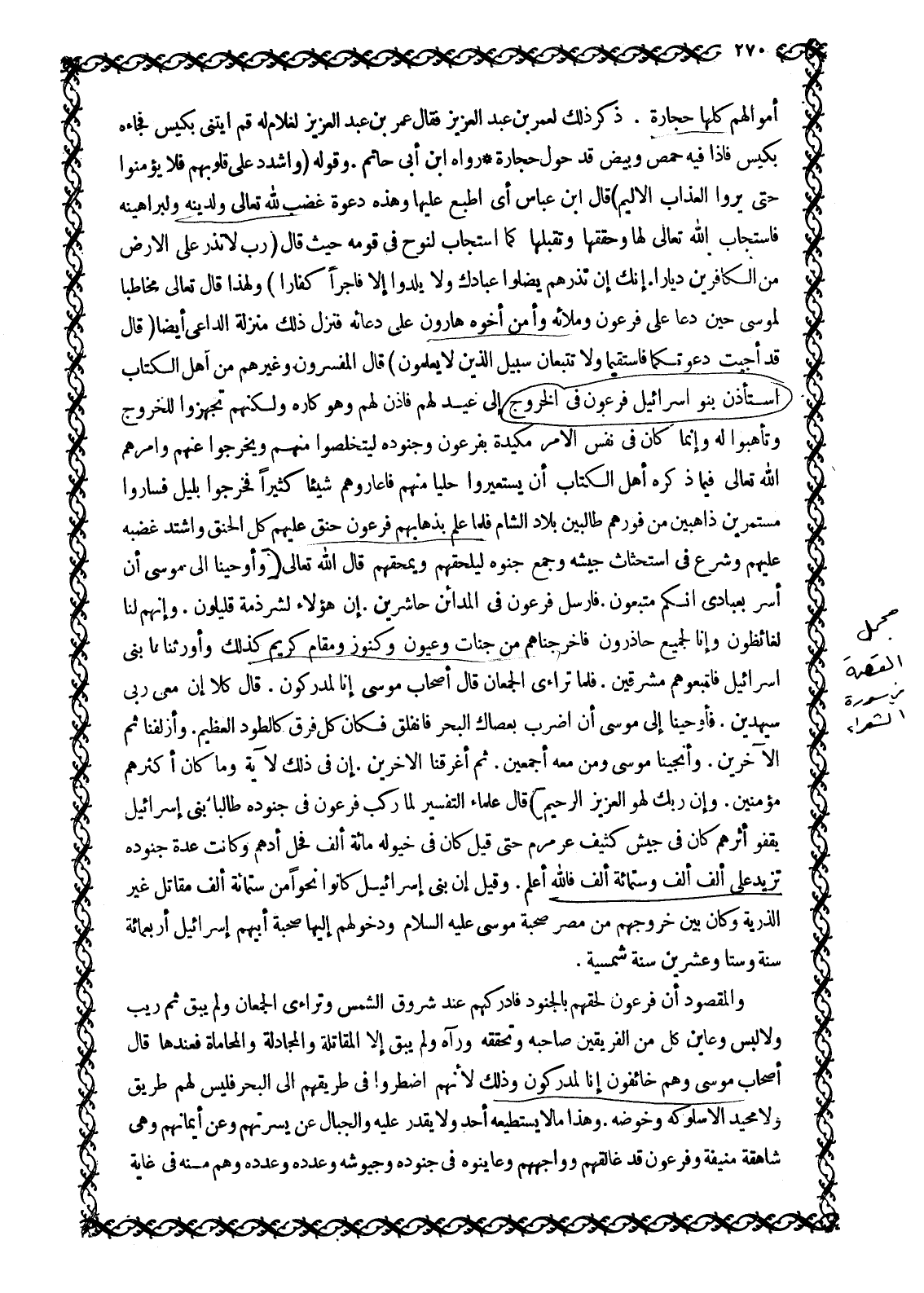 أَمْوَالُهُمْ كُلُّهَا حِجَارَةً. ذُكِرَ ذَلِكَ لِعُمَرَ بْنِ عَبْدِ الْعَزِيزِ فَقَالَ عُمَرُ بْنُ عَبْدِ الْعَزِيزِ لغلام له قم ايتني بكيس فجاءه بكيس فإذا فيه حمص وبيض قَدْ حُوِّلَ حِجَارَةً رَوَاهُ ابْنُ أَبِي حَاتِمٍ. وَقَوْلُهُ وَاشْدُدْ عَلى قُلُوبِهِمْ فَلا يُؤْمِنُوا حَتَّى يَرَوُا الْعَذابَ الْأَلِيمَ 10: 88 قَالَ ابْنُ عَبَّاسٍ أَيِ اطْبَعْ عَلَيْهَا وَهَذِهِ دَعْوَةُ غَضَبٍ للَّه تَعَالَى وَلِدِينِهِ وَلِبَرَاهِينِهِ فَاسْتَجَابَ اللَّهُ تَعَالَى لَهَا وَحَقَّقَهَا وَتَقَبَّلَهَا كَمَا اسْتَجَابَ لِنُوحٍ فِي قَوْمِهِ حَيْثُ قَالَ رَبِّ لَا تَذَرْ عَلَى الْأَرْضِ مِنَ الْكافِرِينَ دَيَّاراً. إِنَّكَ إِنْ تَذَرْهُمْ يُضِلُّوا عِبادَكَ وَلا يَلِدُوا إِلَّا فاجِراً كَفَّاراً 71: 26- 27 وَلِهَذَا قَالَ تَعَالَى مُخَاطِبًا لِمُوسَى حِينَ دَعَا عَلَى فِرْعَوْنَ وَمَلَئِهِ وَأَمَّنَ أَخُوهُ هَارُونُ عَلَى دُعَائِهِ فَنَزَلَ ذَلِكَ مَنْزِلَةَ الدَّاعِي أَيْضًا قَالَ قَدْ أُجِيبَتْ دَعْوَتُكُما فَاسْتَقِيما وَلا تَتَّبِعانِّ سَبِيلَ الَّذِينَ لا يَعْلَمُونَ 10: 89 قَالَ الْمُفَسِّرُونَ وَغَيْرُهُمْ مِنْ أَهْلِ الْكِتَابِ.