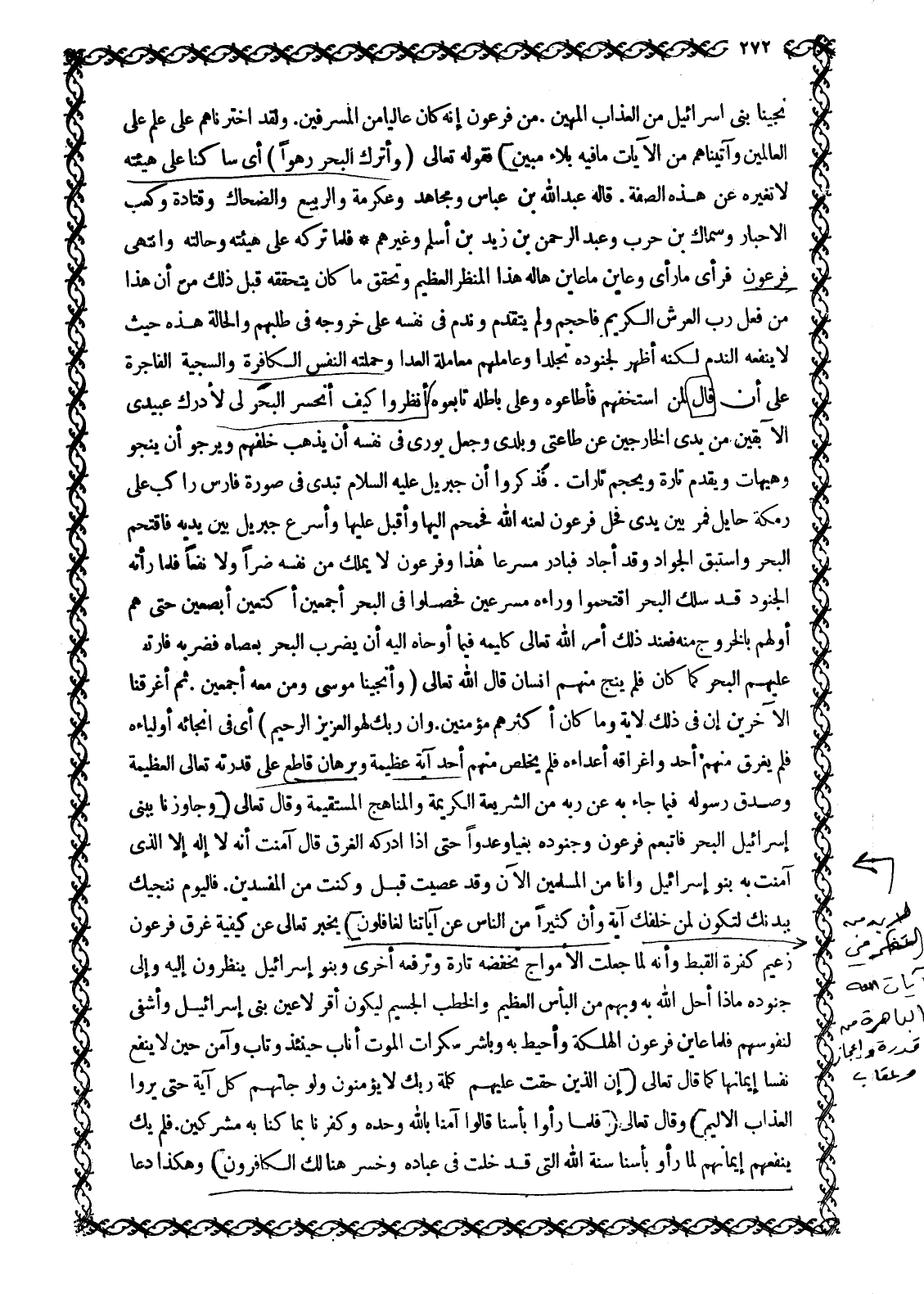 نَجَّيْنا بَنِي إِسْرائِيلَ مِنَ الْعَذابِ الْمُهِينِ. مِنْ فِرْعَوْنَ إِنَّهُ كانَ عالِياً مِنَ الْمُسْرِفِينَ. وَلَقَدِ اخْتَرْناهُمْ عَلى عِلْمٍ عَلَى الْعالَمِينَ وَآتَيْناهُمْ مِنَ الْآياتِ ما فِيهِ بَلؤُا مُبِينٌ 44: 17- 33 فقوله تعالى وَاتْرُكِ الْبَحْرَ رَهْواً 44: 24 أَيْ سَاكِنًا عَلَى هَيْئَتِهِ لَا تُغَيِّرْهُ عَنْ هَذِهِ الصِّفَةِ. قَالَهُ عَبْدُ اللَّهِ بْنُ عَبَّاسٍ وَمُجَاهِدٌ وَعِكْرِمَةُ وَالرَّبِيعُ وَالضَّحَّاكُ وَقَتَادَةُ وَكَعْبُ الْأَحْبَارِ وَسِمَاكُ بْنُ حَرْبٍ وَعَبْدُ الرَّحْمَنِ بْنُ زَيْدِ بْنِ أَسْلَمَ وَغَيْرُهُمْ فَلَمَّا تَرَكَهُ عَلَى هَيْئَتِهِ وَحَالَتِهِ وَانْتَهَى فِرْعَوْنُ فَرَأَى مَا رَأَى وَعَايَنَ مَا عَايَنَ هَالَهُ هَذَا الْمَنْظَرُ الْعَظِيمُ وَتَحَقَّقَ مَا كَانَ يَتَحَقَّقُهُ قَبْلَ ذَلِكَ مِنْ أَنَّ هَذَا مِنْ فِعْلِ رَبِّ الْعَرْشِ الْكَرِيمِ فَأَحْجَمَ وَلَمْ يَتَقَدَّمْ وَنَدِمَ فِي نَفْسِهِ عَلَى خُرُوجِهِ فِي طَلَبِهِمْ وَالْحَالَةُ هَذِهِ حَيْثُ لَا يَنْفَعُهُ النَّدَمُ لَكِنَّهُ أَظْهَرَ لِجُنُودِهِ تَجَلُّدًا وَعَامَلَهُمْ مُعَامَلَةَ الْعِدَا وَحَمَلَتْهُ النَّفْسُ الْكَافِرَةُ وَالسَّجِيَّةُ الْفَاجِرَةُ عَلَى أَنْ قَالَ لِمَنِ اسْتَخَفَّهُمْ فَأَطَاعُوهُ وَعَلَى بَاطِلِهِ تَابَعُوهُ انْظُرُوا كَيْفَ انْحَسَرَ الْبَحْرُ لِي لِأُدْرِكَ عَبِيدِي الْآبِقِينَ مِنْ يَدِي الْخَارِجِينَ عَنْ طَاعَتِي وَبَلَدِي وَجَعَلَ يُورِي فِي نَفْسِهِ أَنْ يَذْهَبَ خَلْفَهُمْ وَيَرْجُو أَنْ يَنْجُوَ وَهَيْهَاتَ وَيُقْدِمُ تَارَةً وَيُحْجِمُ تَارَاتٍ. فَذَكَرُوا أَنَّ جِبْرِيلَ عَلَيْهِ السَّلَامُ تَبَدَّى فِي صُورَةِ فَارِسٍ رَاكِبٍ عَلَى رَمَكَةِ حايل فَمَرَّ بَيْنَ يَدَيْ فَحْلِ فِرْعَوْنَ لَعَنَهُ اللَّهُ فَحَمْحَمَ إِلَيْهَا وَأَقْبَلَ عَلَيْهَا وَأَسْرَعَ جِبْرِيلُ بَيْنَ يَدَيْهِ فَاقْتَحَمَ الْبَحْرَ وَاسْتَبَقَ الْجَوَادَ وَقَدْ أَجَادَ فَبَادَرَ مُسْرِعًا هَذَا وَفِرْعَوْنُ لَا يَمْلِكُ مِنْ نفسه ضَرًّا وَلَا نَفْعًا فَلَمَّا رَأَتْهُ الْجُنُودُ قَدْ سَلَكَ الْبَحْرَ اقْتَحَمُوا وَرَاءَهُ مُسْرِعِينَ فَحَصَلُوا فِي الْبَحْرِ أَجْمَعِينَ أَكْتَعِينَ أَبْصَعِينَ حَتَّى هَمَّ أَوَّلُهُمْ بِالْخُرُوجِ مِنْهُ فَعِنْدَ ذَلِكَ أَمَرَ اللَّهُ تَعَالَى كليمه فِيمَا أَوْحَاهُ إِلَيْهِ أَنْ يَضْرِبَ الْبَحْرَ بِعَصَاهُ فَضَرَبَهُ فَارْتَطَمَ عَلَيْهِمُ الْبَحْرُ كَمَا كَانَ فَلَمْ يَنْجُ مِنْهُمْ إِنْسَانٌ قَالَ اللَّهُ تَعَالَى وَأَنْجَيْنا مُوسى وَمن مَعَهُ أَجْمَعِينَ. ثُمَّ أَغْرَقْنَا الْآخَرِينَ إِنَّ فِي ذلِكَ لَآيَةً وَما كانَ أَكْثَرُهُمْ مُؤْمِنِينَ. وَإِنَّ رَبَّكَ لَهُوَ الْعَزِيزُ الرَّحِيمُ 26: 65- 68 أَيْ فِي إِنْجَائِهِ أَوْلِيَاءَهُ فَلَمْ يَغْرَقْ مِنْهُمْ أَحَدٌ وَإِغْرَاقِهِ أَعْدَاءَهُ فَلَمْ يَخْلُصْ مِنْهُمْ أَحَدٌ آيَةٌ عَظِيمَةٌ وَبُرْهَانٌ قَاطِعٌ عَلَى قُدْرَتِهِ تَعَالَى الْعَظِيمَةِ وَصِدْقِ رَسُولِهِ فِيمَا جَاءَ بِهِ عَنْ رَبِّهِ مِنَ الشَّرِيعَةِ الْكَرِيمَةِ وَالْمَنَاهِجِ الْمُسْتَقِيمَةِ وَقَالَ تَعَالَى وَجاوَزْنا بِبَنِي إِسْرائِيلَ الْبَحْرَ فَأَتْبَعَهُمْ فِرْعَوْنُ وَجُنُودُهُ بَغْياً وَعَدْواً حَتَّى إِذا أَدْرَكَهُ الْغَرَقُ قَالَ آمَنْتُ أَنَّهُ لَا إِلهَ إِلَّا الَّذِي آمَنَتْ به بَنُوا إِسْرائِيلَ وَأَنَا مِنَ الْمُسْلِمِينَ آلْآنَ وَقَدْ عَصَيْتَ قَبْلُ وَكُنْتَ مِنَ الْمُفْسِدِينَ. فَالْيَوْمَ نُنَجِّيكَ بِبَدَنِكَ لِتَكُونَ لِمَنْ خَلْفَكَ آيَةً وَإِنَّ كَثِيراً مِنَ النَّاسِ عَنْ آياتِنا لَغافِلُونَ 10: 90- 92 يُخْبِرُ تَعَالَى عَنْ كَيْفِيَّةِ غَرَقِ فِرْعَوْ
